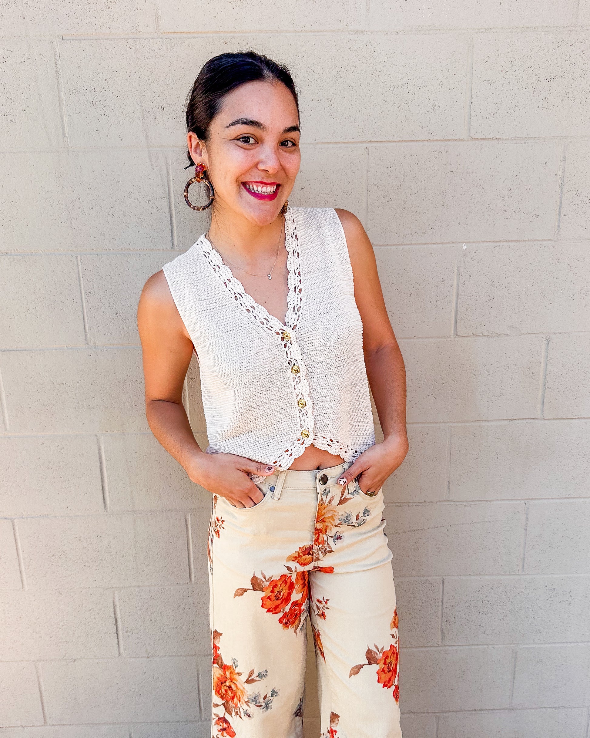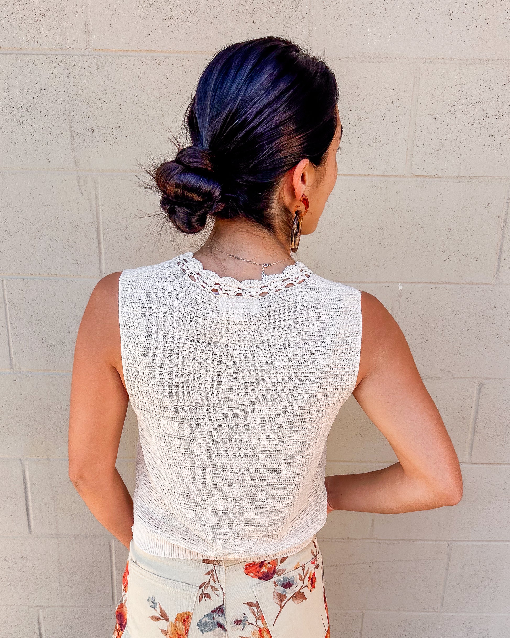 Layer effortlessly with this charming tank vest. Featuring delicate crochet trim along the button-down front, it adds a touch of handmade elegance to any outfit. Perfect for pairing over tees or dresses, this versatile piece transitions seamlessly from casual to polished looks.