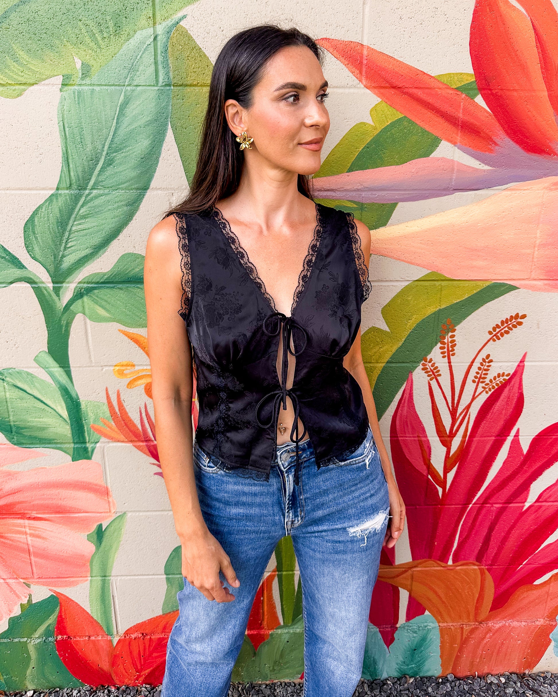 The Analisa Top in black features delicate lace trim and a charming tie-front design, offering a gentle touch of femininity to your wardrobe. Its soft fabric and relaxed fit create a comfortable, effortless look perfect for everyday wear. This top complements casual outfits with subtle elegance, making it a versatile addition to your collection.
