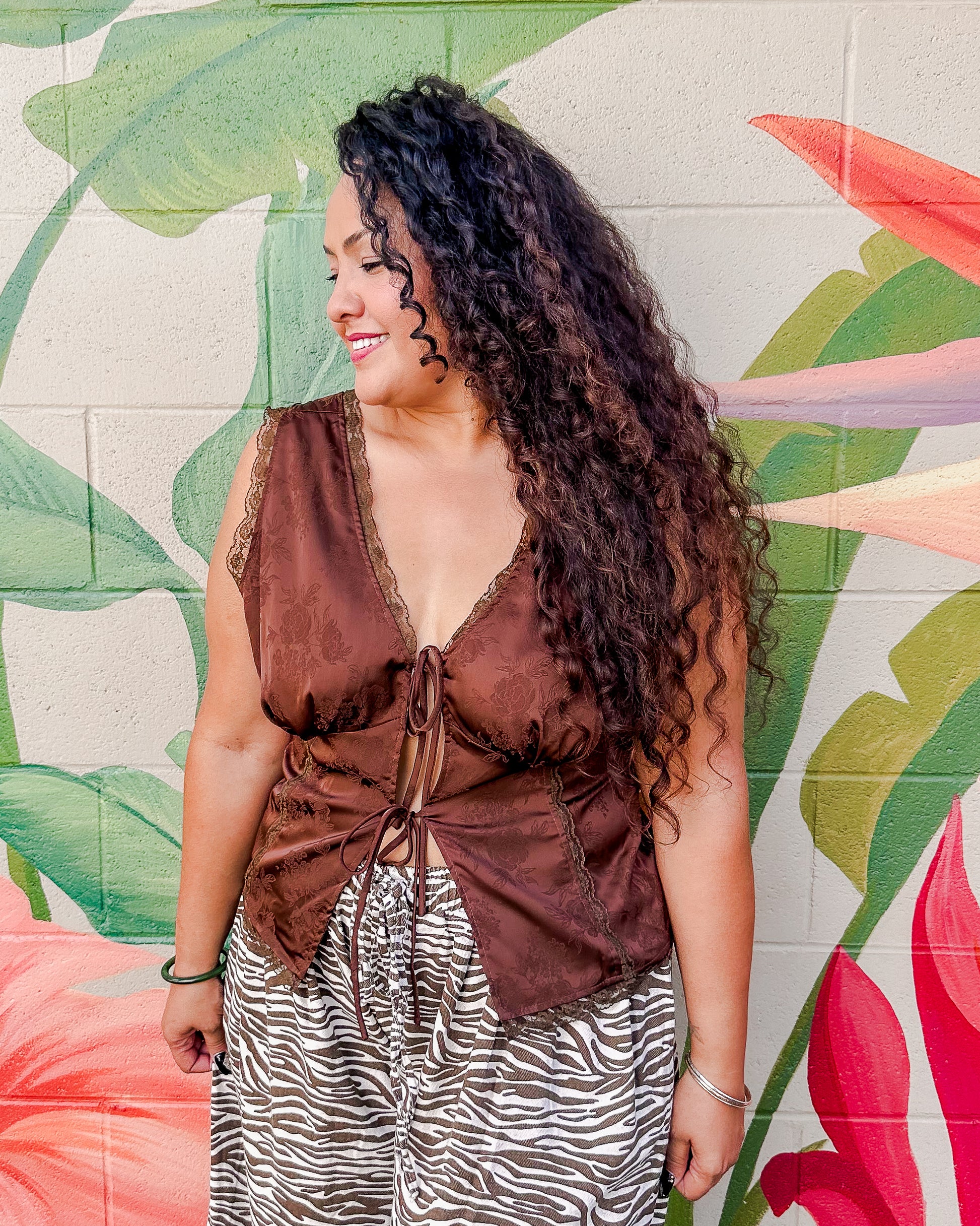 The Analisa Top in brown features delicate lace trim and a charming tie-front design, offering a gentle touch of femininity to your wardrobe. Its soft fabric and relaxed fit create a comfortable, effortless look perfect for everyday wear. This top complements casual outfits with subtle elegance, making it a versatile addition to your collection.