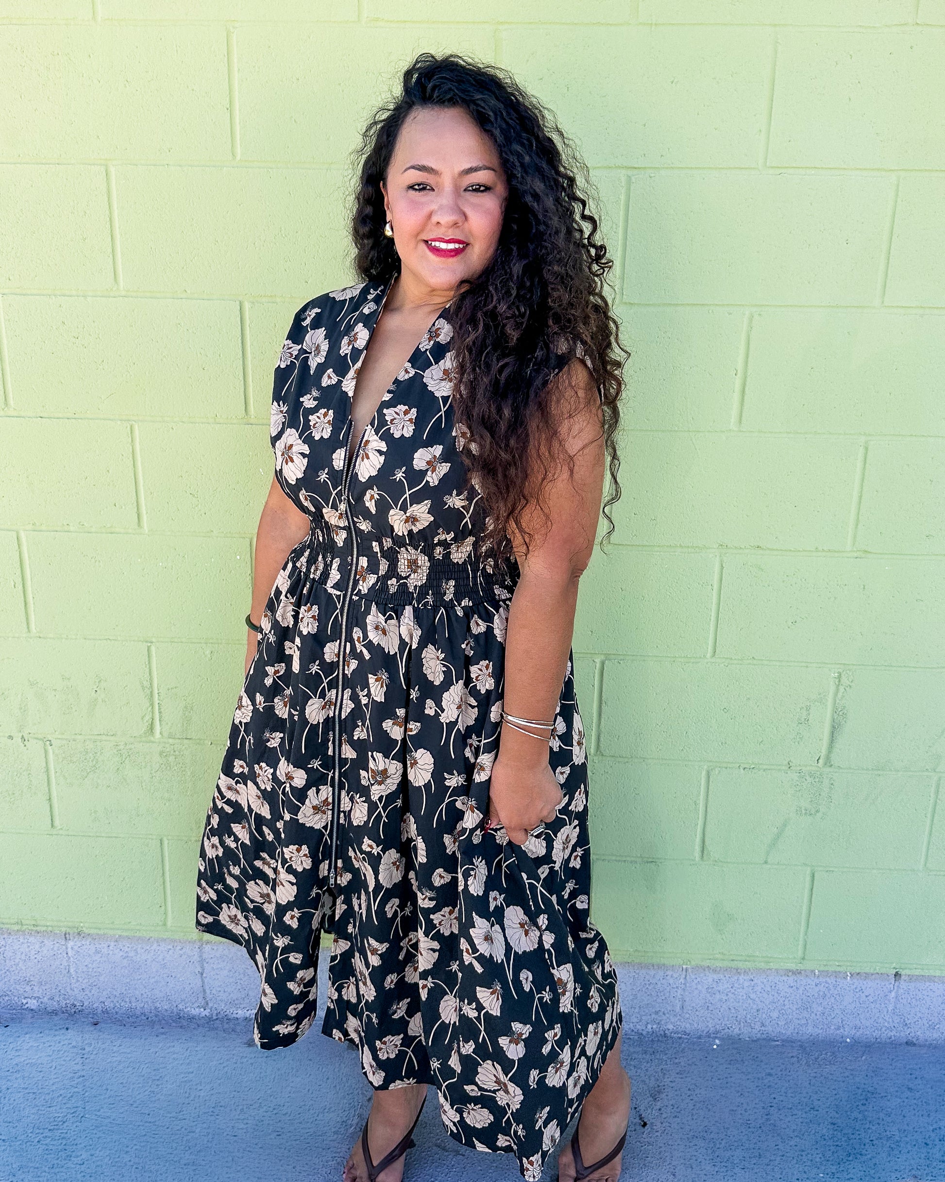 The Anya Dress effortlessly combines comfort with understated elegance. Featuring a relaxed drop shoulder silhouette and a gently smocked waist that defines your shape, this midi dress moves with you throughout your day. The front zip closure offers easy styling, while the printed design adds visual interest without overwhelming. Practical pockets keep your essentials close, making this piece as functional as it is beautiful. Perfect for layering or wearing solo, the Anya is a versatile wardrobe essential that feels as good as it looks.