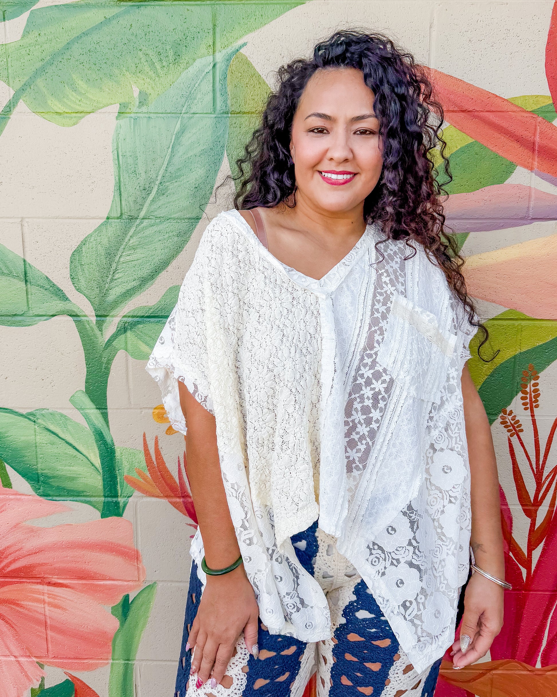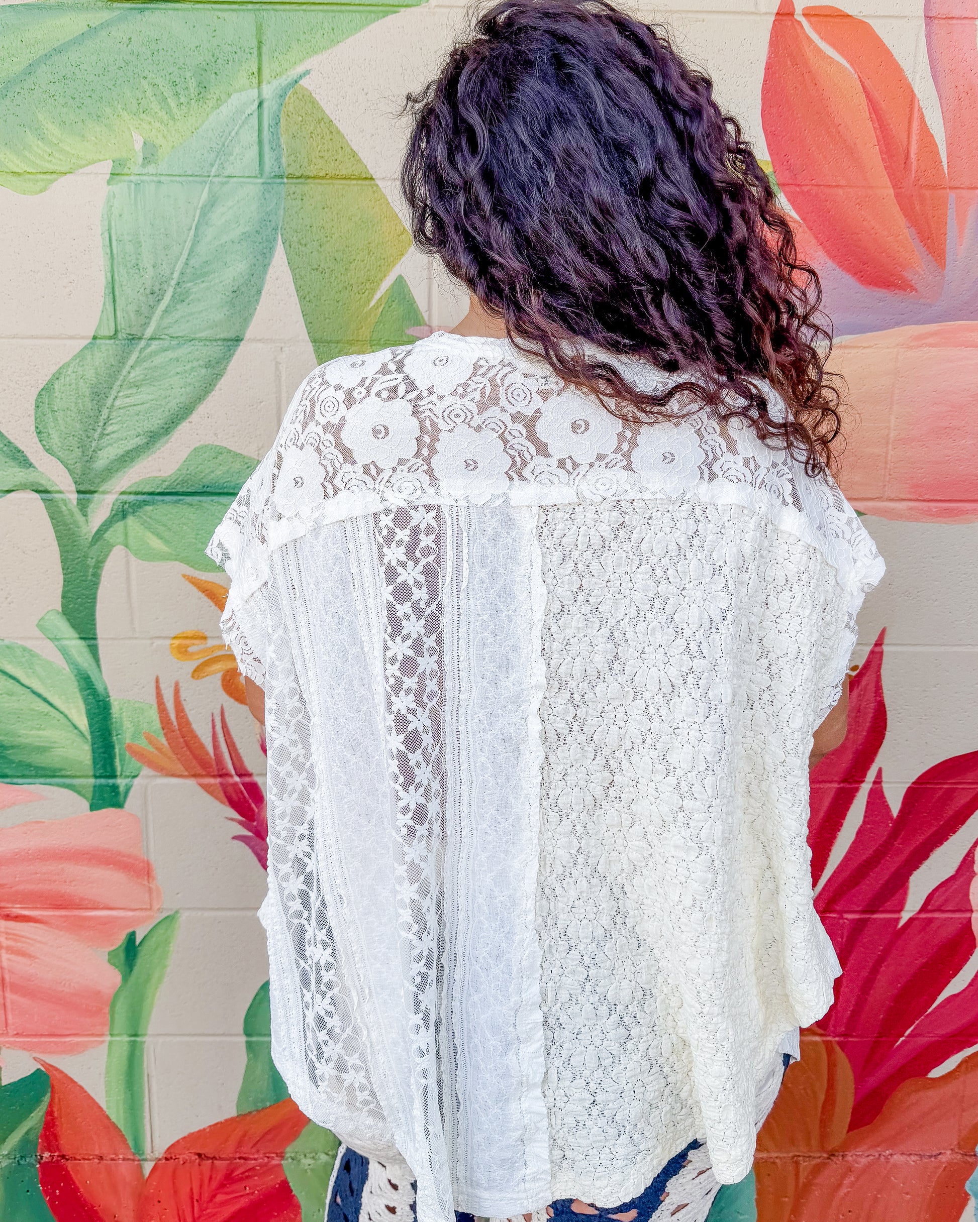 The Arelio Top features a relaxed, oversized silhouette with a flattering V-neck and sleeveless design. Crafted in delicate lace with raw edge detailing and a solid pointed pattern, this piece effortlessly layers over basics or stands alone for an elevated look. Perfect for warm weather styling.
