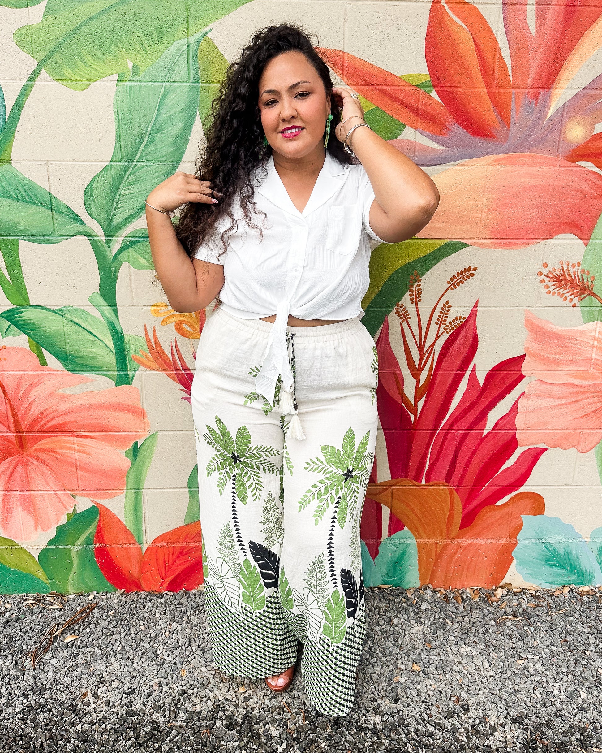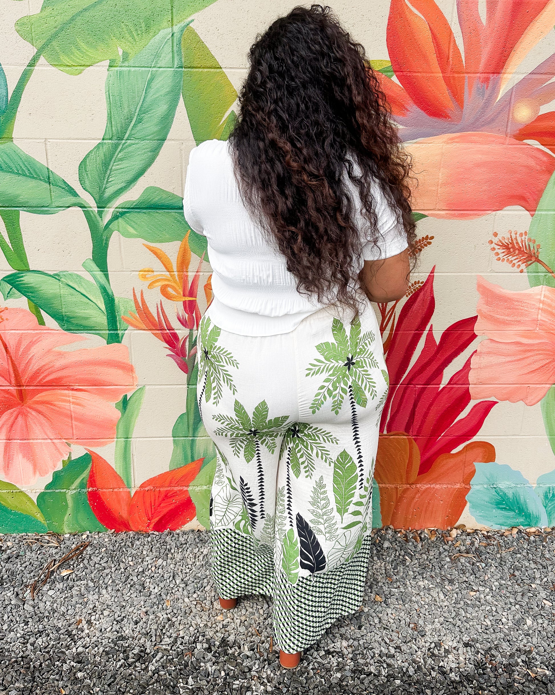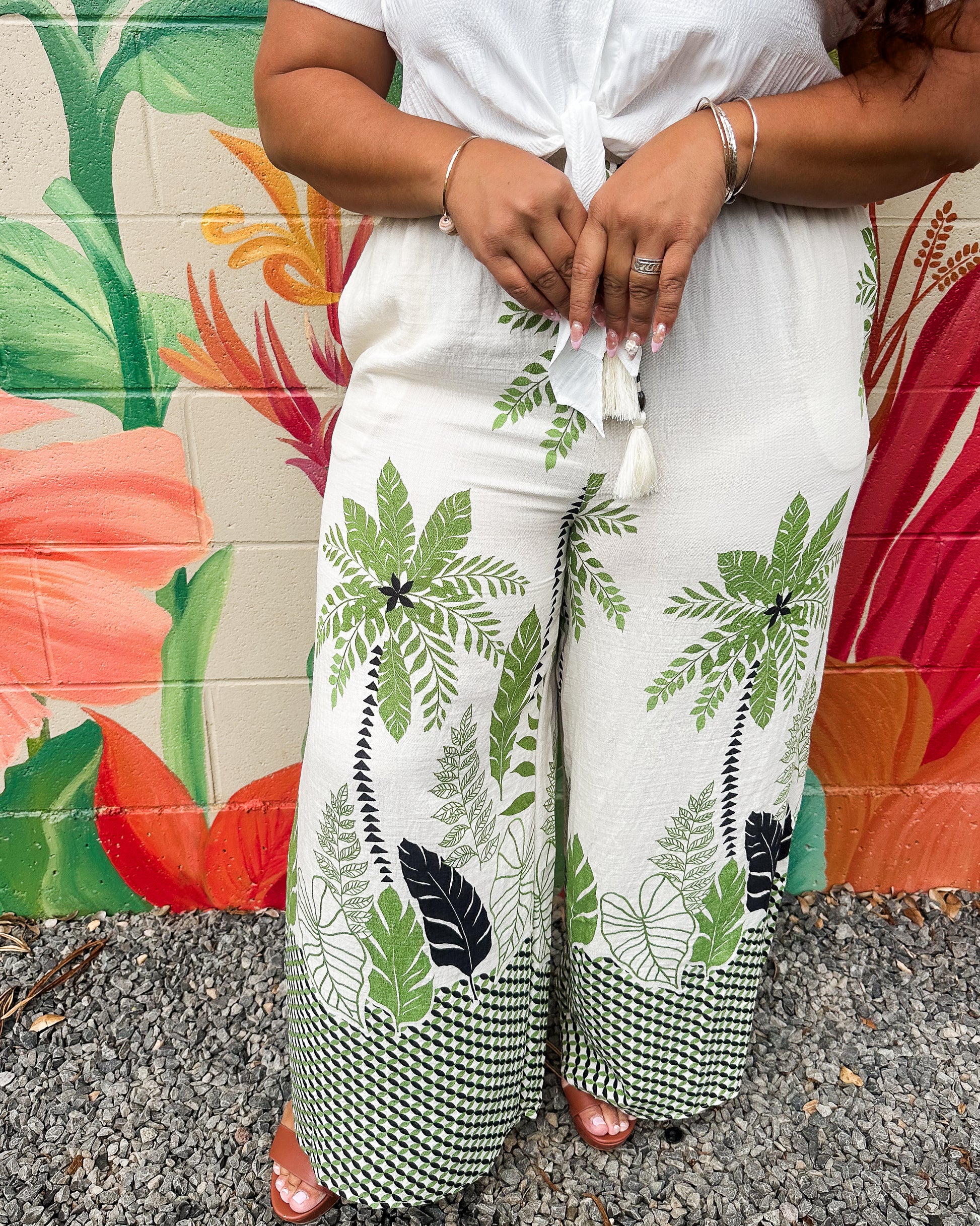 Experience effortless comfort with the Ashley Pants, featuring a relaxed wide-leg silhouette adorned with a subtle palm tree print. These pants offer a breezy, laid-back style perfect for warm days, combining softness and flow for all-day ease. Ideal for casual outings or lounging, they bring a touch of tropical calm to your wardrobe.
