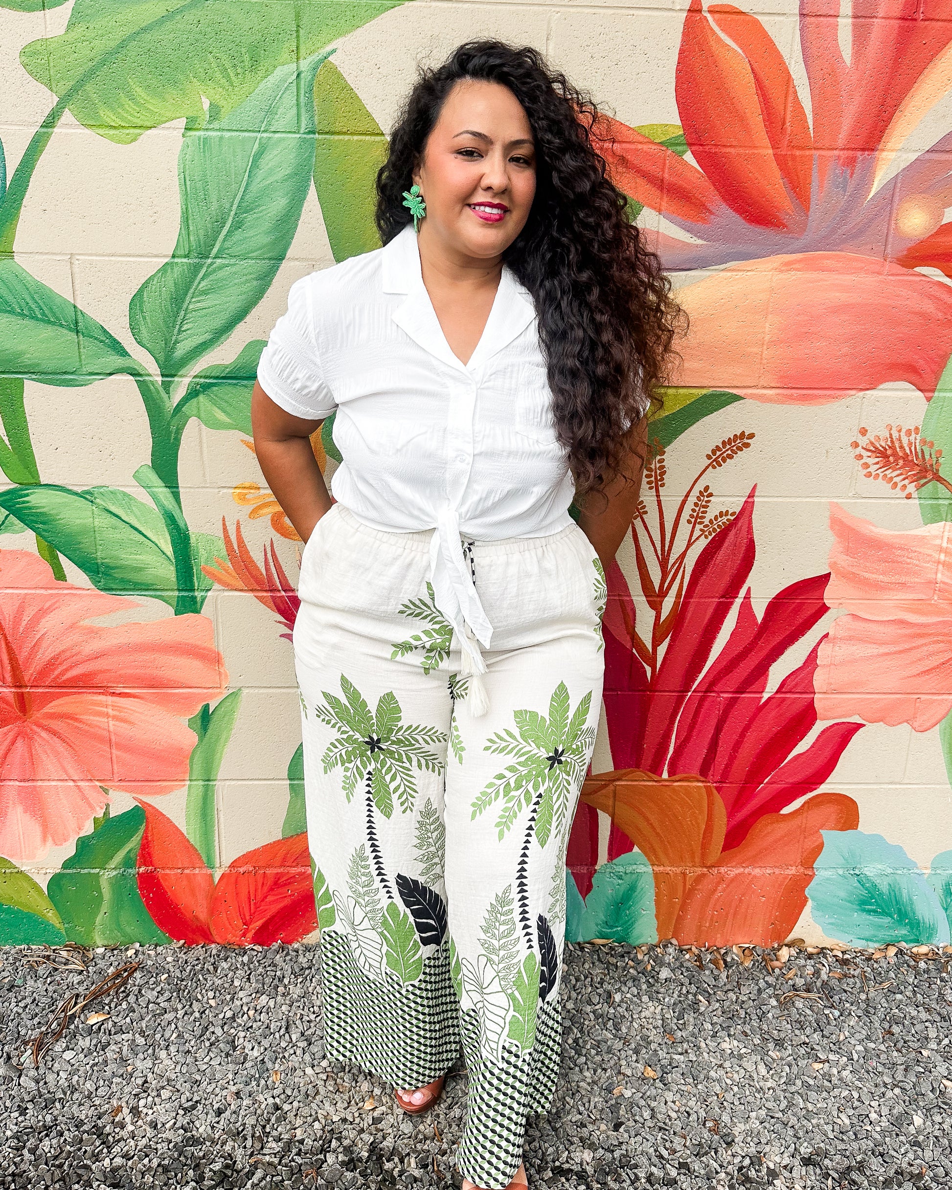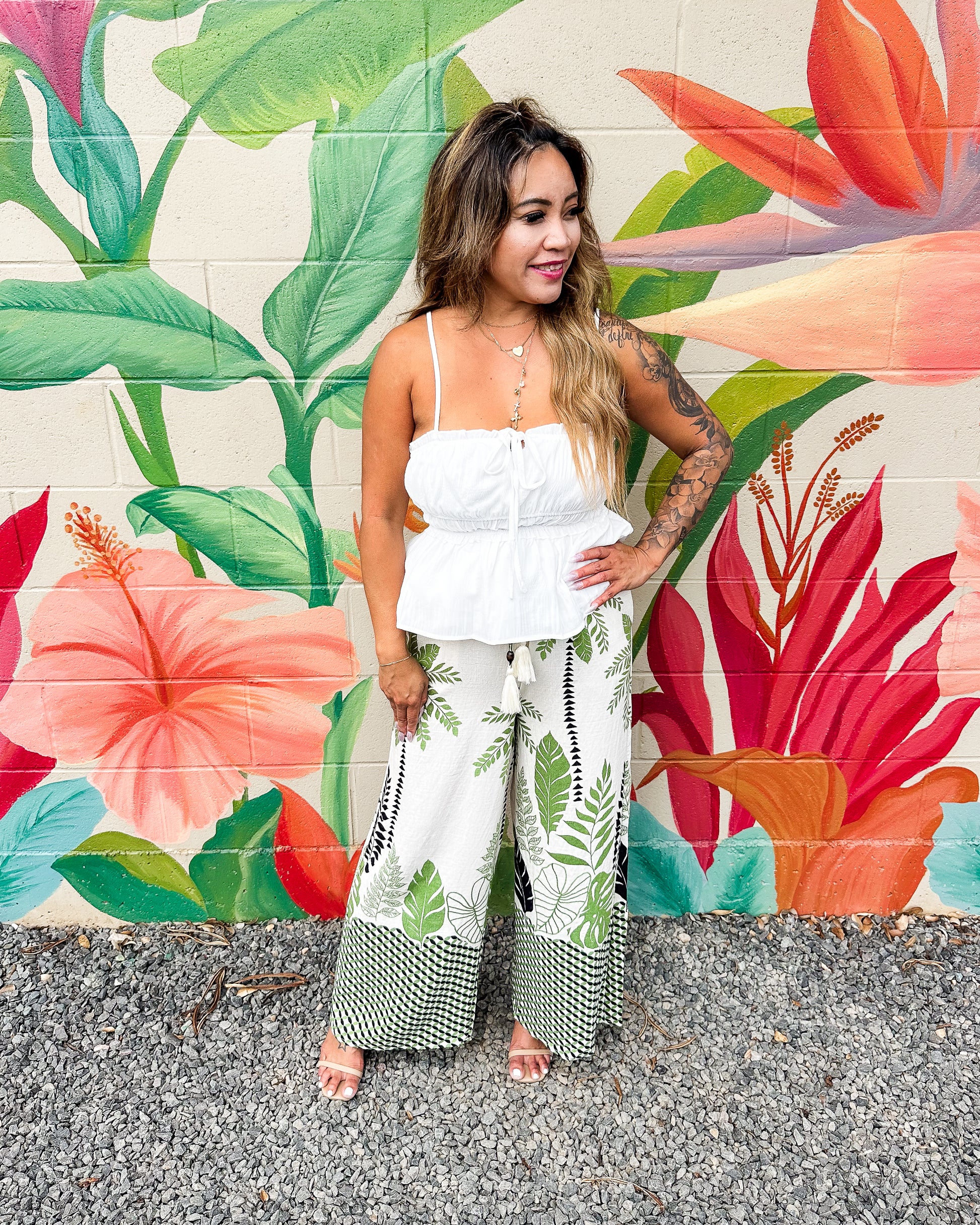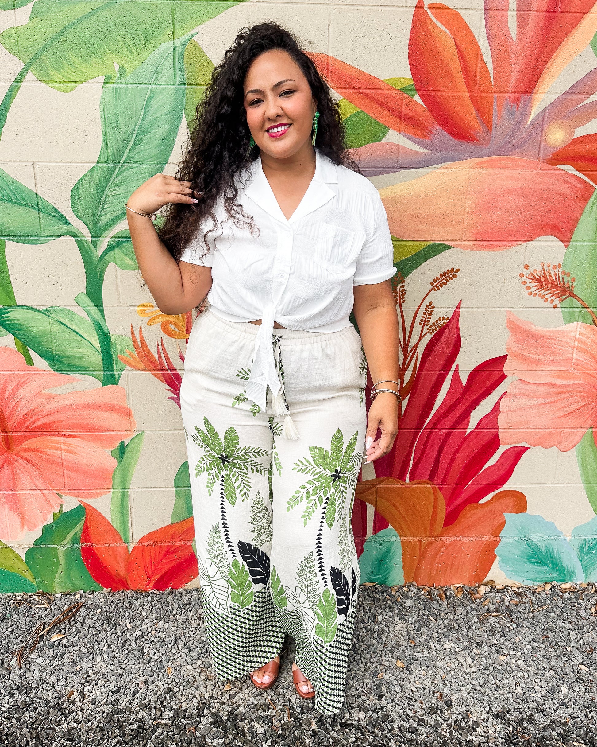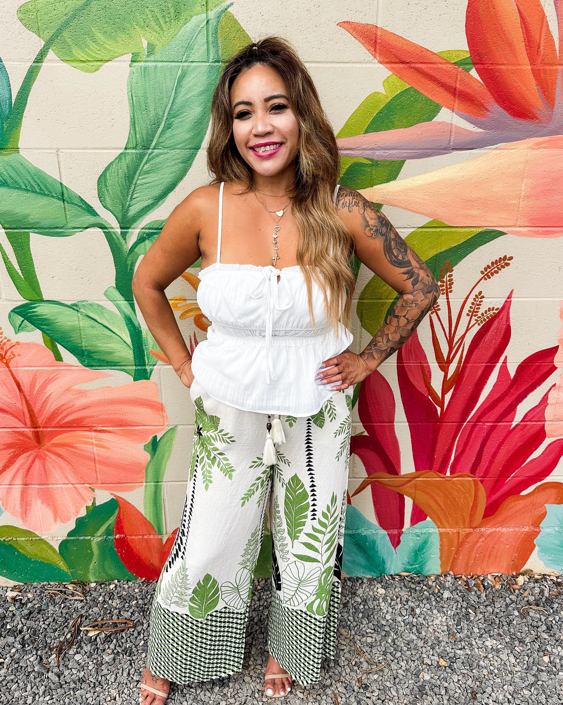 Experience effortless comfort with the Ashley Pants, featuring a relaxed wide-leg silhouette adorned with a subtle palm tree print. These pants offer a breezy, laid-back style perfect for warm days, combining softness and flow for all-day ease. Ideal for casual outings or lounging, they bring a touch of tropical calm to your wardrobe.