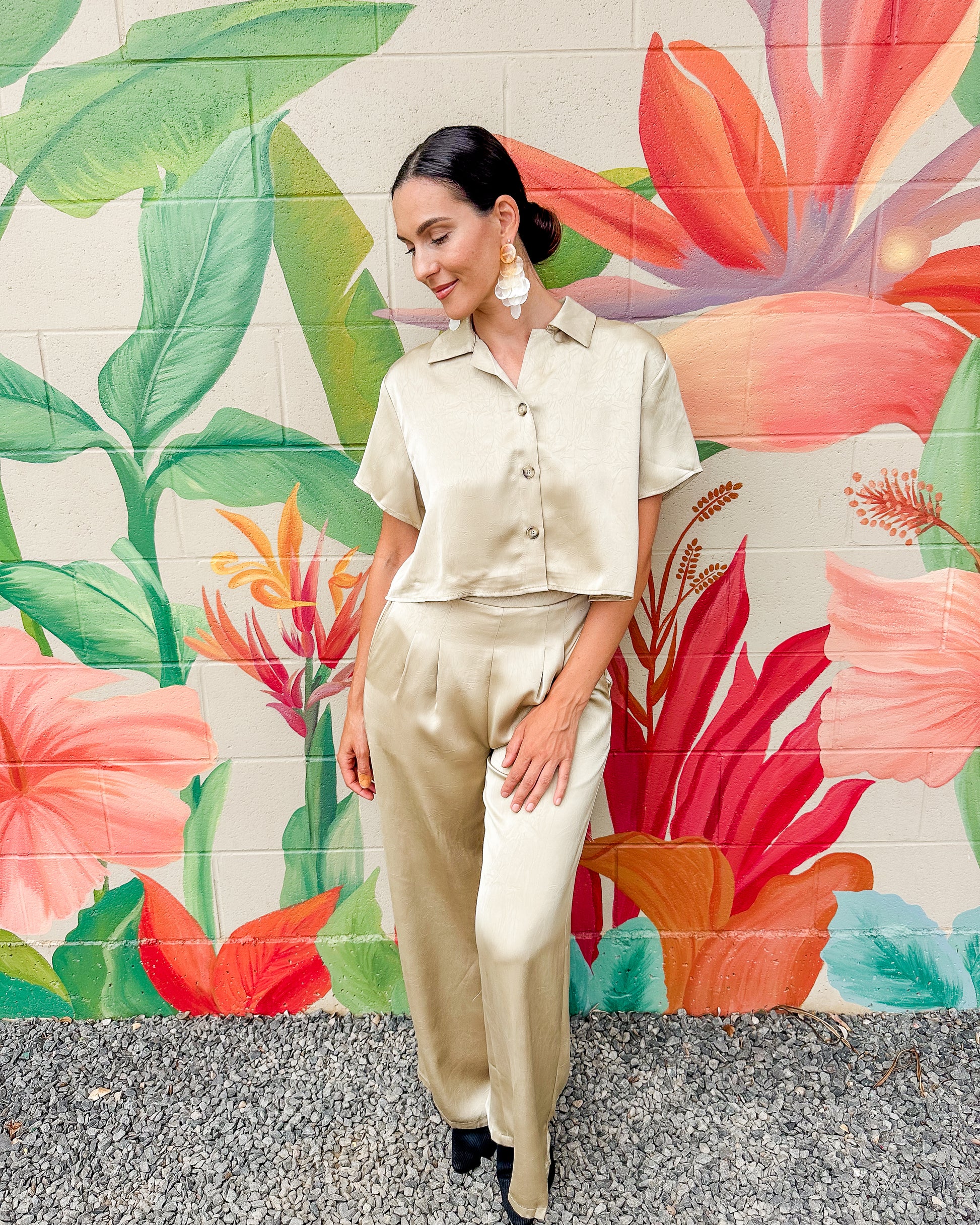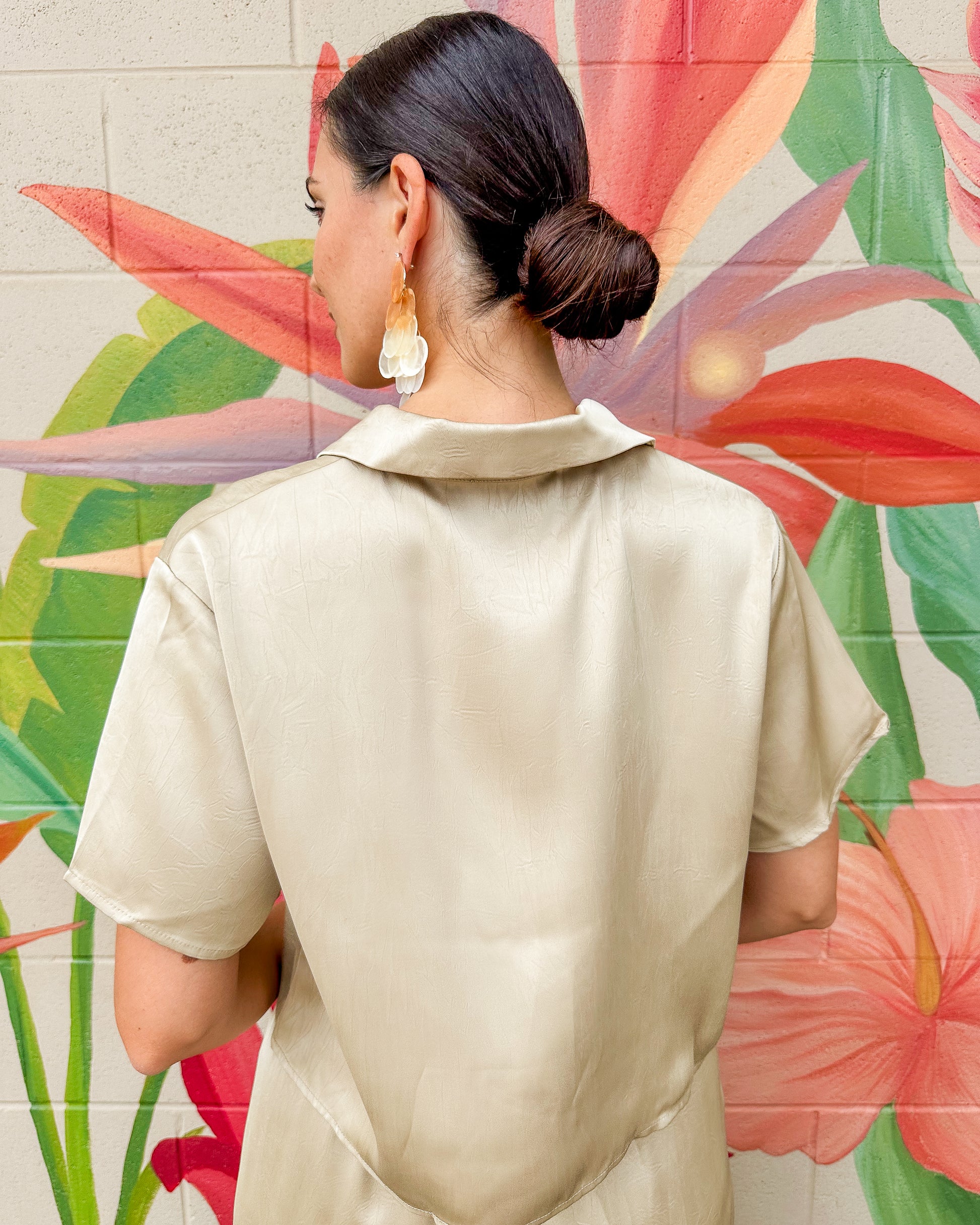 The Atlas Top features a smooth satin fabric that adds a subtle sheen to its short sleeve design. Lightweight and soft, this top offers a gentle drape for a relaxed yet elegant look. Ideal for both casual and dressier occasions, it combines comfort with a refined touch.