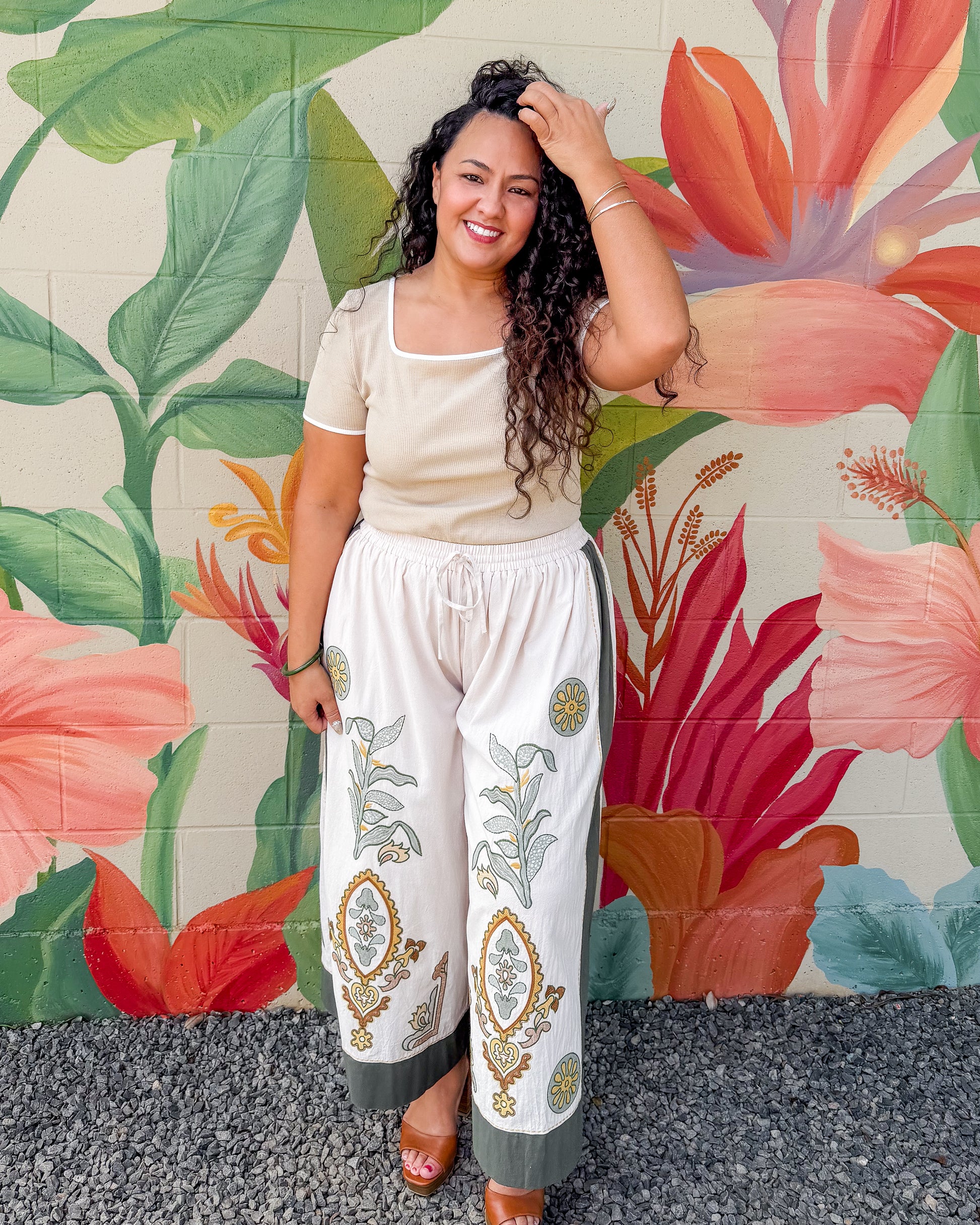 The Augusta Pants feature a comfortable elastic waist and flowing wide-leg silhouette perfect for all-day wear. Delicate embroidery detailing adds a touch of elegance to this versatile piece. Ideal for casual outings or relaxed gatherings, these pants offer both style and ease of movement.