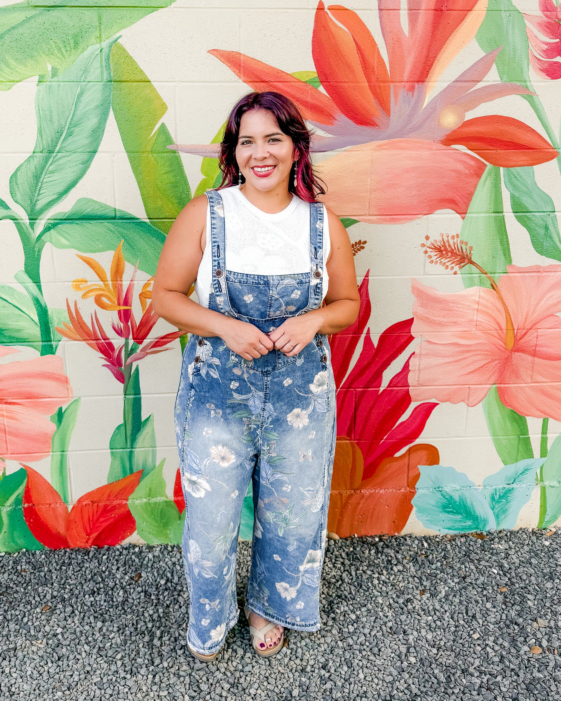 Flower-printed washed denim overalls with a relaxed, loose-fit silhouette and cropped length. Features a front bib pocket, side button closure, large back patch pockets, and adjustable shoulder straps with button fastening. Perfect for casual, effortless style.