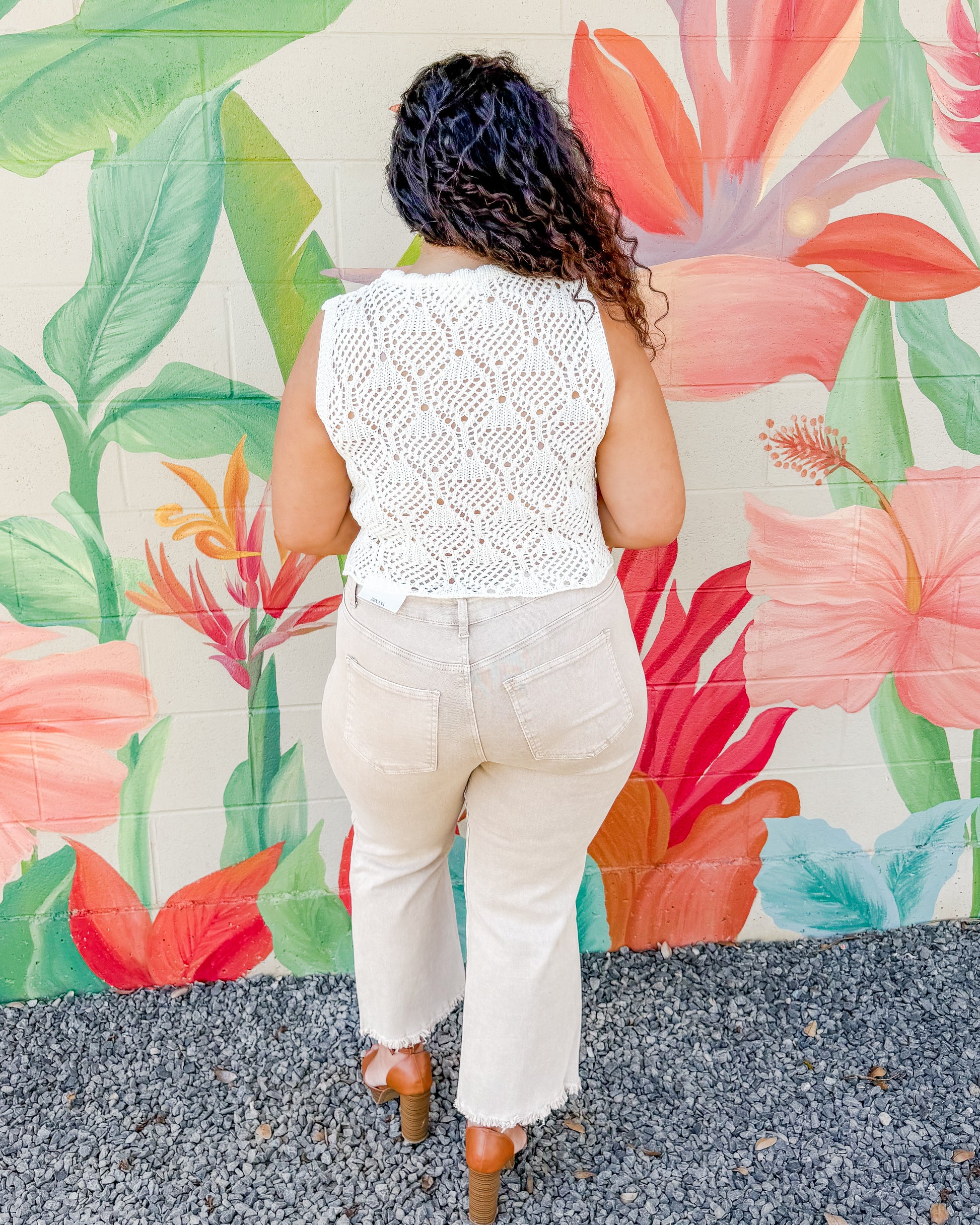 Acid-washed taupe bootcut jeans with a high waist and frayed hem. Crafted with excellent stretch for all-day comfort and movement. The perfect vintage-inspired staple for any wardrobe.