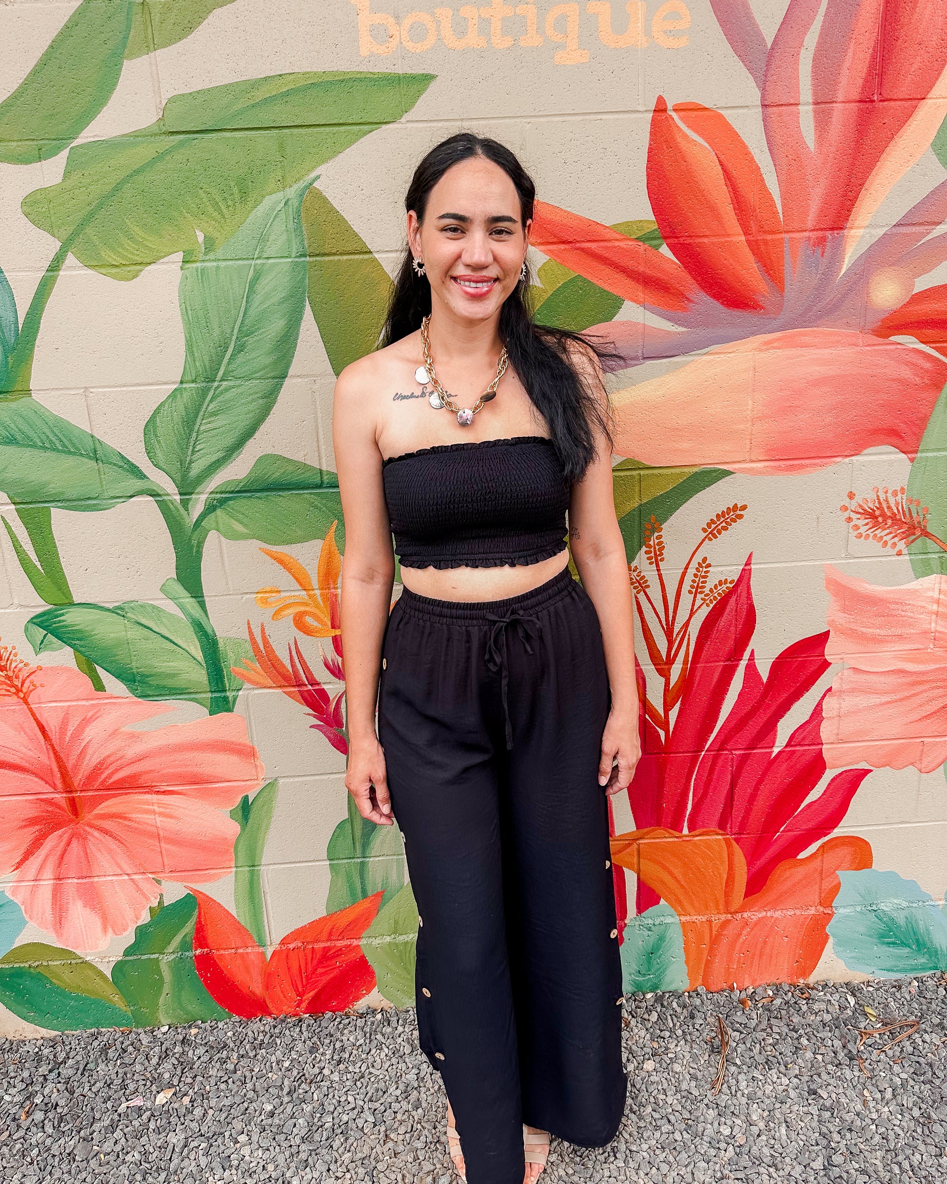 Blanche Pants offer a stylish and comfortable wide-leg fit, perfect for everyday wear. Featuring non-functioning buttons on the side, these pants maintain a clean and minimalist look while adding a charming detail. Ideal for pairing with casual or dressy tops, they combine ease and effortless style in one versatile piece.