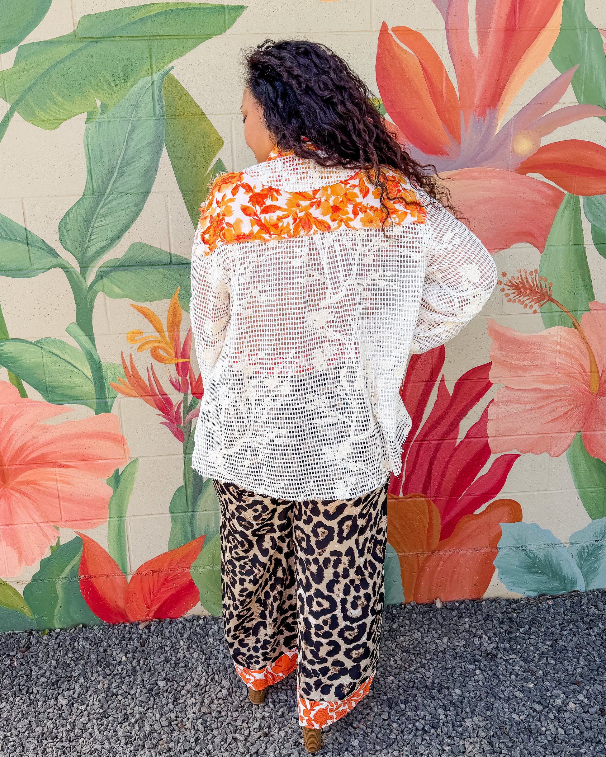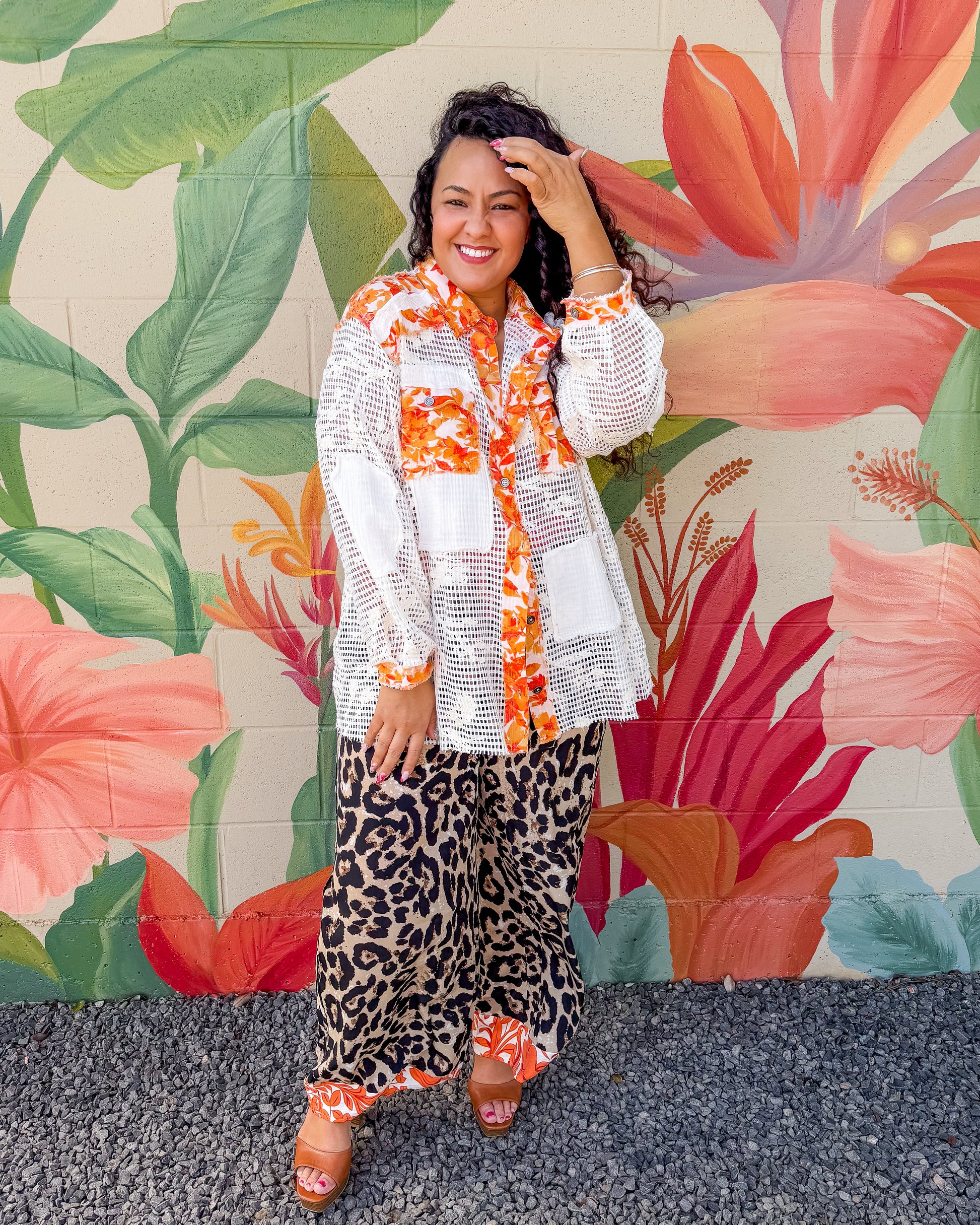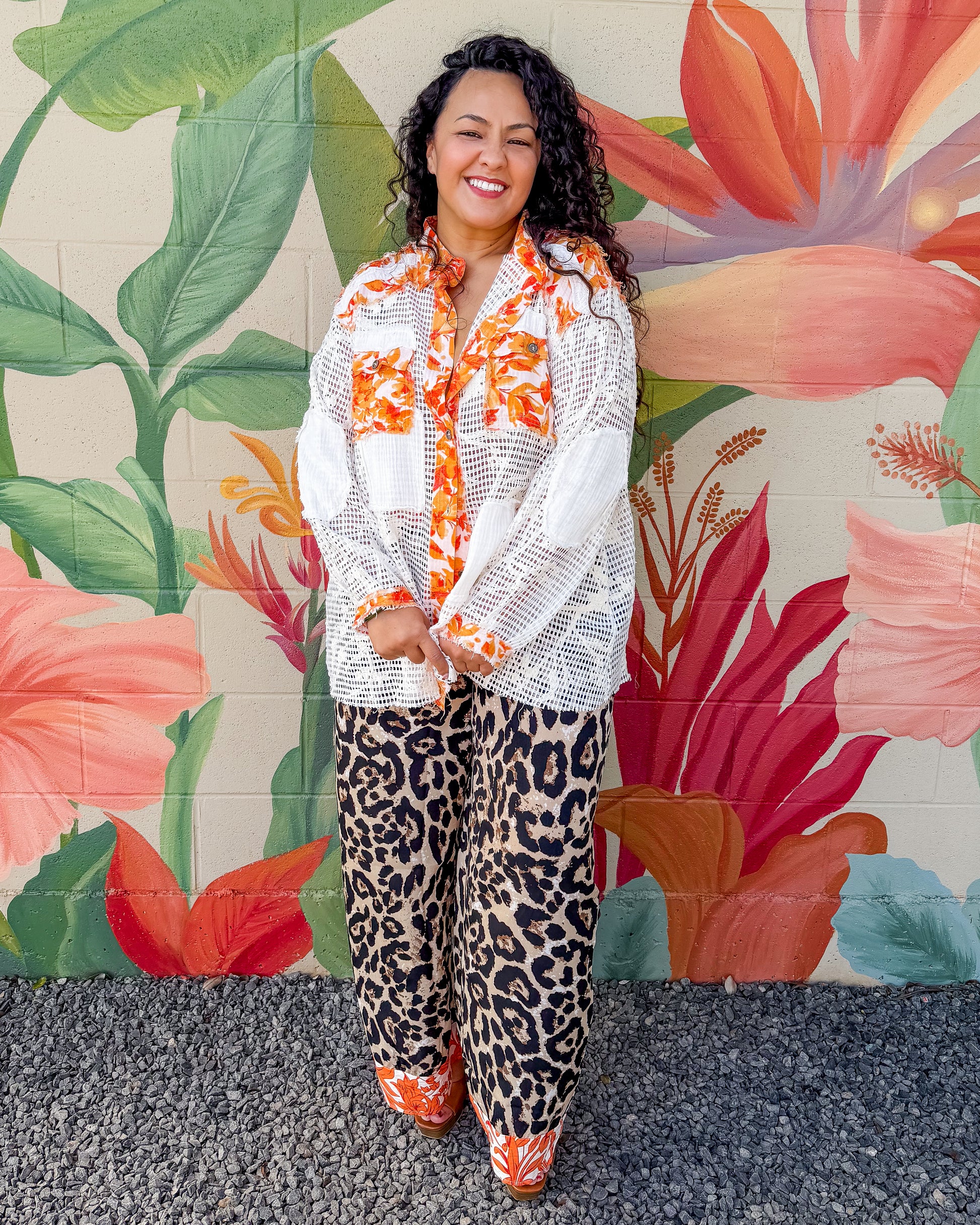 Callahan Pants feature a bold animal print design with an eye-catching orange floral contrast band along the waistline. The wide-leg silhouette offers a relaxed, flattering fit that works for both casual outings and dressed-up occasions. Perfect for adding personality to your everyday wardrobe.