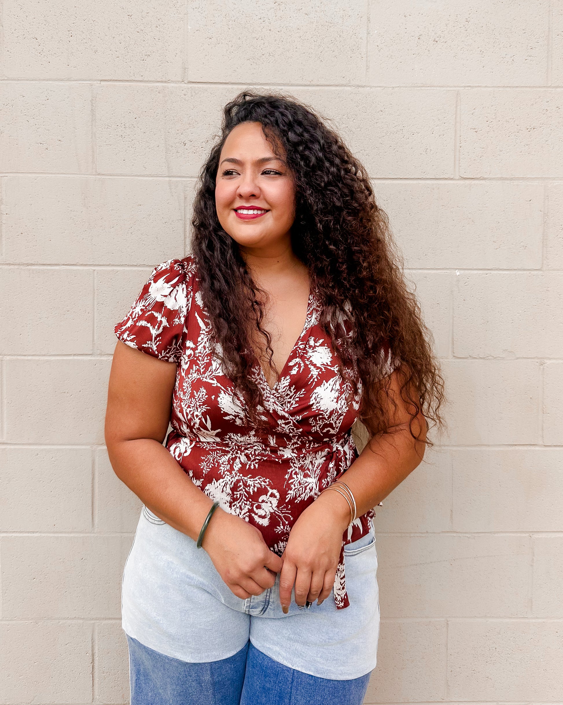 The Carmen Blouse features a delicate foliage print, short sleeves, and a flattering peplum detail that adds a touch of elegance. Its faux wrap sash gently cinches the waist, creating a graceful silhouette perfect for both casual and dressy occasions. Soft and comfortable, this blouse offers timeless style with a calm, effortless vibe.