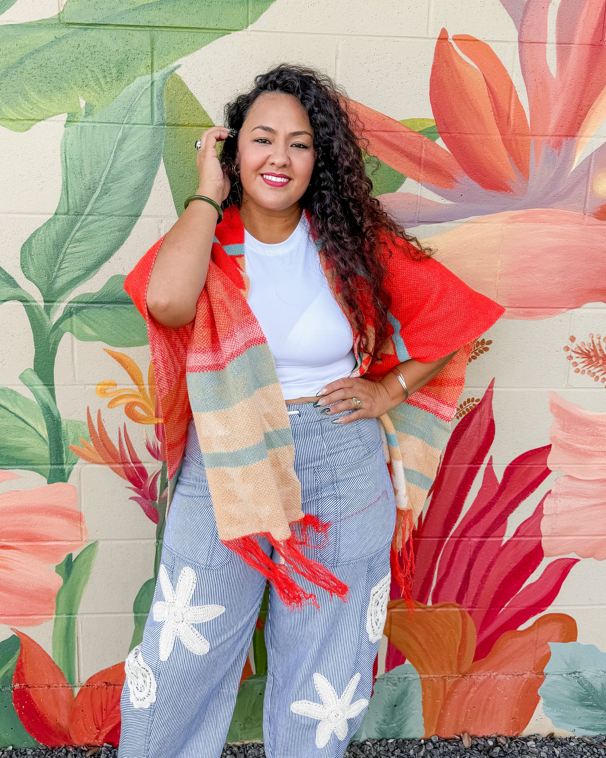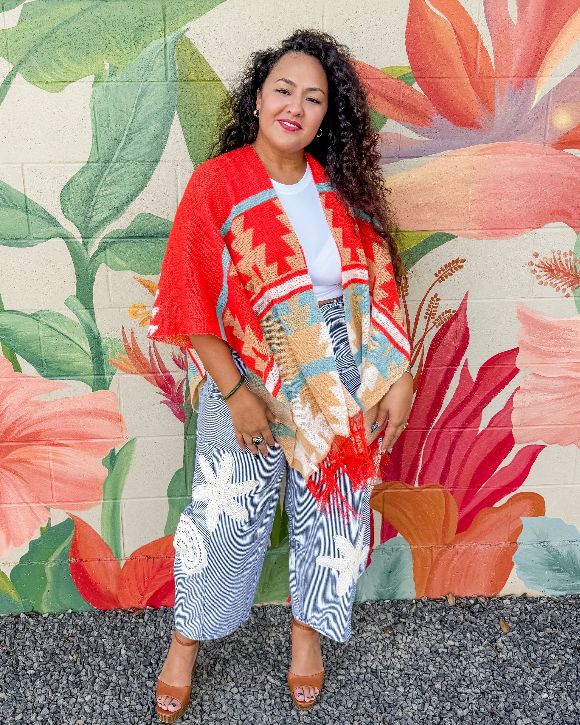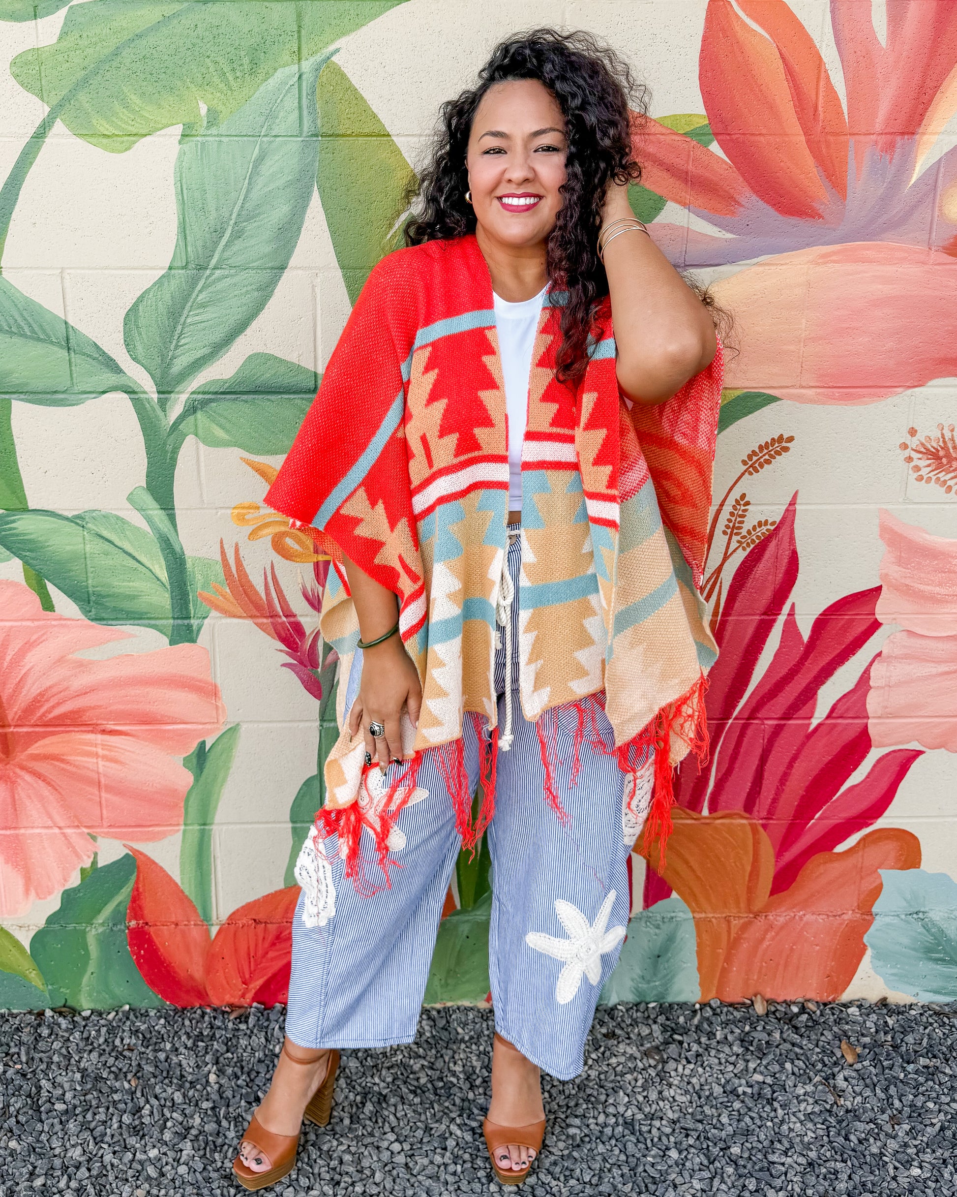 The Carson Shawl features a timeless vintage pattern with an open front design and flowing long sleeves. Finished with delicate fringe detailing, this versatile piece layers beautifully over any outfit. Perfect for adding warmth and effortless style to your everyday look.
