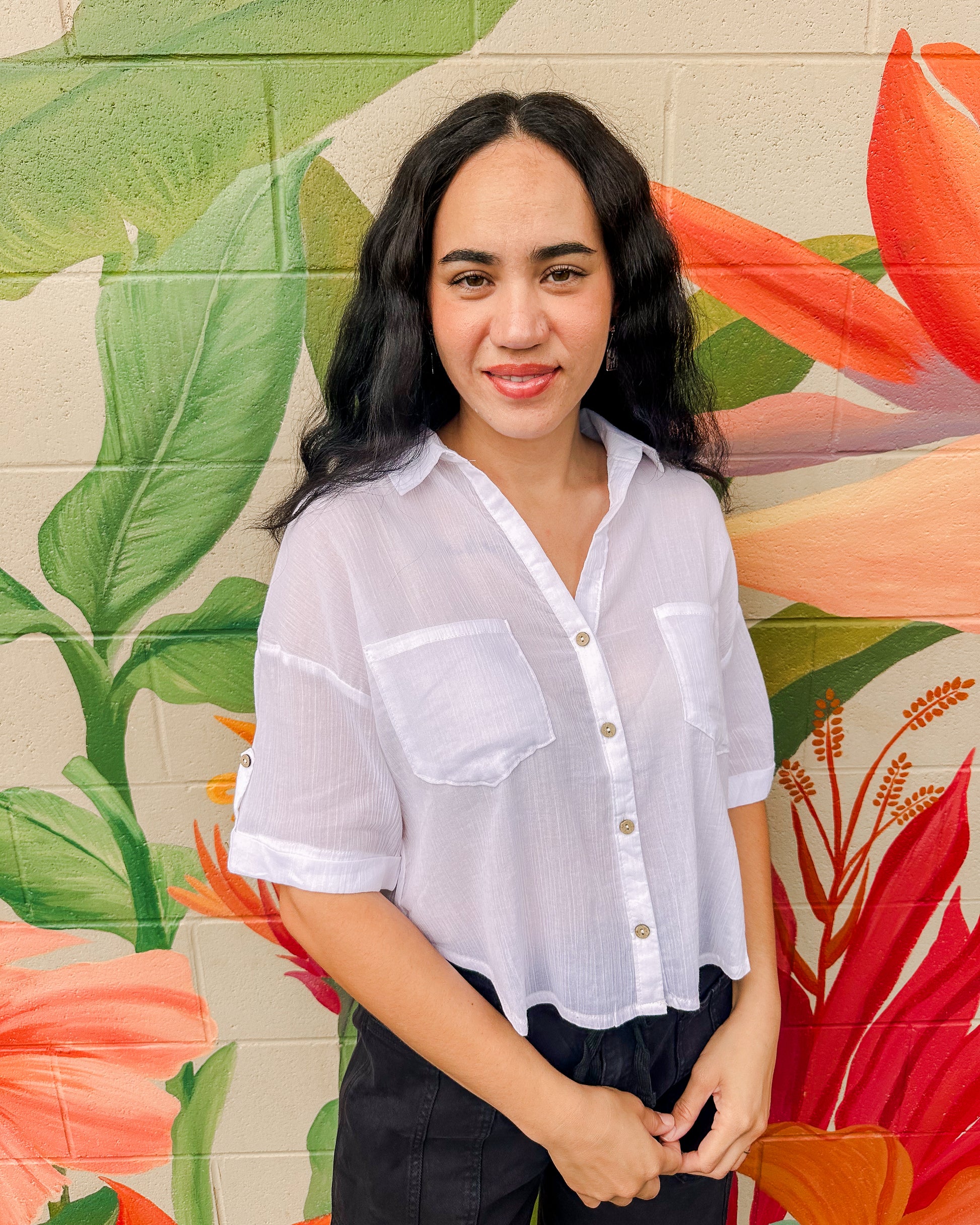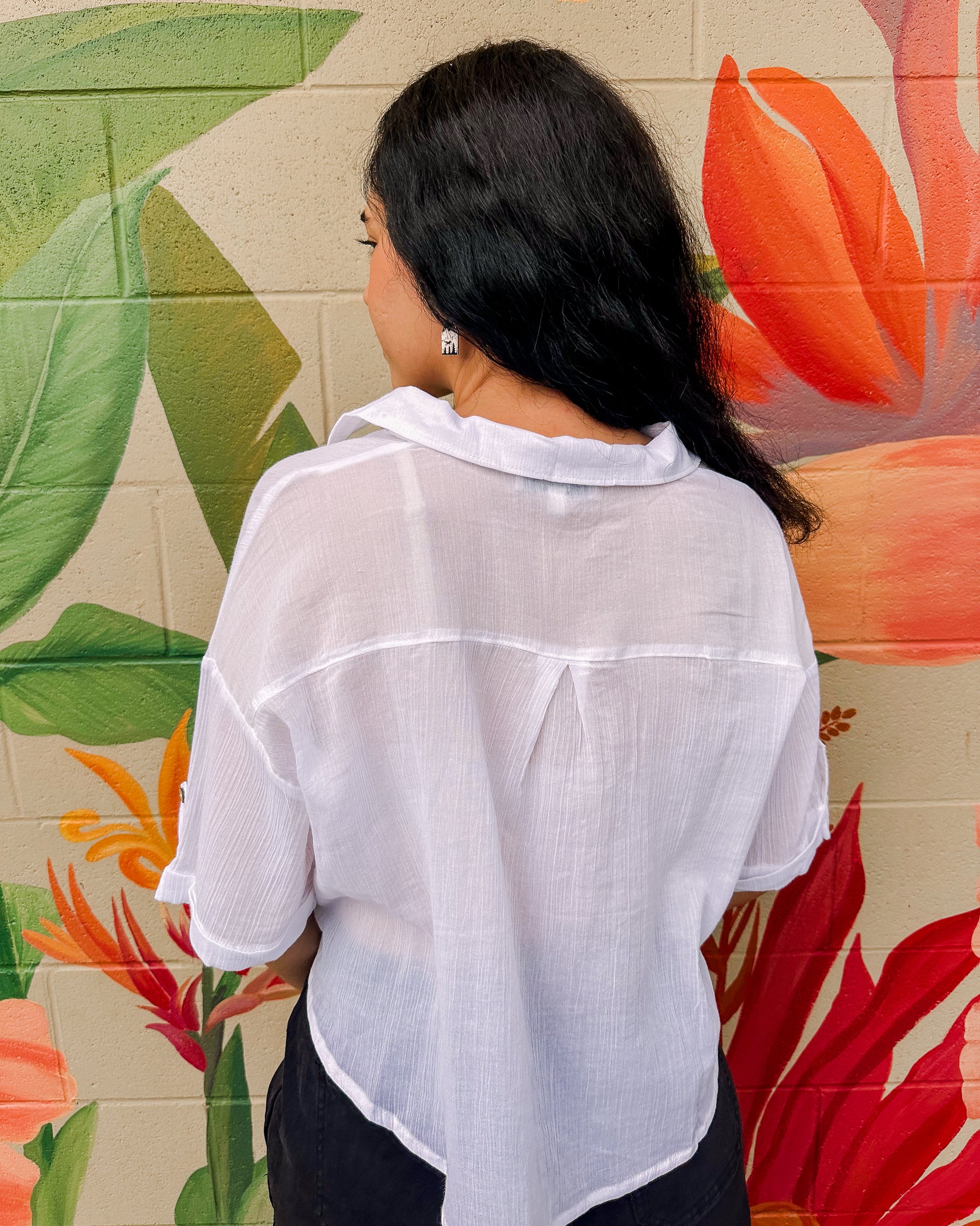 The Chani Top features a white cropped design with a boxy silhouette and button-down front. Its clean lines and relaxed fit offer effortless style and comfort, making it a versatile piece for layering or wearing on its own during warmer days.