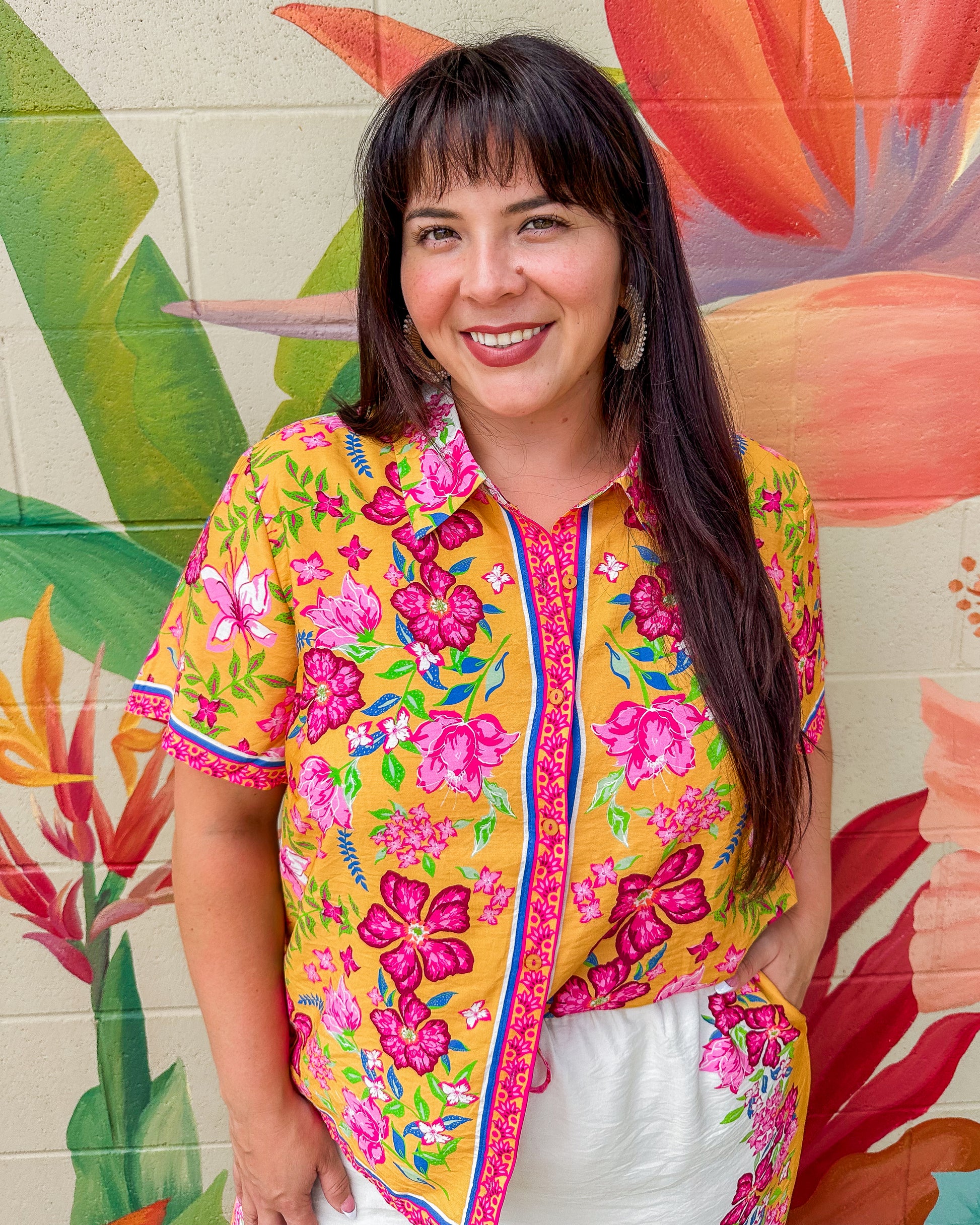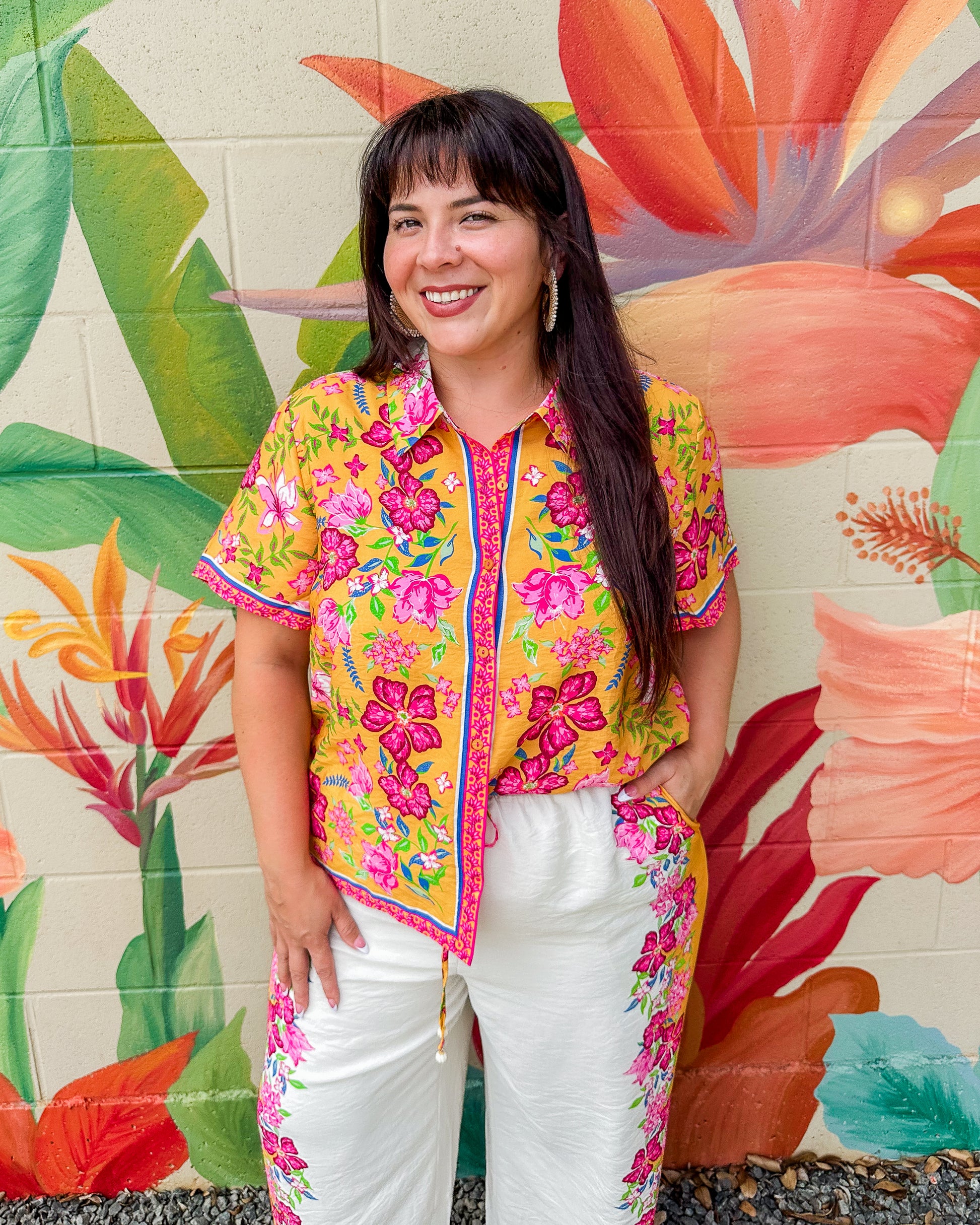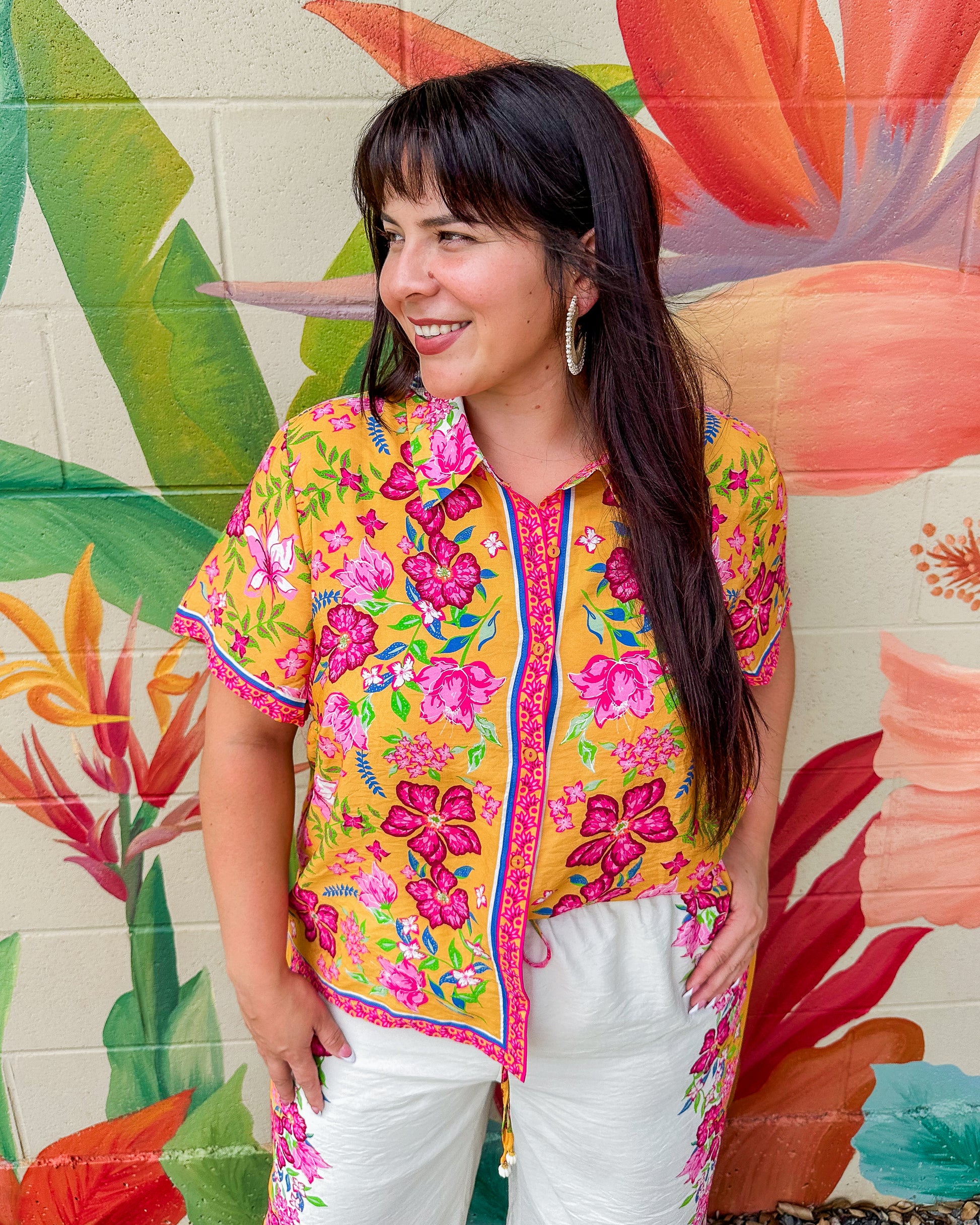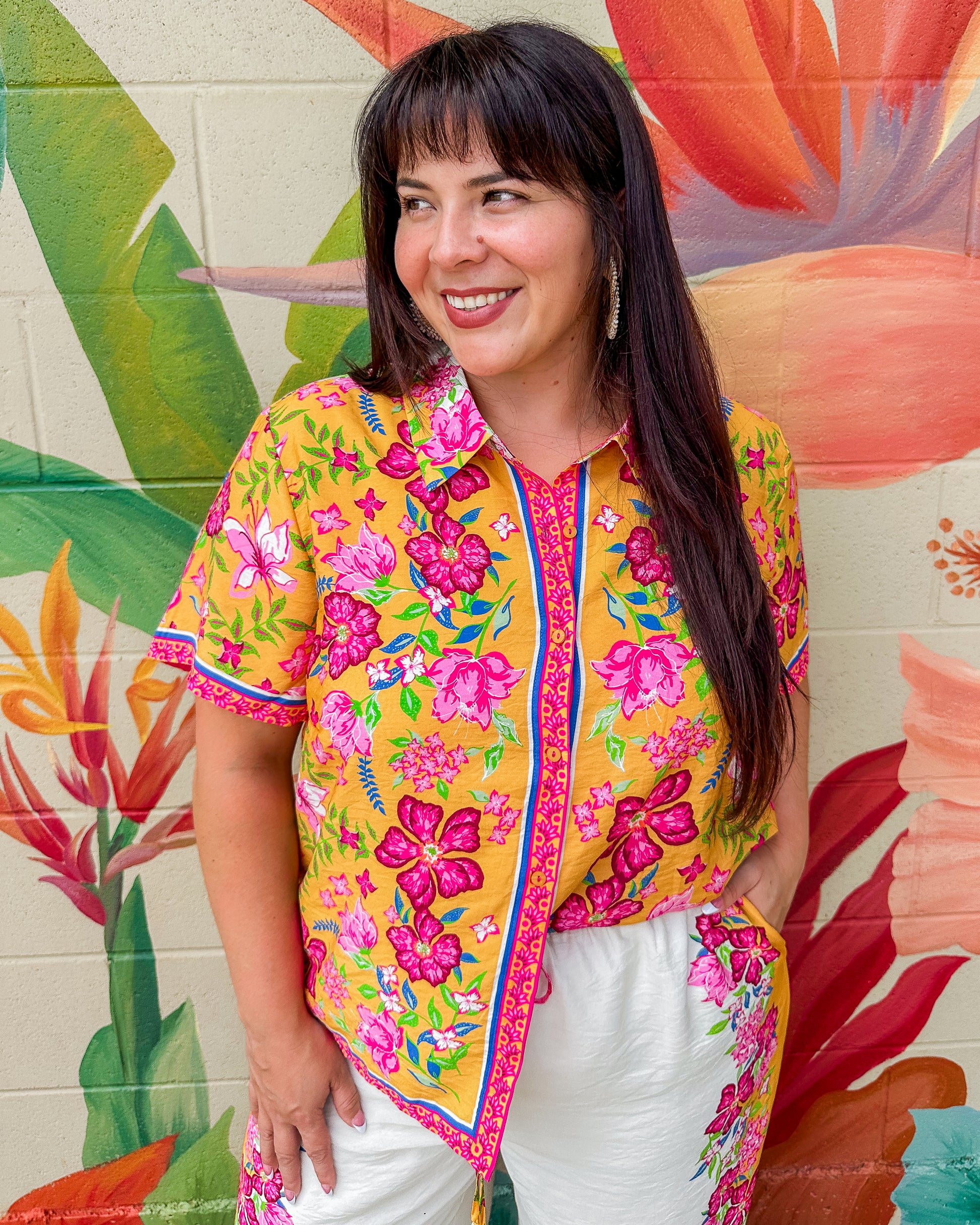 Introducing our Citrus Bloom Top. This versatile button-up top features a delicate floral border. Its short sleeves make it perfect for any occasion. Stay stylish and comfortable with this must-have addition to your wardrobe.