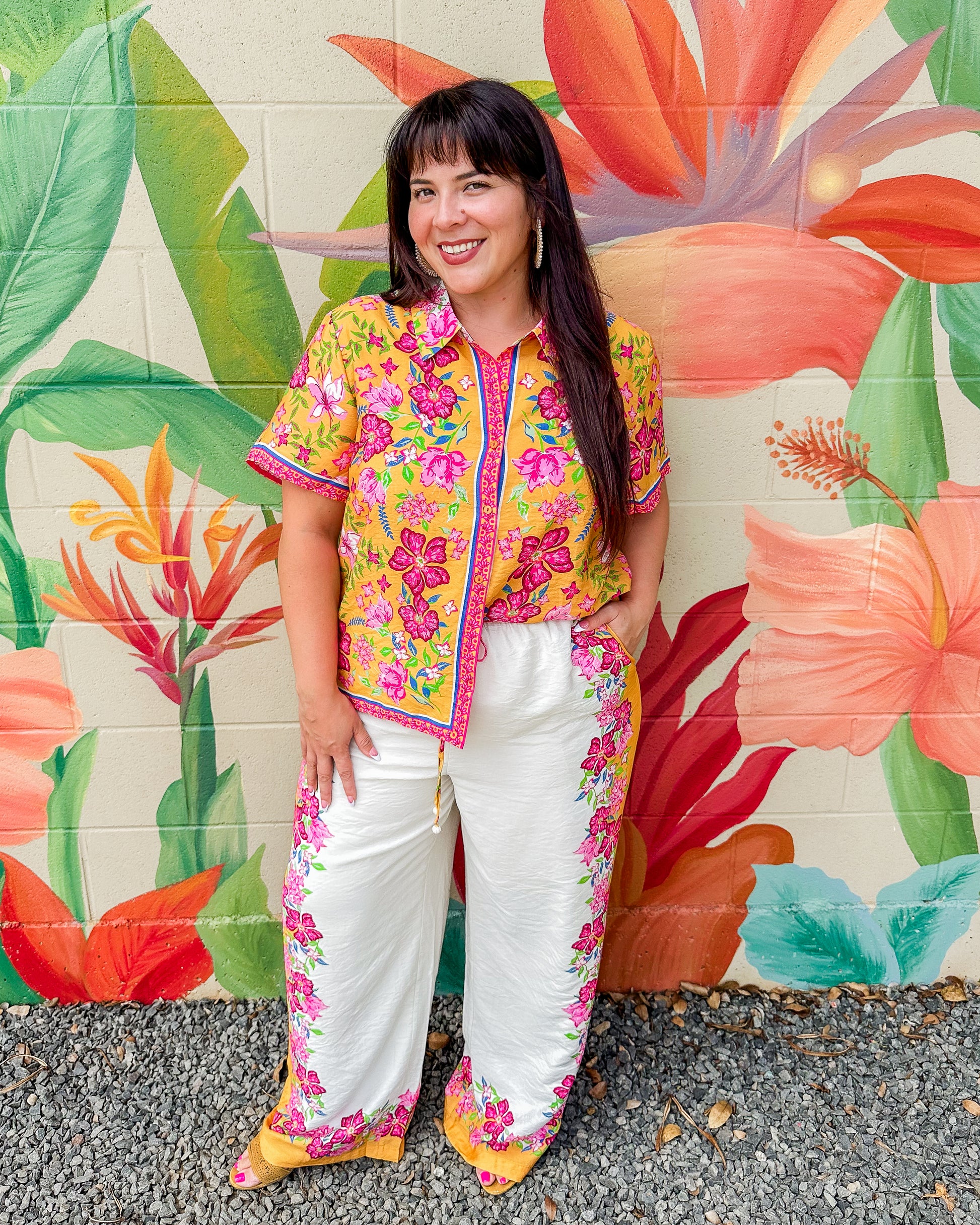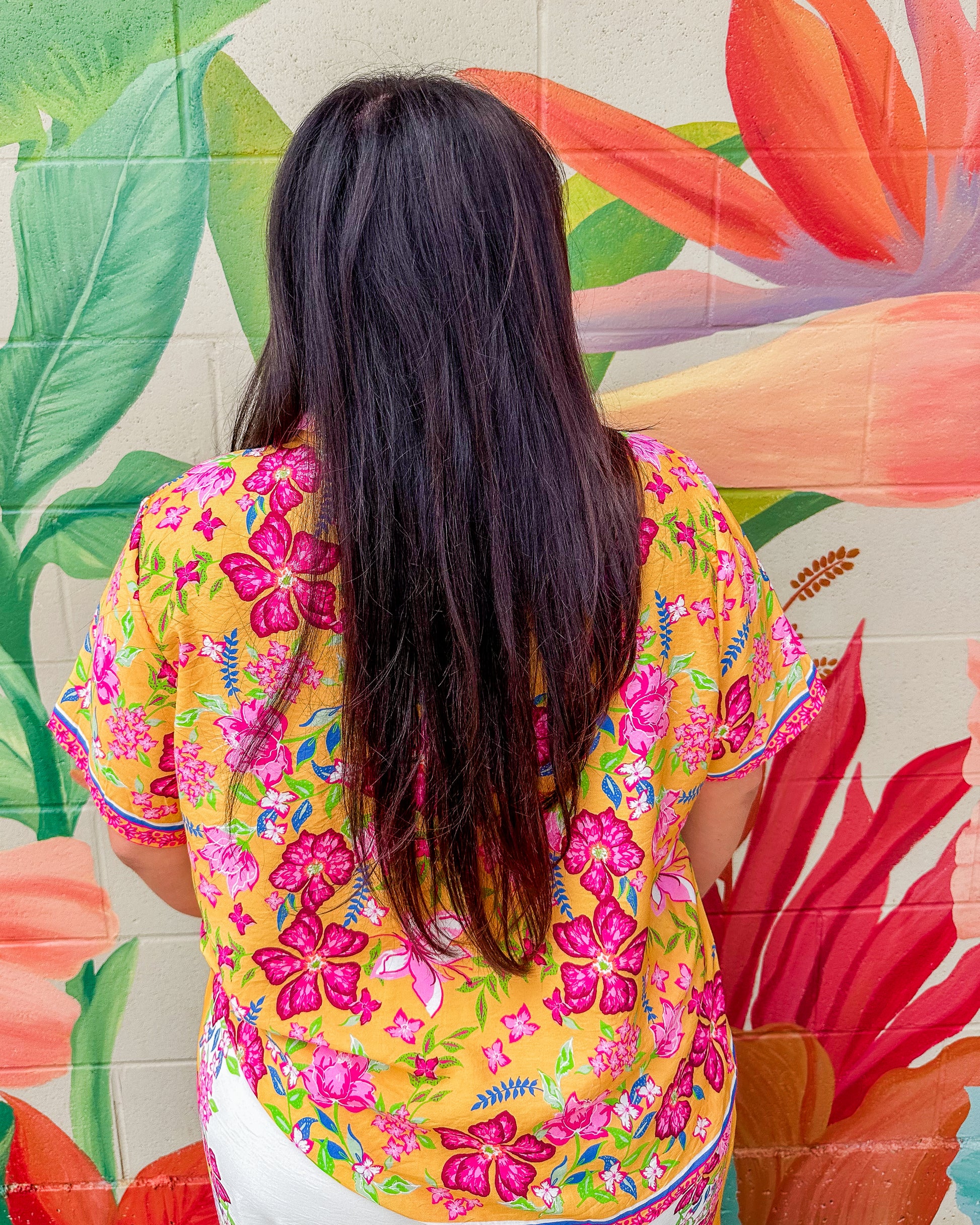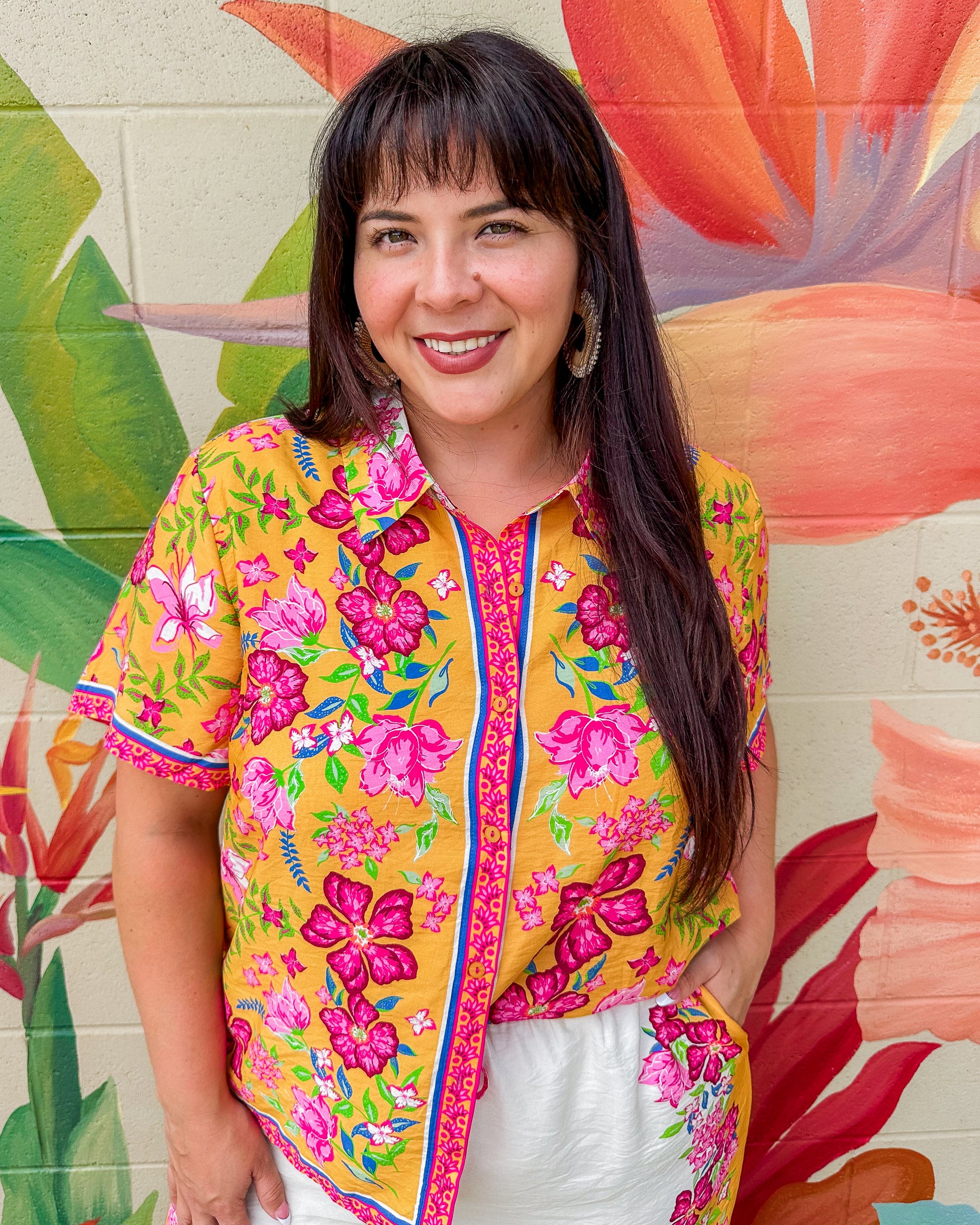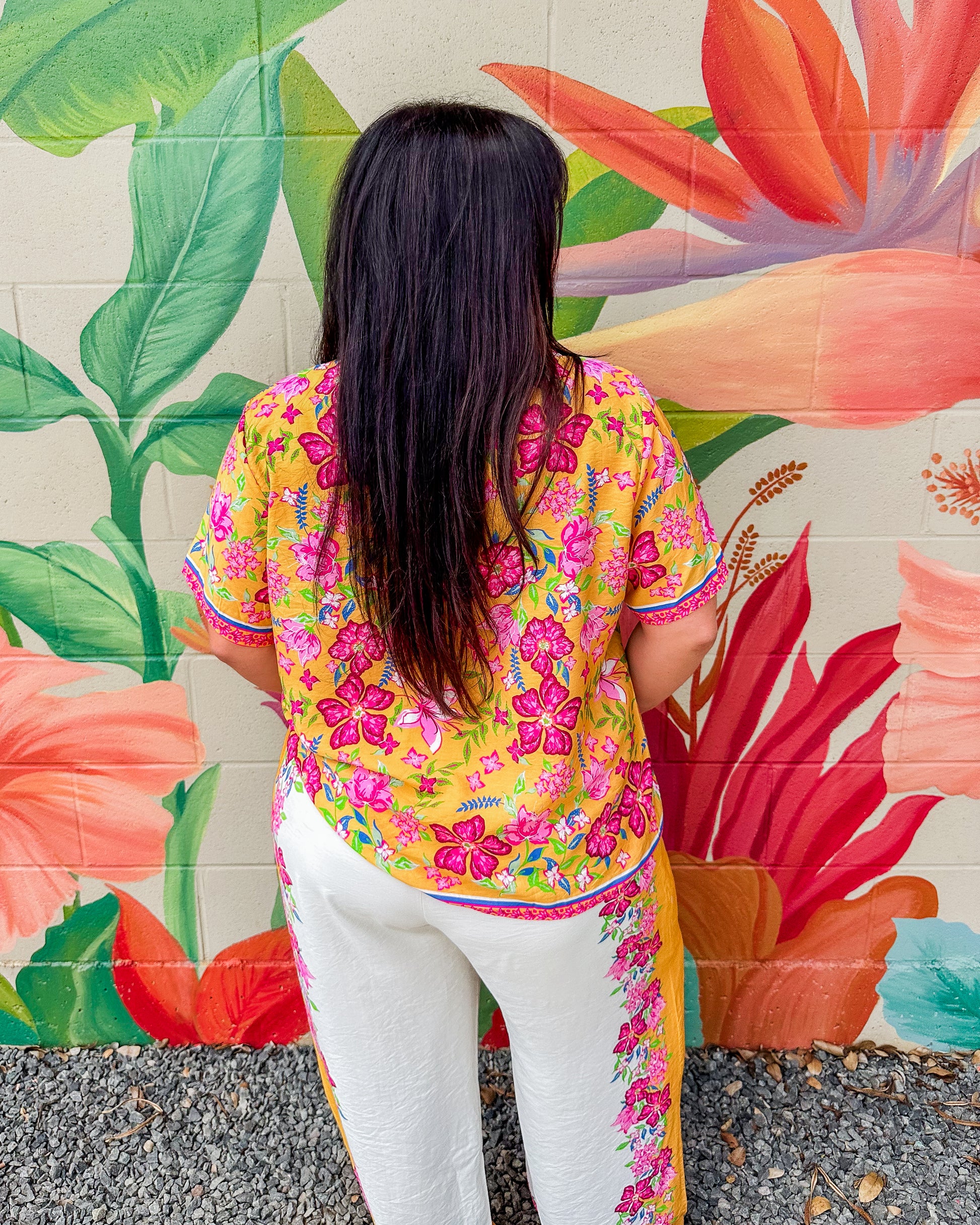 Introducing our Citrus Bloom Top. This versatile button-up top features a delicate floral border. Its short sleeves make it perfect for any occasion. Stay stylish and comfortable with this must-have addition to your wardrobe.