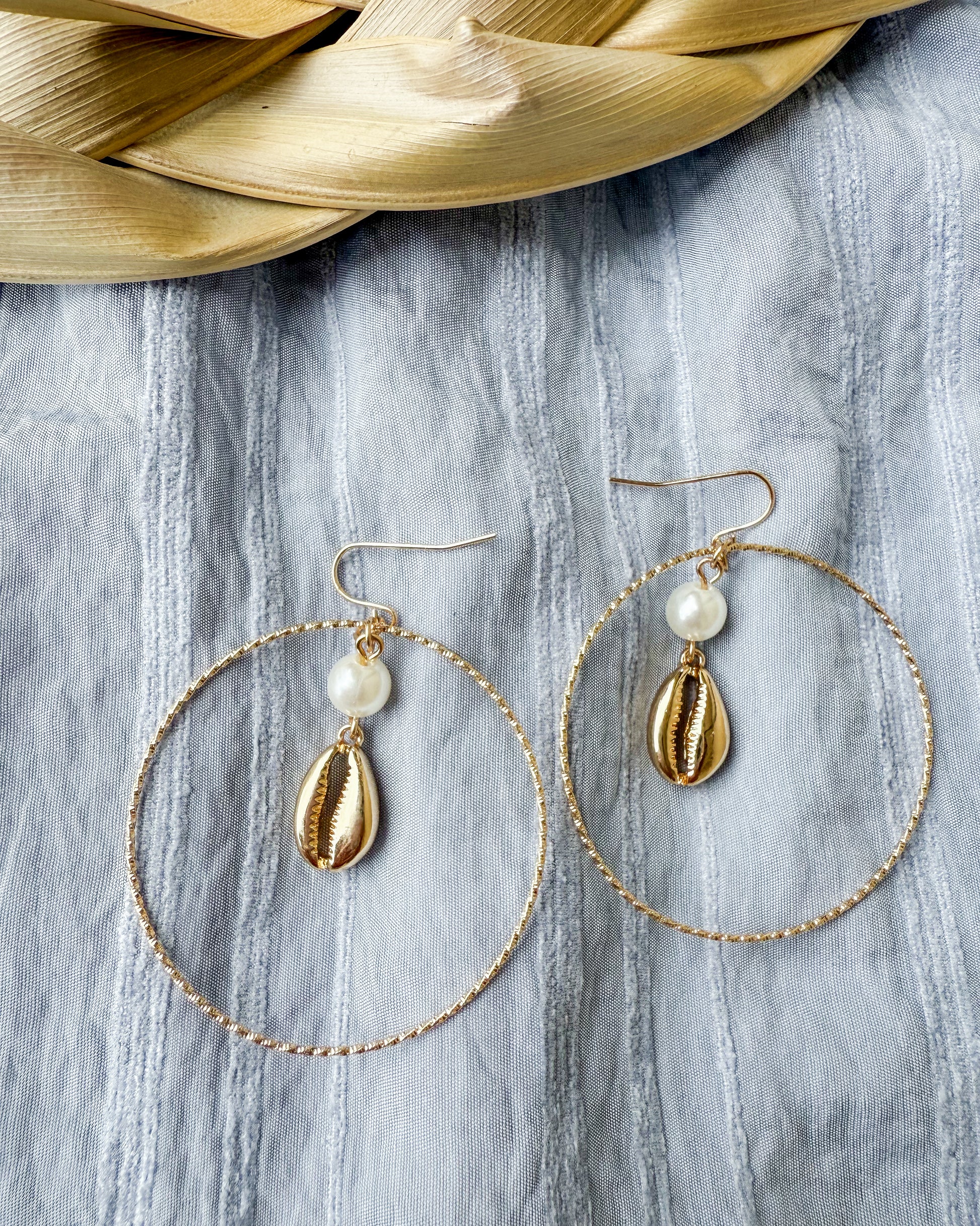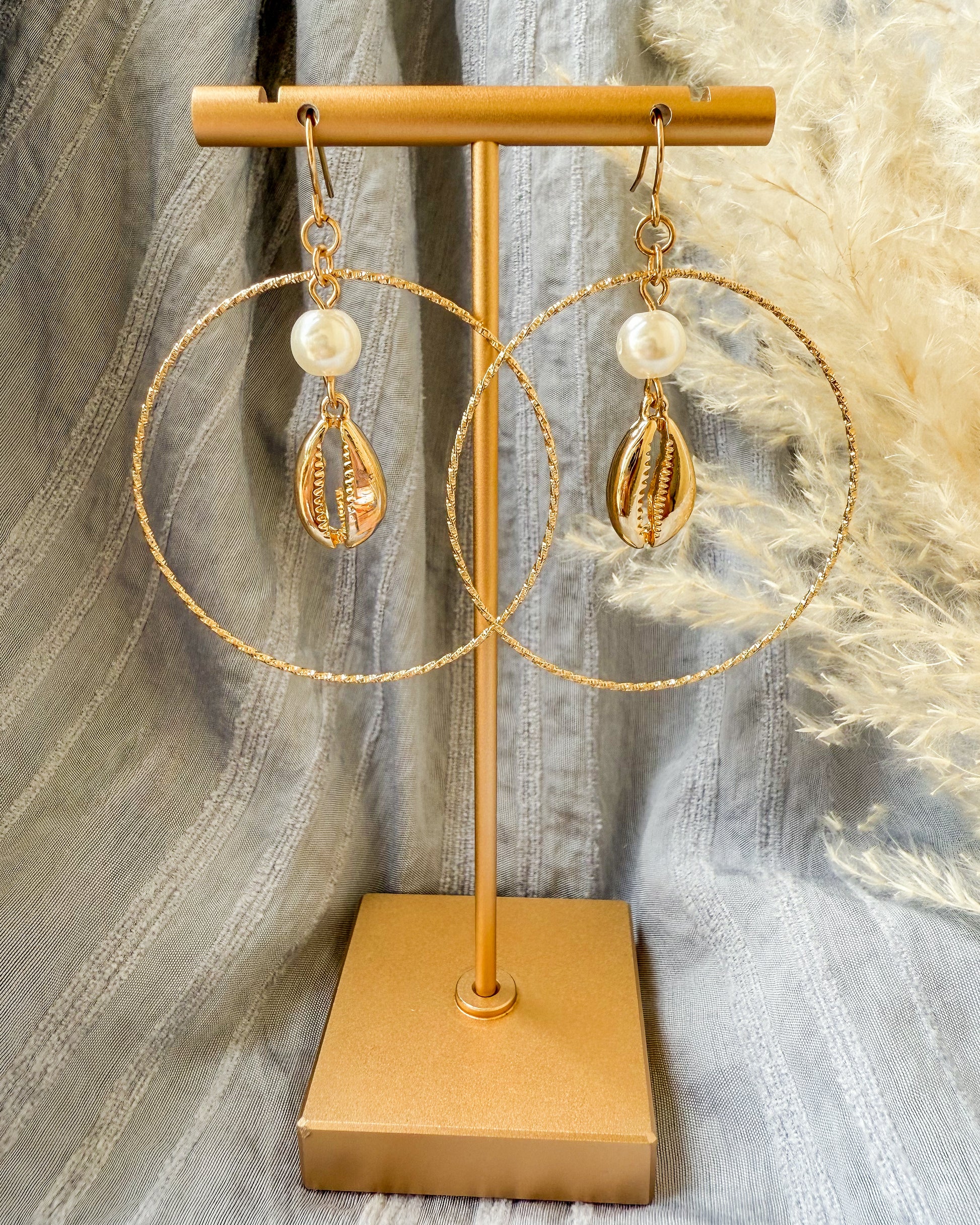 The fun hoops are screaming island gyalllll! Gold plated textured hoops with floating pearls & cowrie shells that adds just a little bit of paradise to any outfit.
