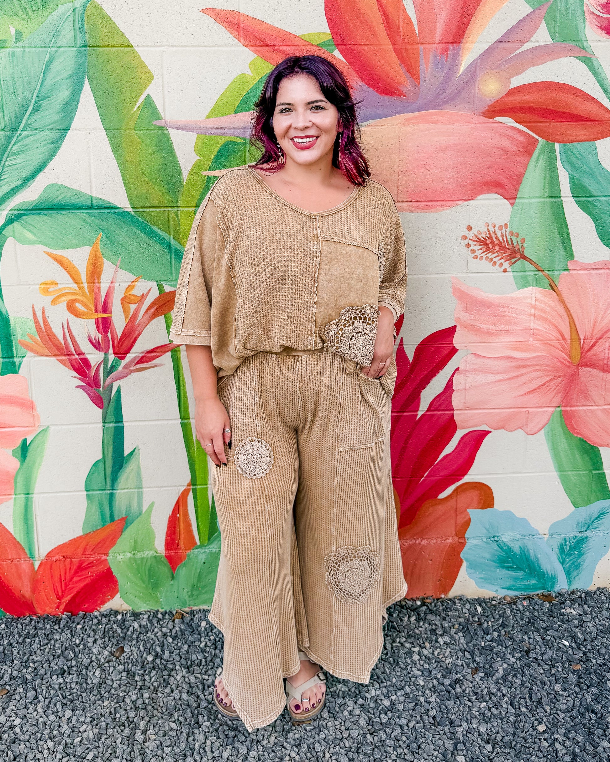 Darlene Pants feature an eye-catching asymmetrical cut paired with intricate crochet patch detailing. The unique design blends modern silhouettes with handcrafted texture, creating a statement piece that works for casual outings or dressed-up occasions. Perfect for anyone looking to add an artistic edge to their wardrobe.