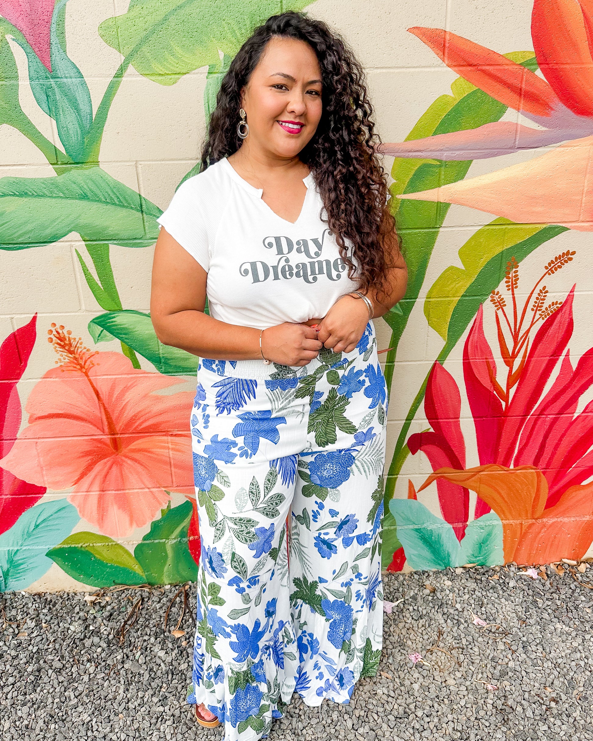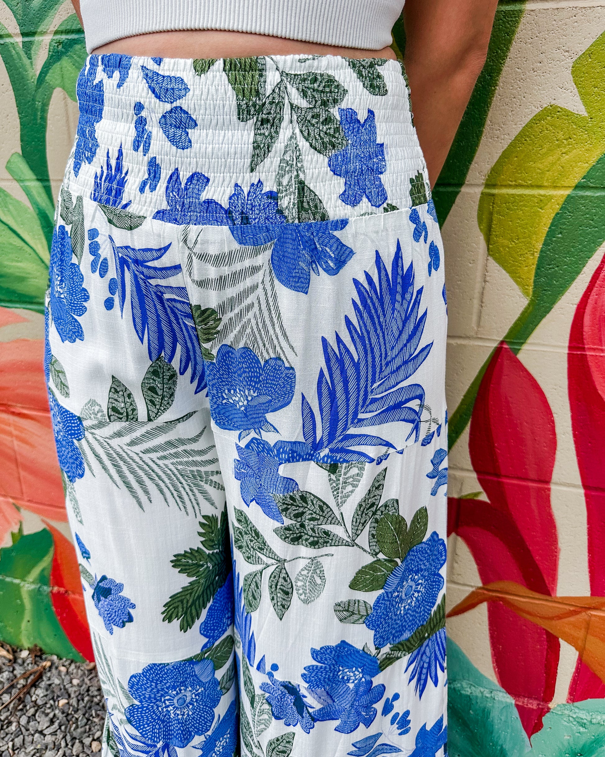 These Dinah Pants feature a comfortable smocked waistband for a flexible fit, complemented by practical side pockets. The delicate floral pattern and ruffle hem add a gentle, feminine touch, making them perfect for relaxed, everyday wear.