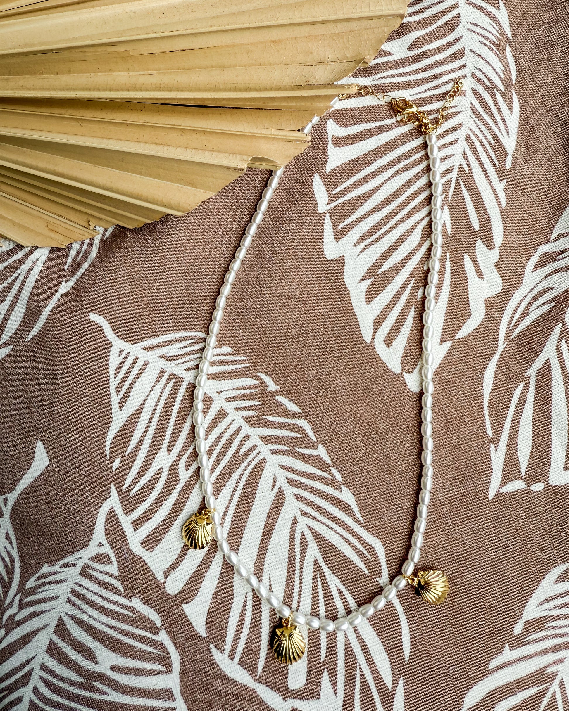 Wear a beautiful strand of pearls with cute shell charms for the perfect everyday beach babe vibe! Plated.