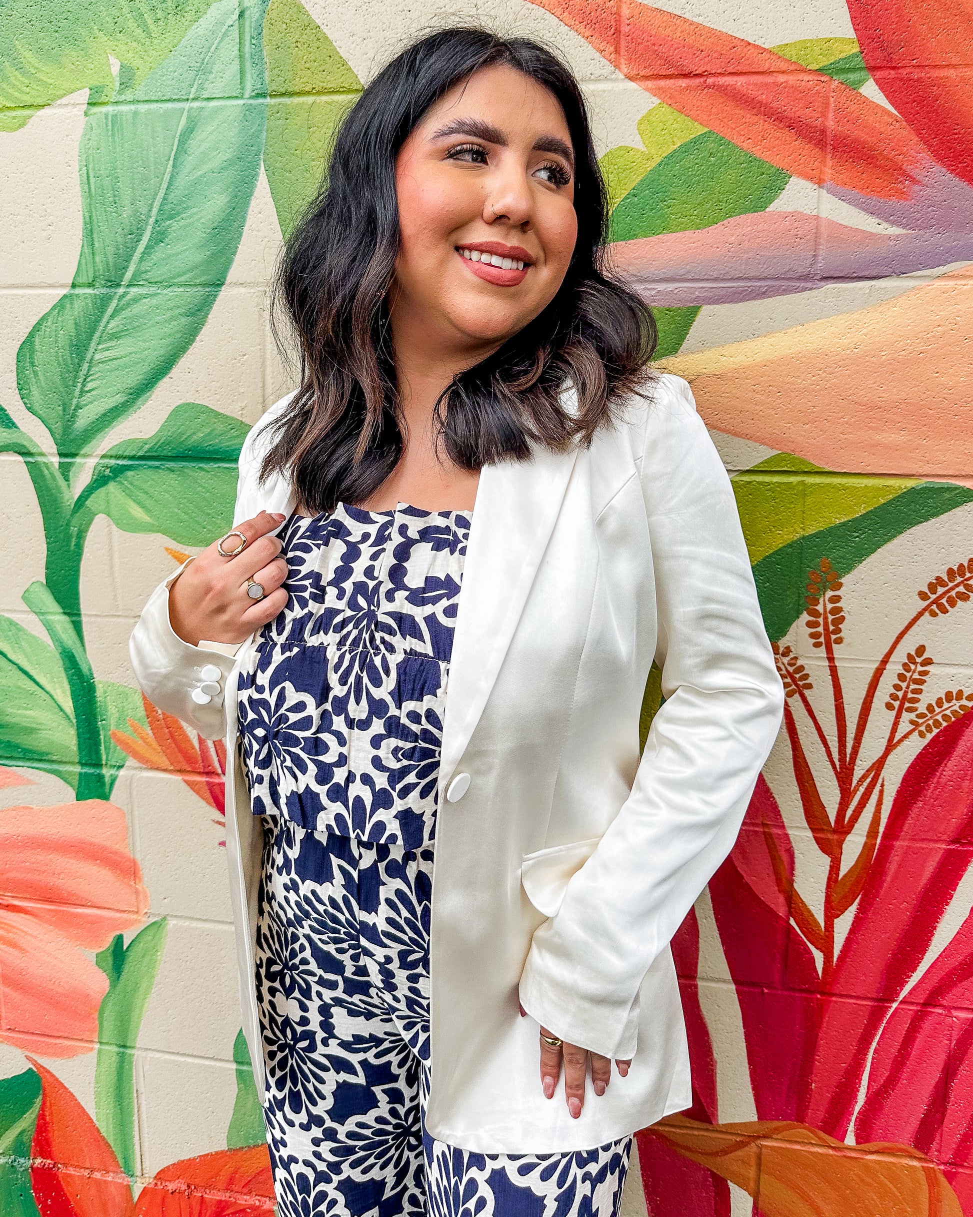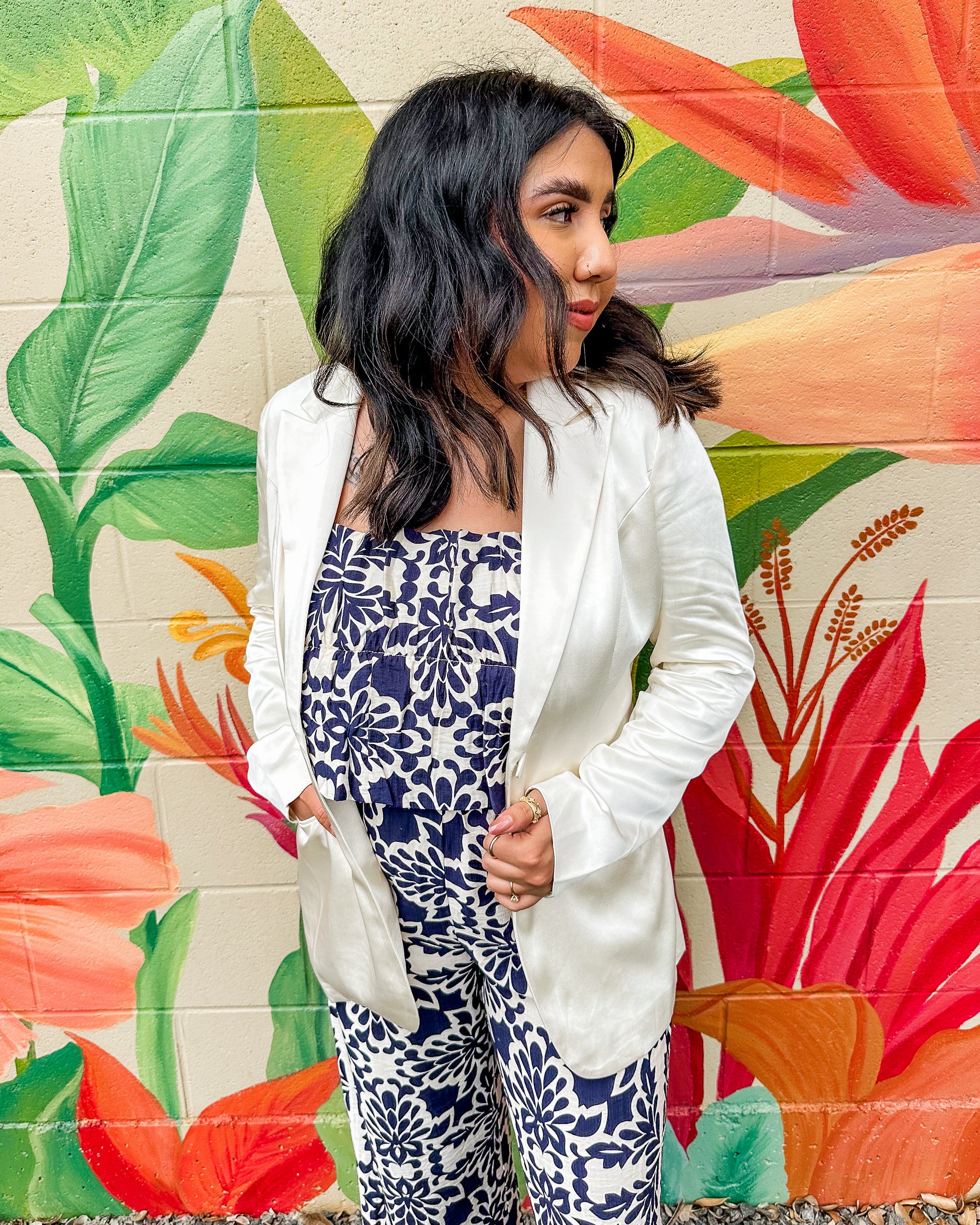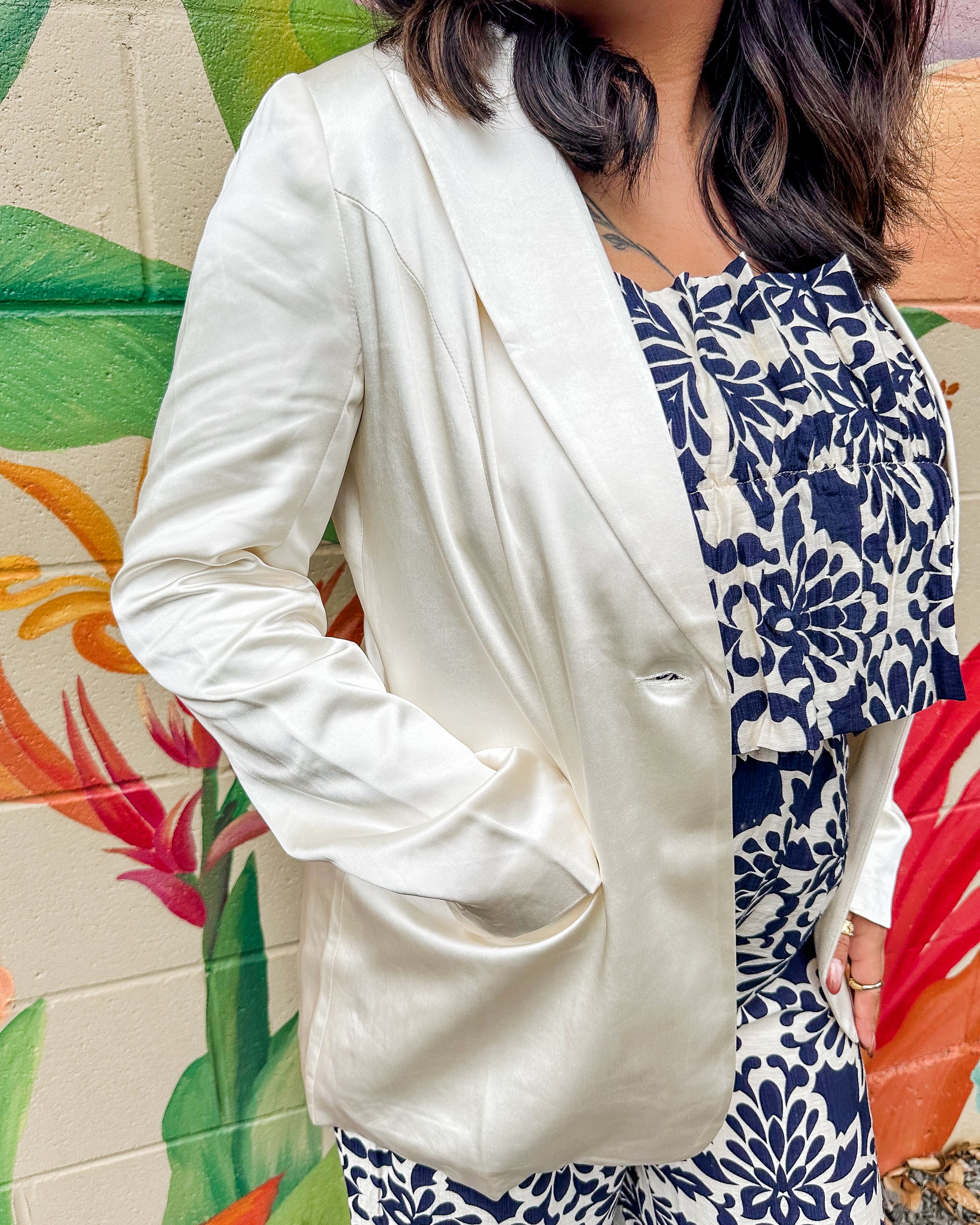 The luxe Dottie Blazer features a sleek satin finish and a minimalist design with a single button closure. Its long sleeves and smooth texture offer a refined yet comfortable fit, making it an elegant choice for both professional settings and stylish evenings out. This blazer effortlessly elevates any outfit with its subtle sheen and tailored silhouette.