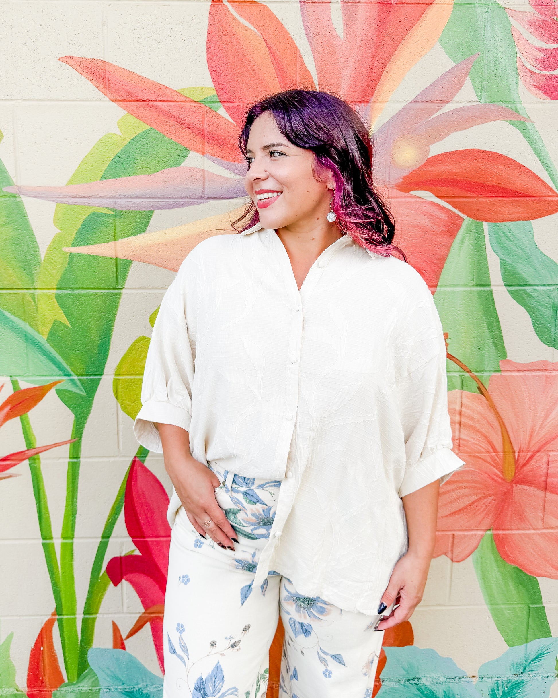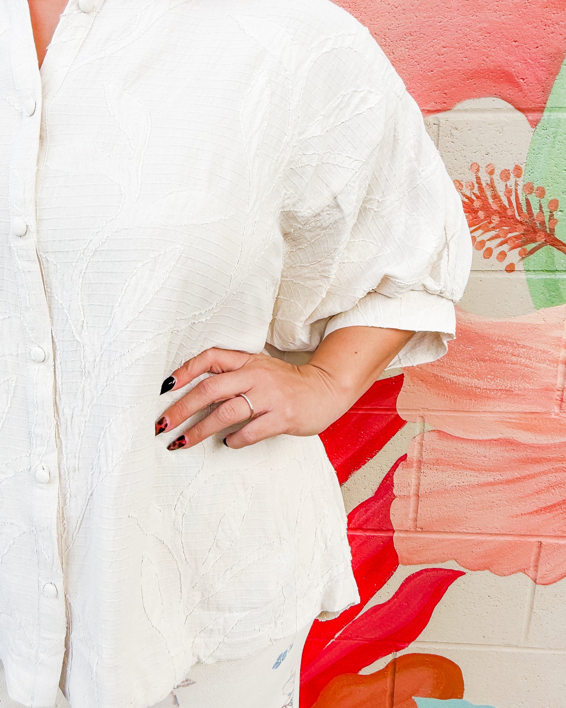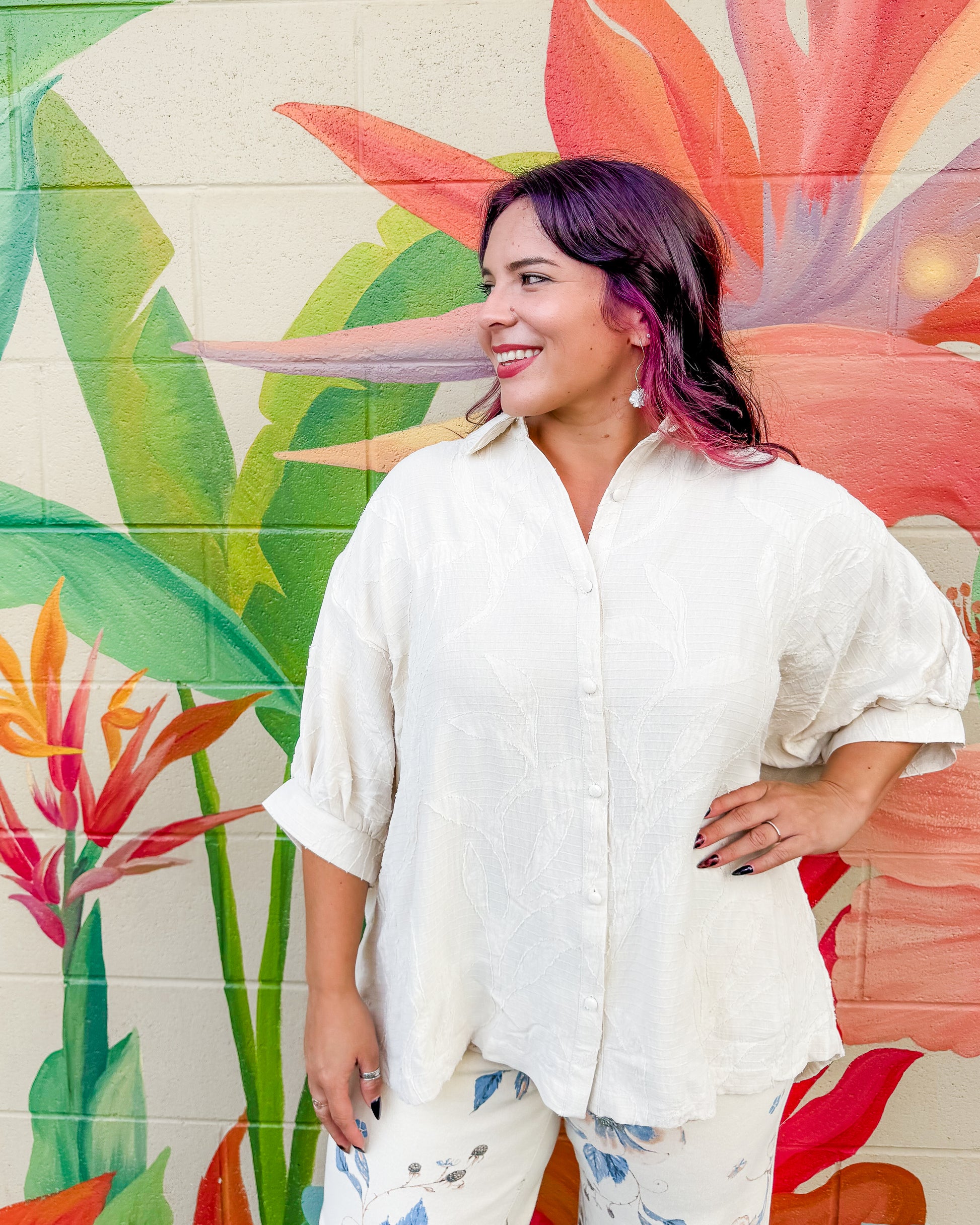 Elevate your everyday style with the Douglas Top, featuring a sophisticated jacquard weave with textured leaf detailing. This classic button-down blouse offers timeless appeal with modern texture, perfect for layering or wearing solo. Versatile enough for the office or weekend outings, it's a wardrobe essential that works with everything.