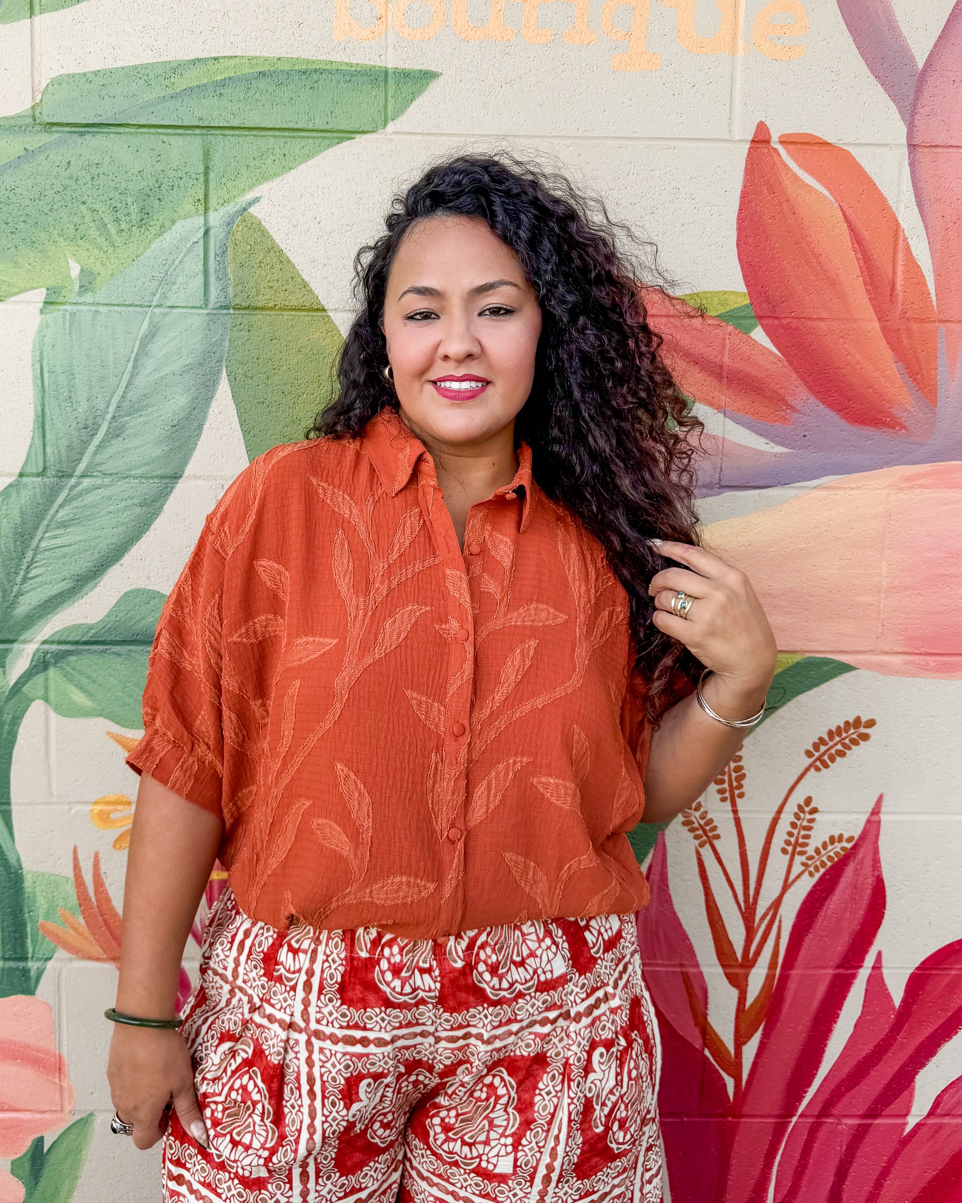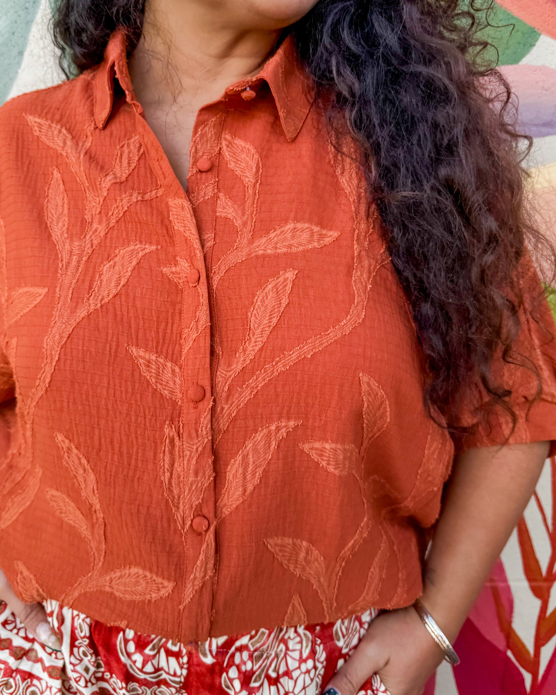 Elevate your everyday style with the Douglas Top, featuring a sophisticated jacquard weave with textured leaf detailing. This classic button-down blouse offers timeless appeal with modern texture, perfect for layering or wearing solo. Versatile enough for the office or weekend outings, it's a wardrobe essential that works with everything.