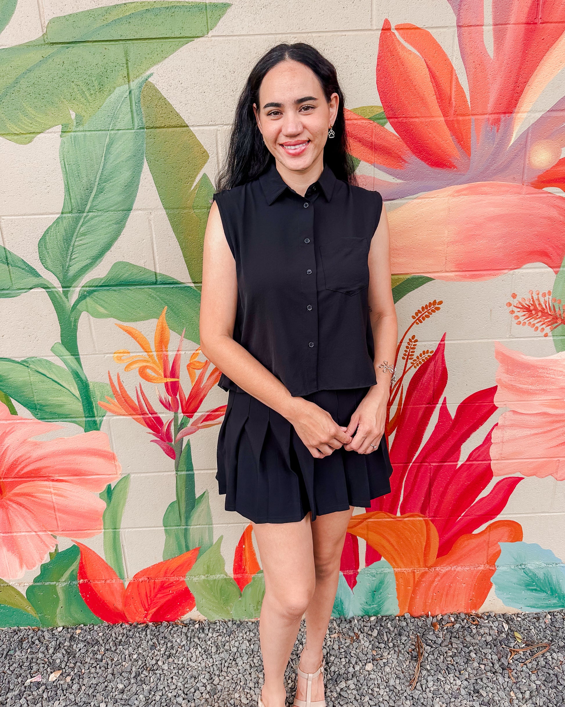 The Drupe Blouse features a collared neckline and a button-front bodice, complemented by a sleeveless cut. Designed for a relaxed fit, this top provides effortless comfort and a timeless style perfect for any casual or professional setting.