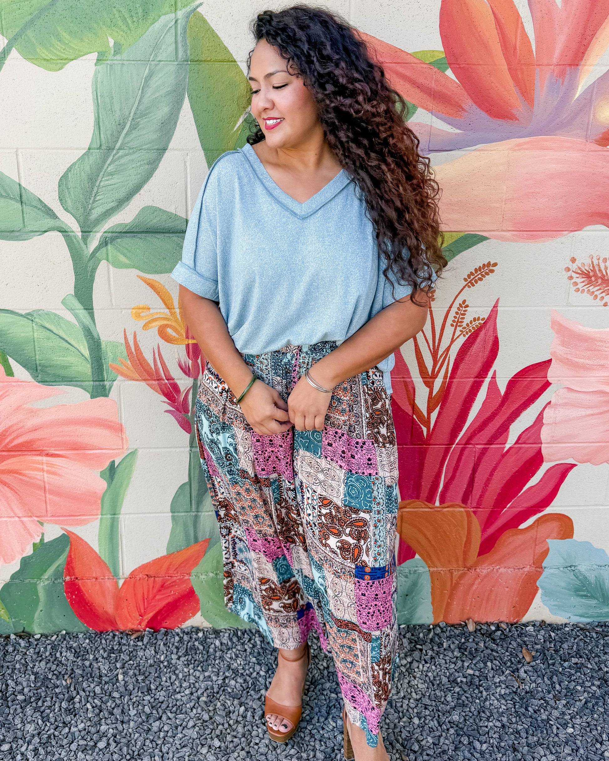 The Ella Top in Dusty Teal features a soft melange hacci fabric with a relaxed V-neck and folded short sleeves. The hi-low hem with side slits adds movement and dimension, while exposed seams give it an effortless, modern edge. Perfect for layering or wearing solo, this versatile tee transitions seamlessly from casual days to weekend outings.