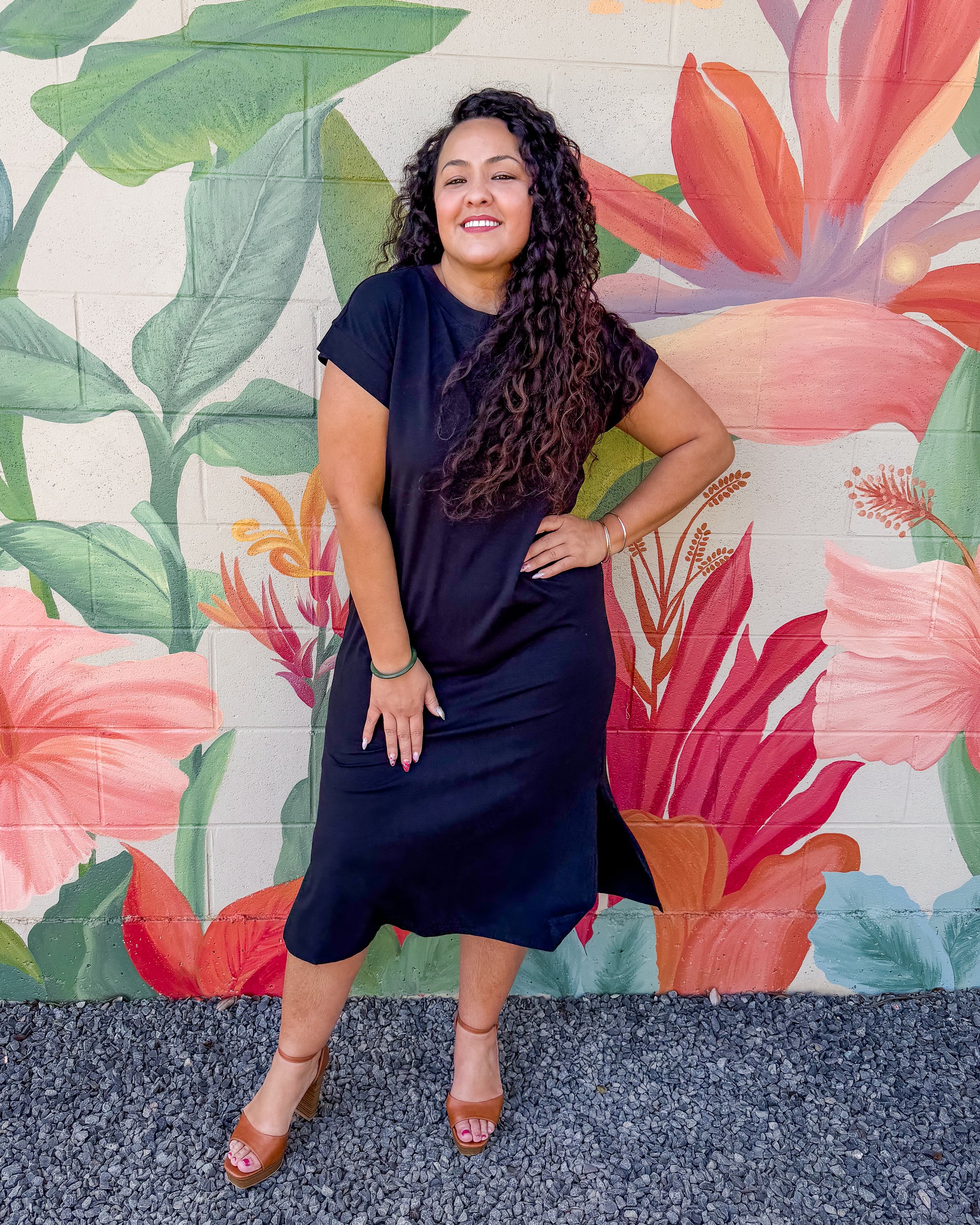 Effortless and elegant, the Elote Dress features a classic round neckline and short sleeves in a flattering midi length. The practical side slit adds movement and comfort for everyday wear. Perfect for casual outings or dressing up with minimal effort.