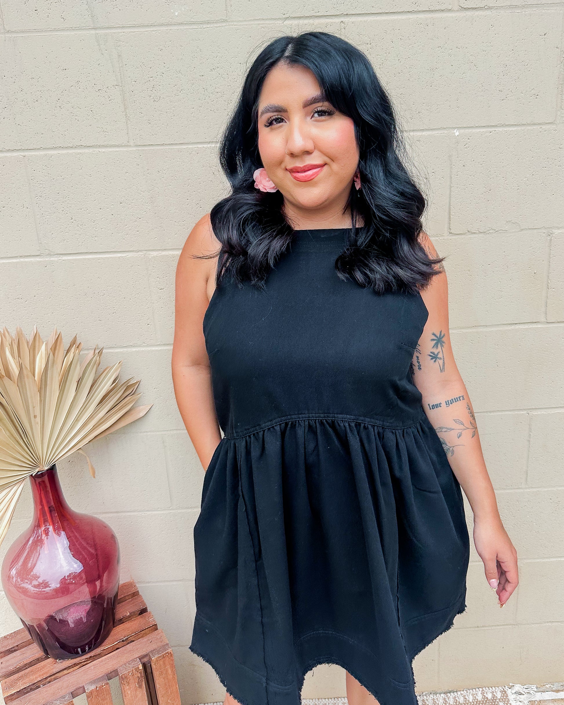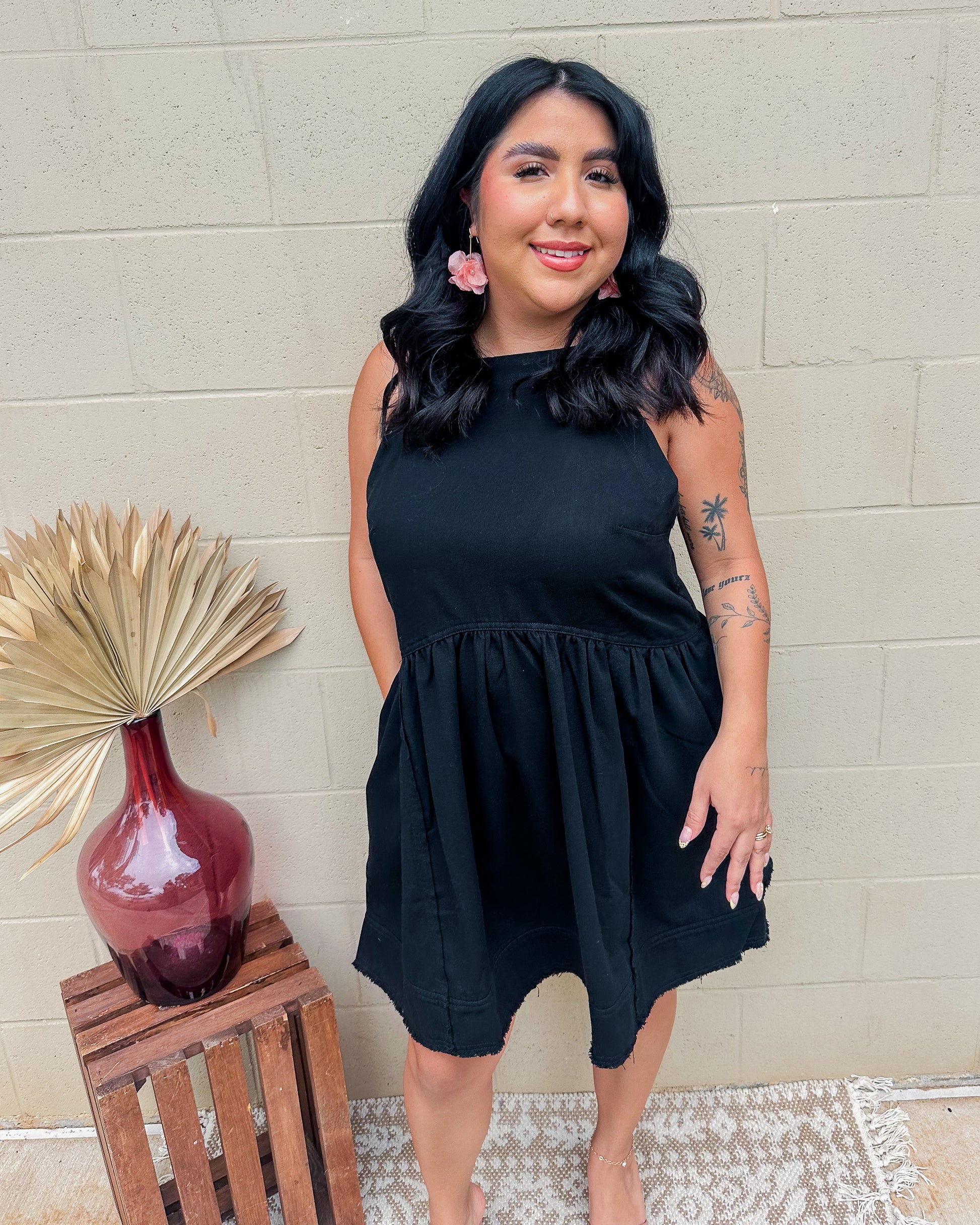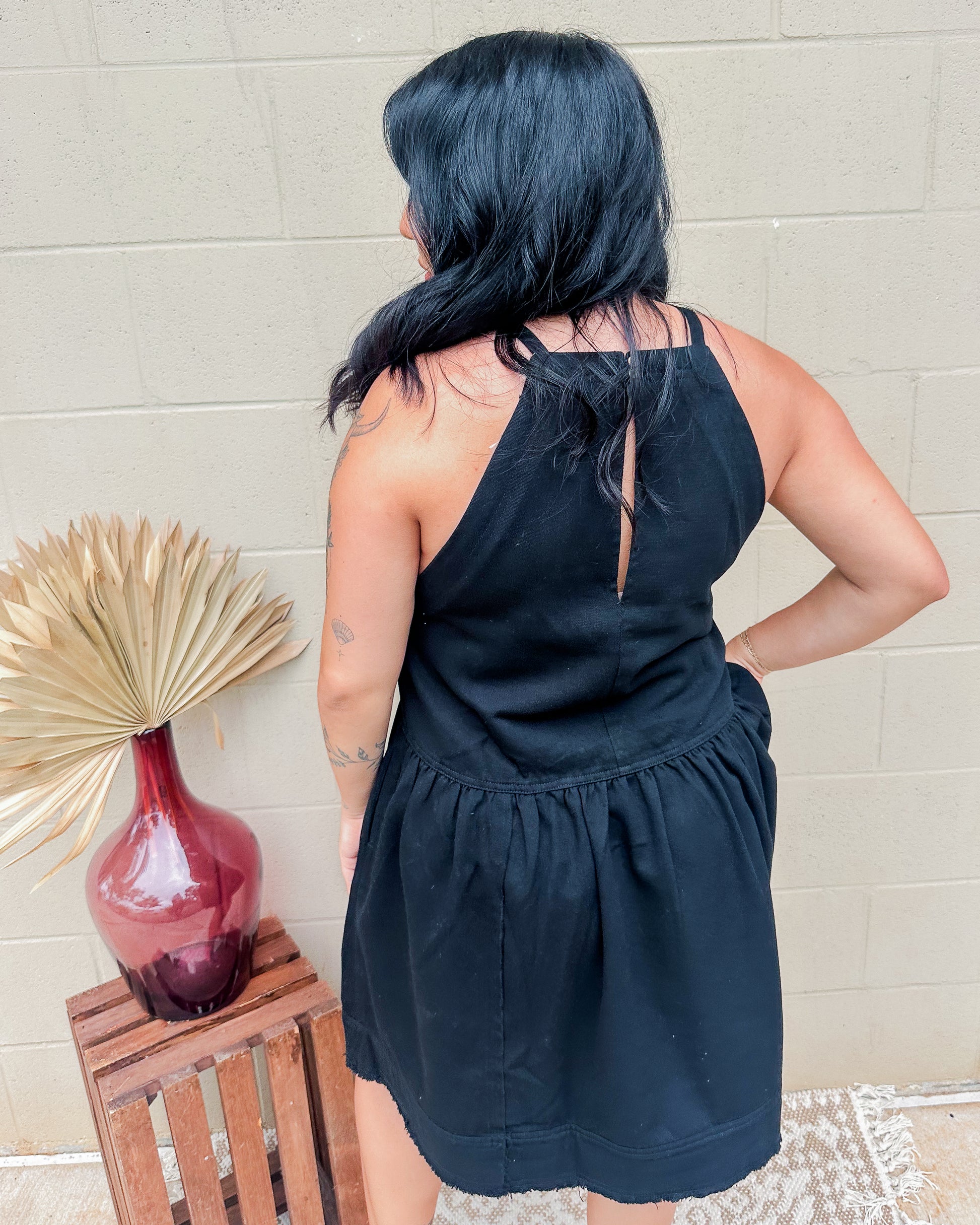 The Elsa Dress features delicate thin shoulder straps and a straight neckline, creating a simple yet elegant look. Its sleeveless bodice and dropped waist design offer a relaxed fit that flows gently into a flattering mini hem. Perfect for casual outings, this dress combines comfort with a charming silhouette.