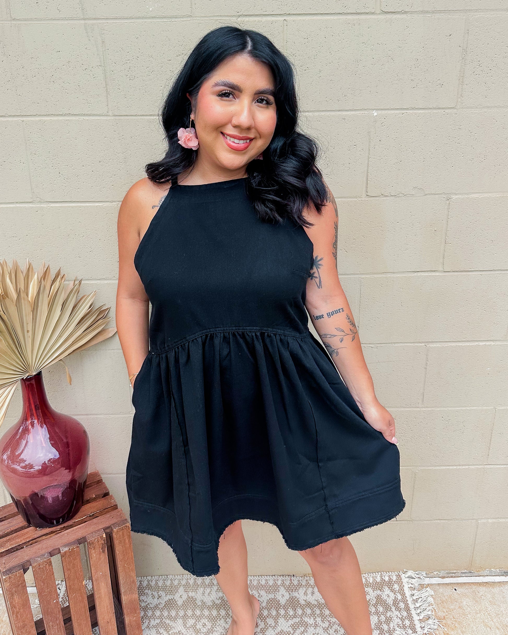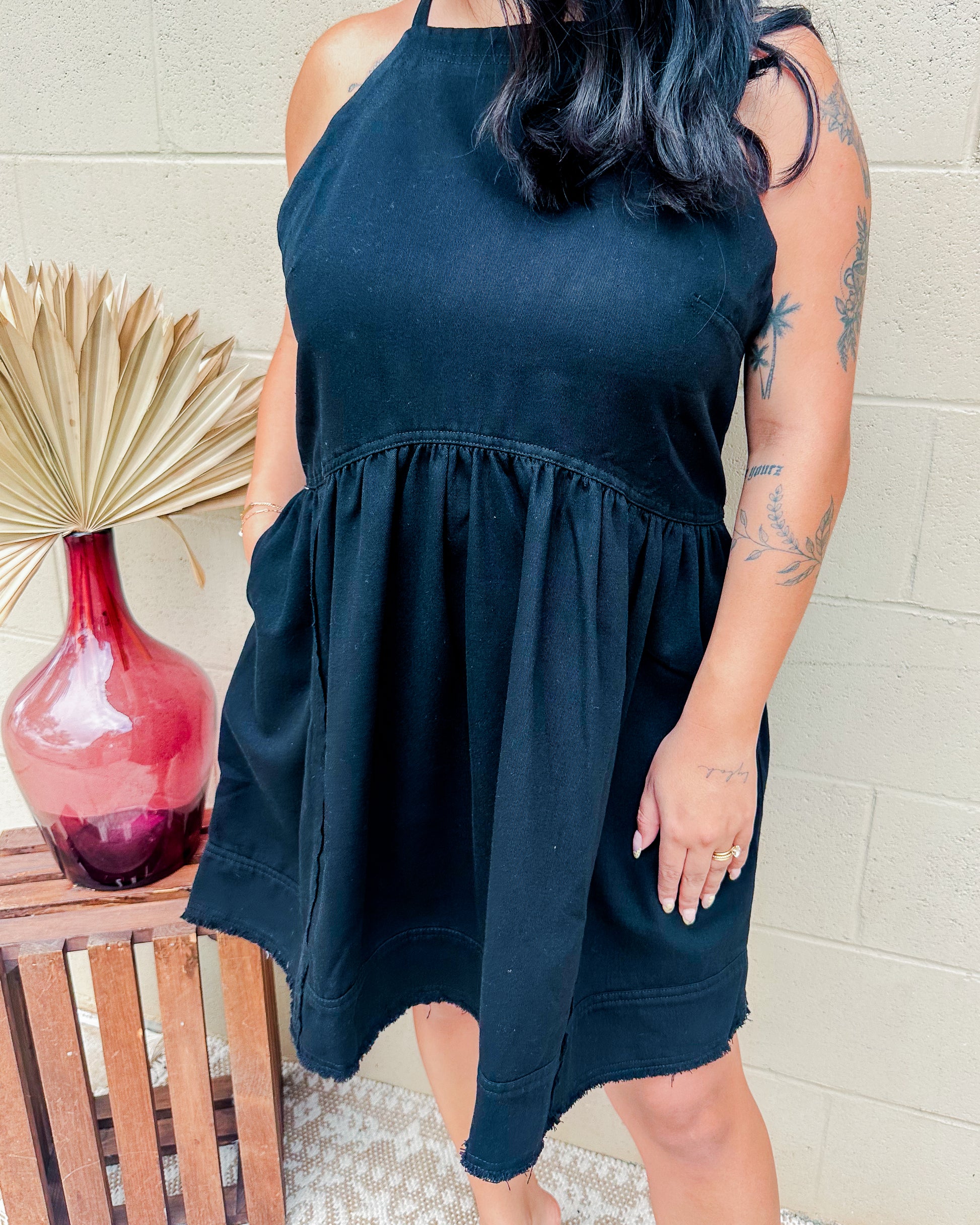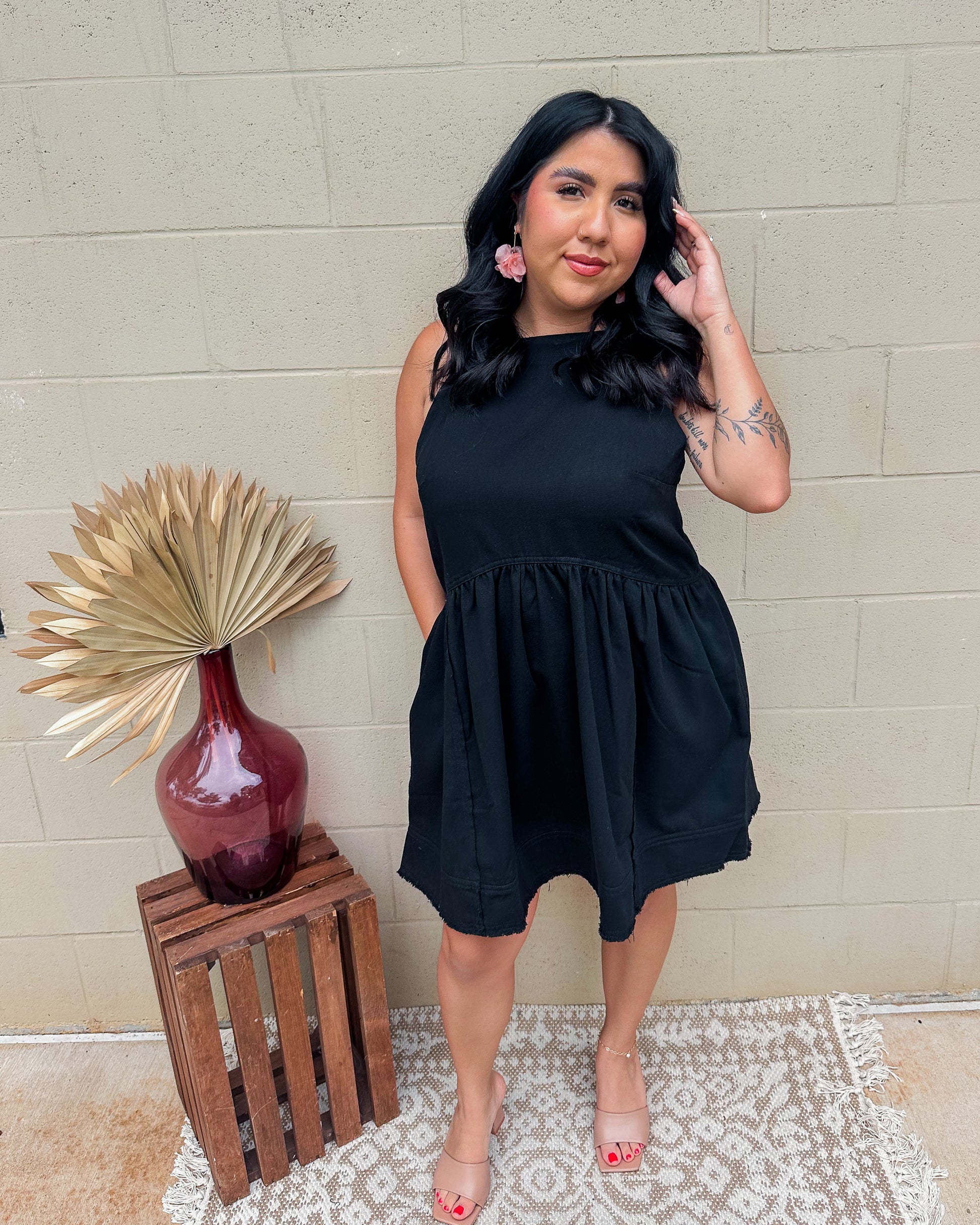 The Elsa Dress features delicate thin shoulder straps and a straight neckline, creating a simple yet elegant look. Its sleeveless bodice and dropped waist design offer a relaxed fit that flows gently into a flattering mini hem. Perfect for casual outings, this dress combines comfort with a charming silhouette.
