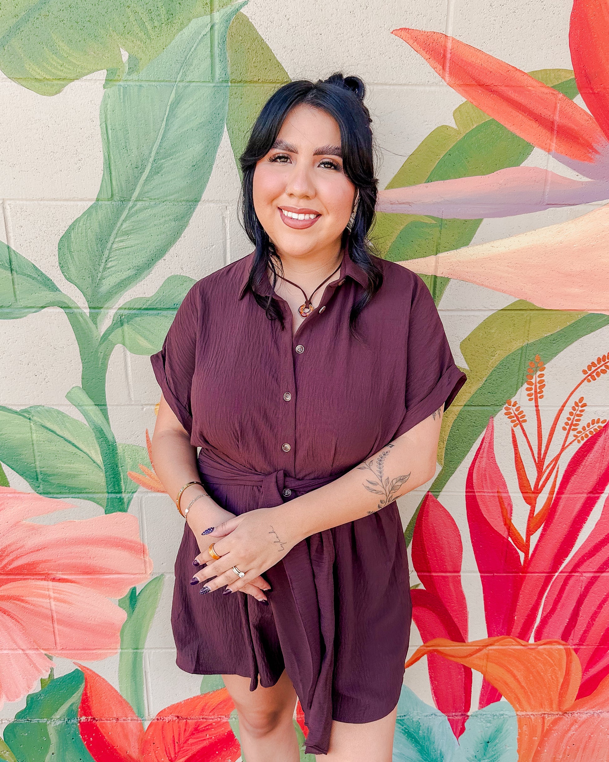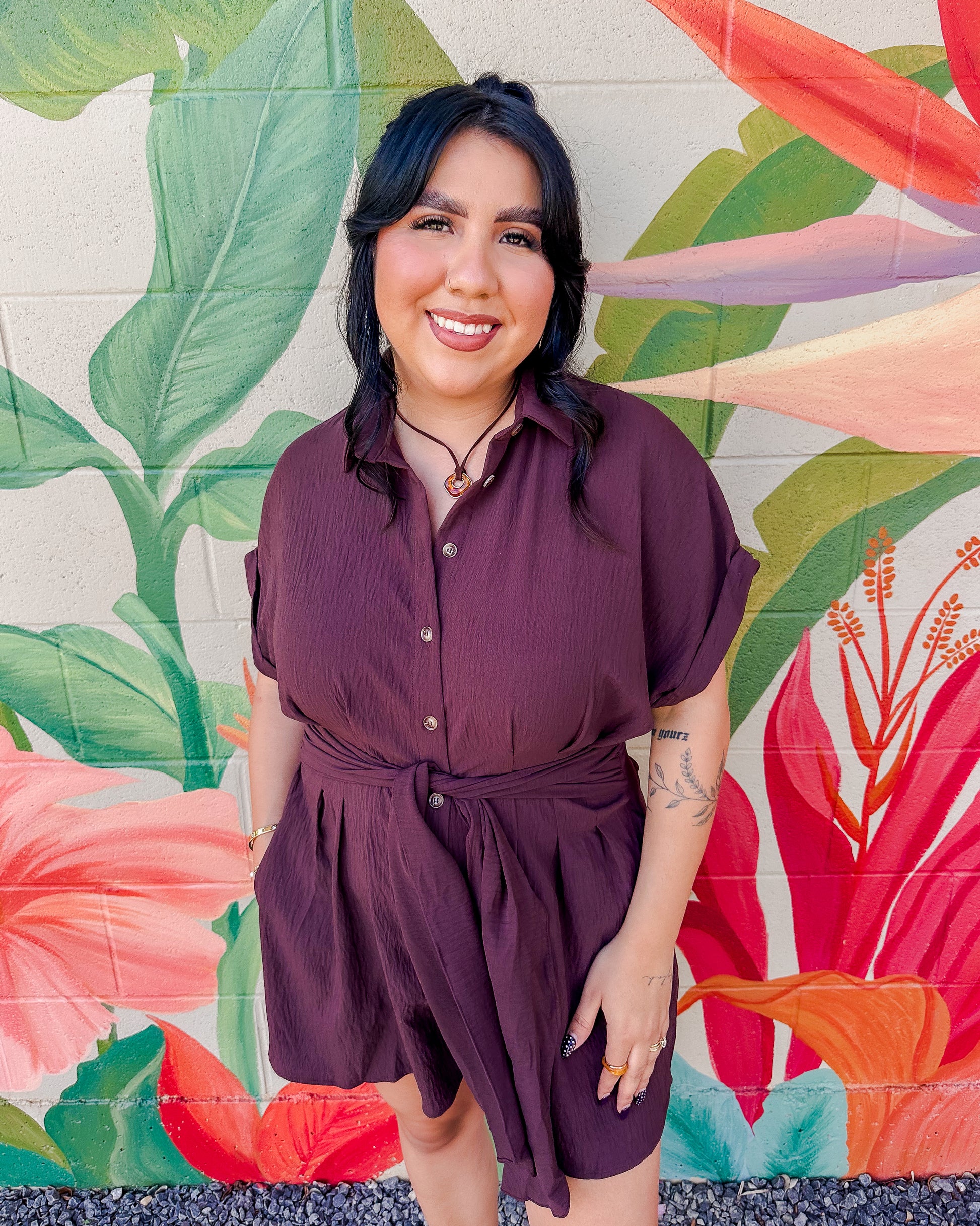 The Ennis Romper features a short sleeve design with a classic collar and button details, complemented by a delicate ribbon tie at the front. This piece offers a relaxed yet polished look, perfect for effortless style and comfort.