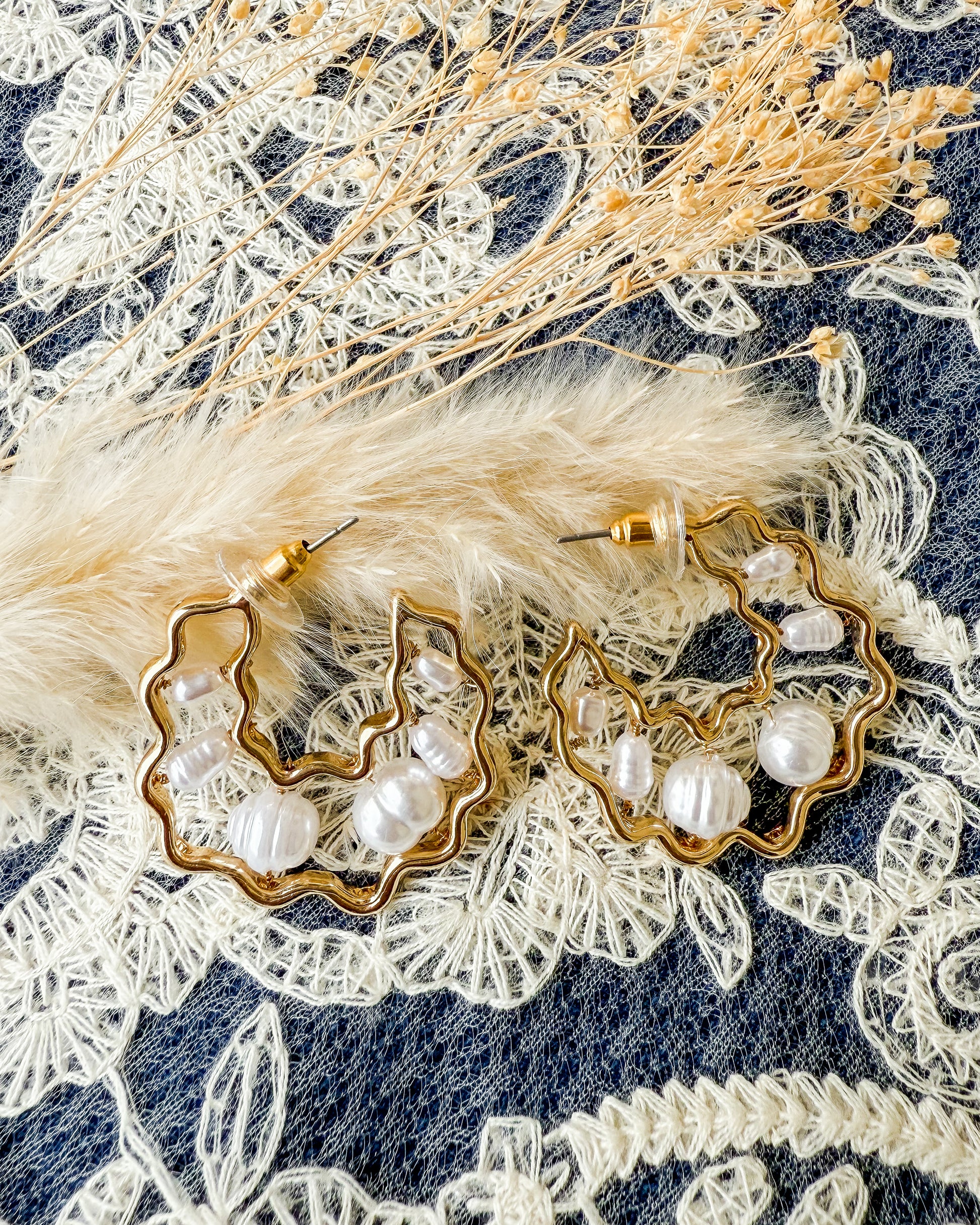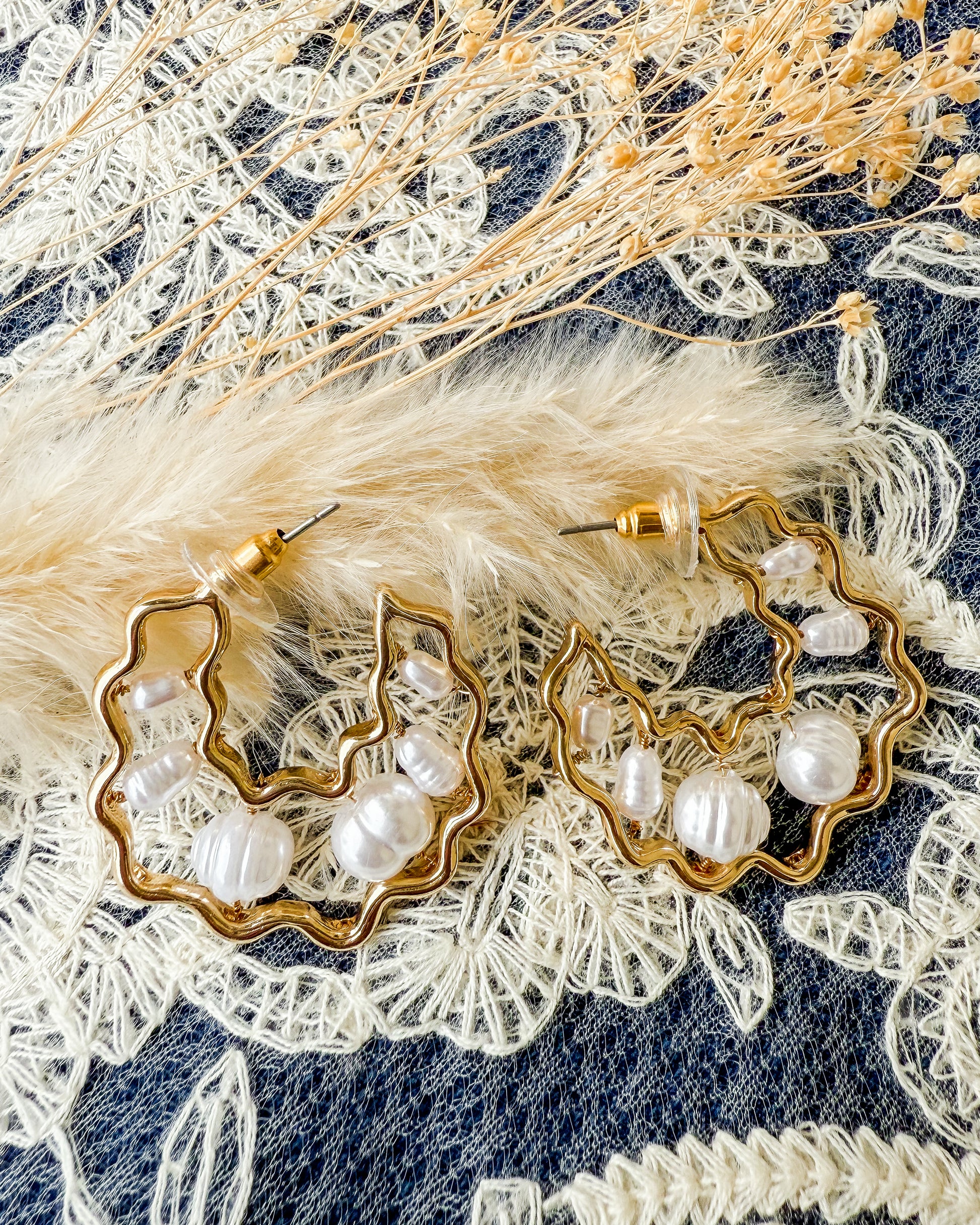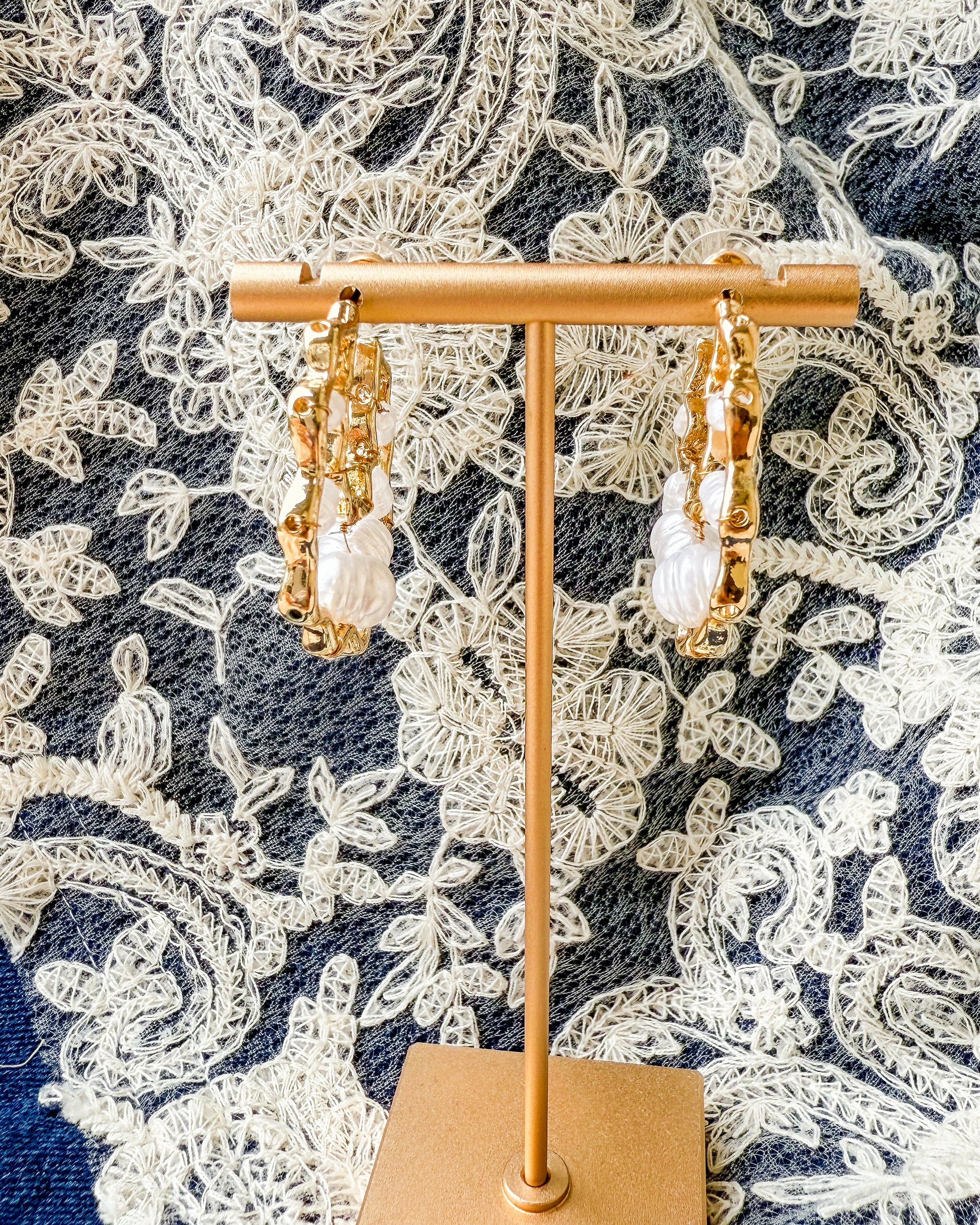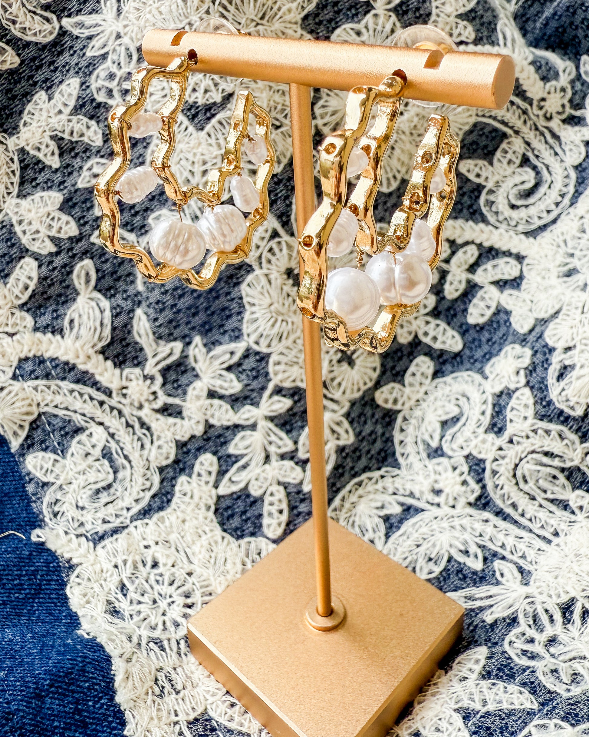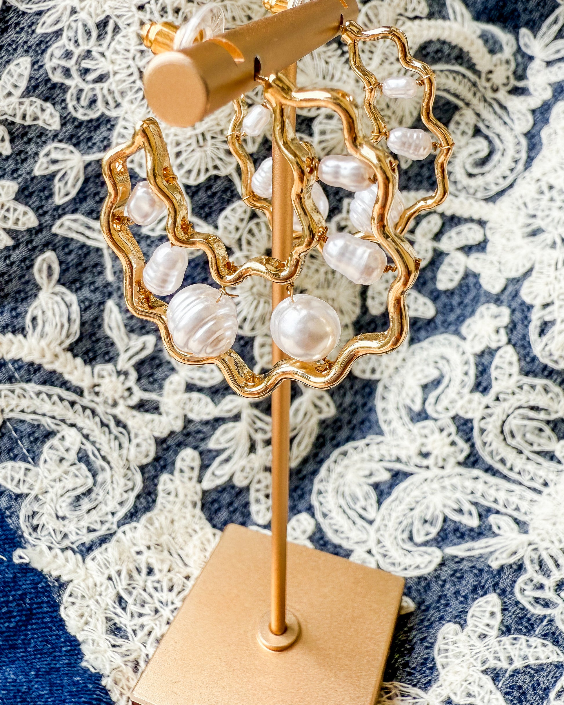 How fun are these wavy half hoops filled with pretty freshwater pearls!? Gold plated and easy to wear.