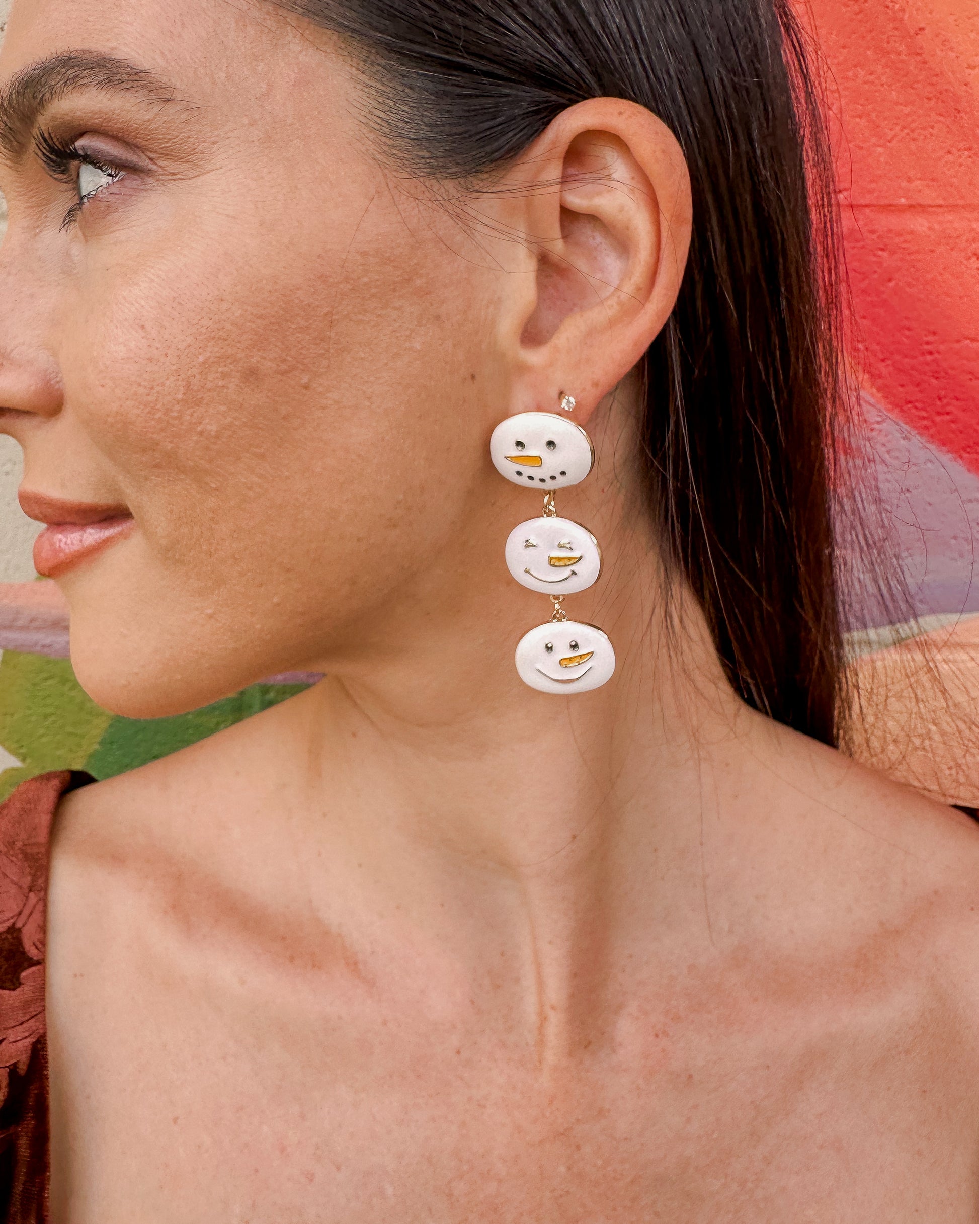 Who doesn't love Frosty The Snowman? Wear his adorable face this holiday season with these fun dangle earrings. Gold plated studs.