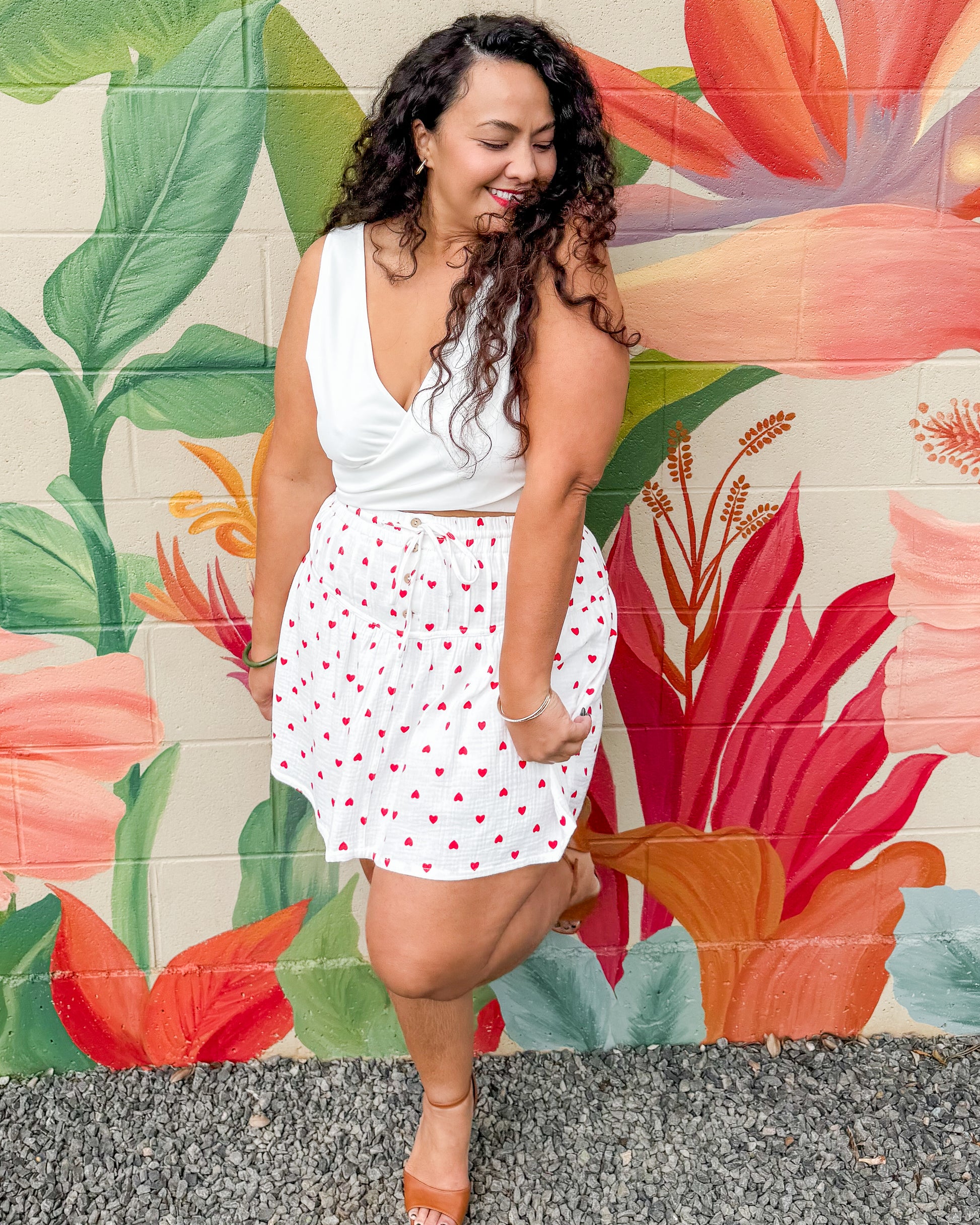 Flowy cotton gauze skort with a romantic Valentine vibe. Soft, breathable fabric drapes beautifully with a flattering flare silhouette. Perfect for warm weather styling with its convenient shorts lining. Effortlessly chic and comfortable for any occasion.