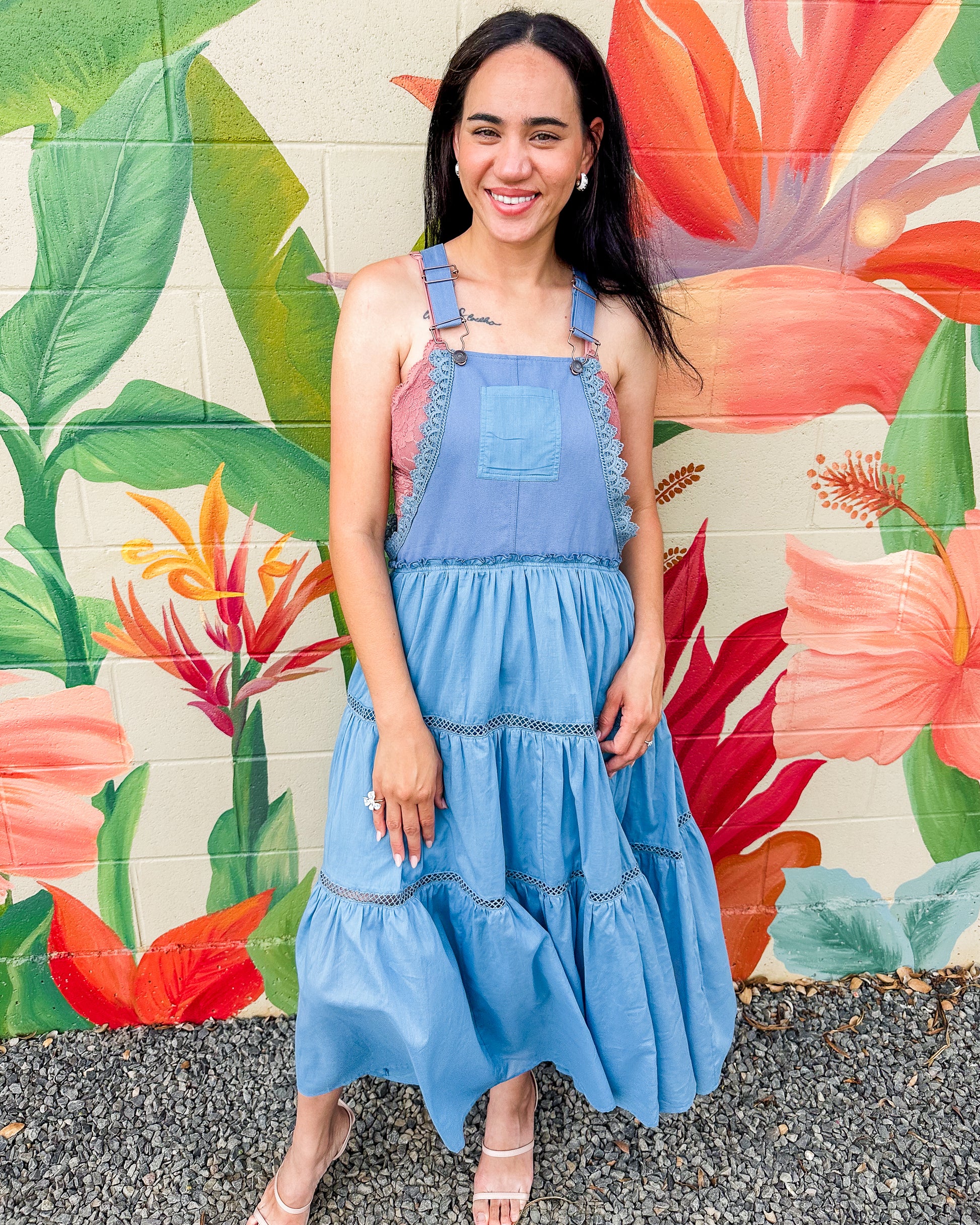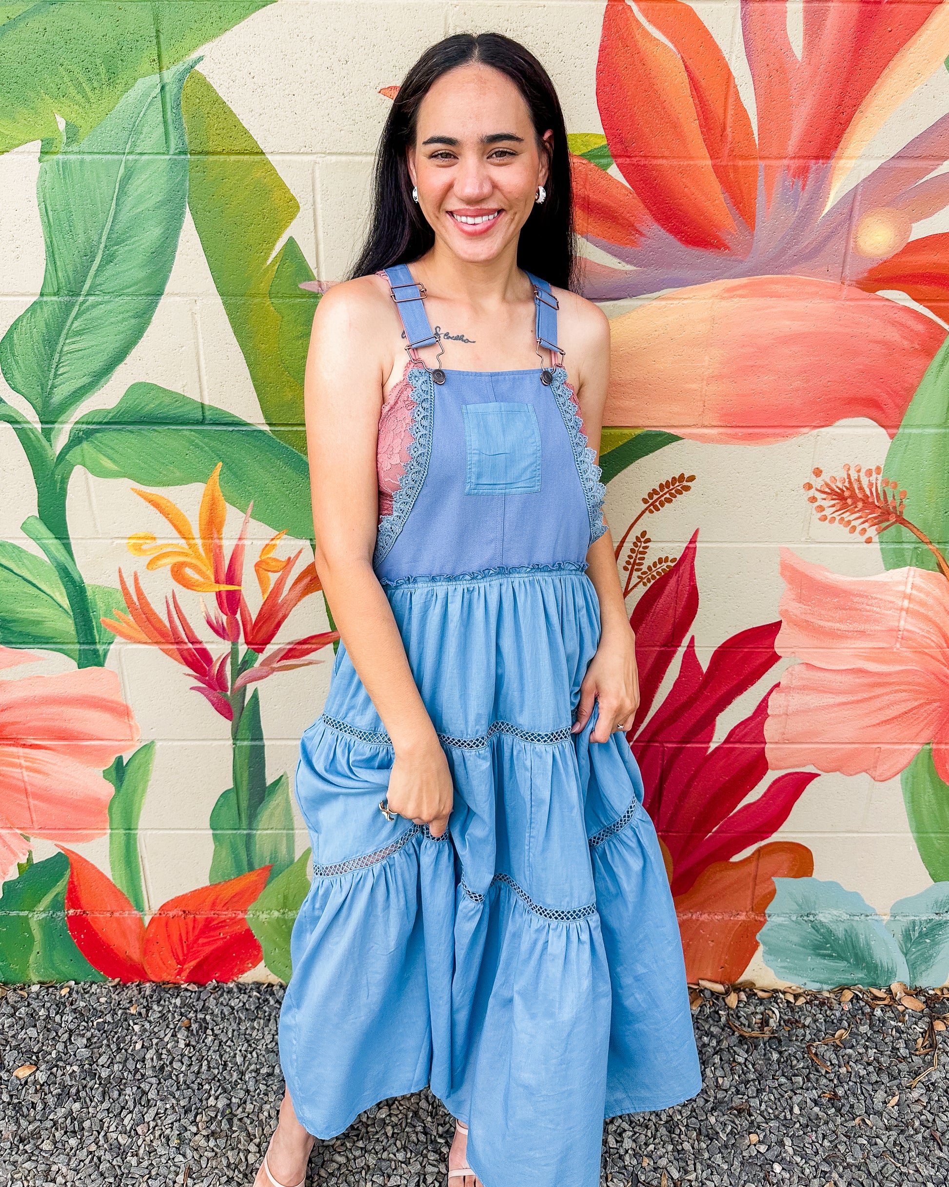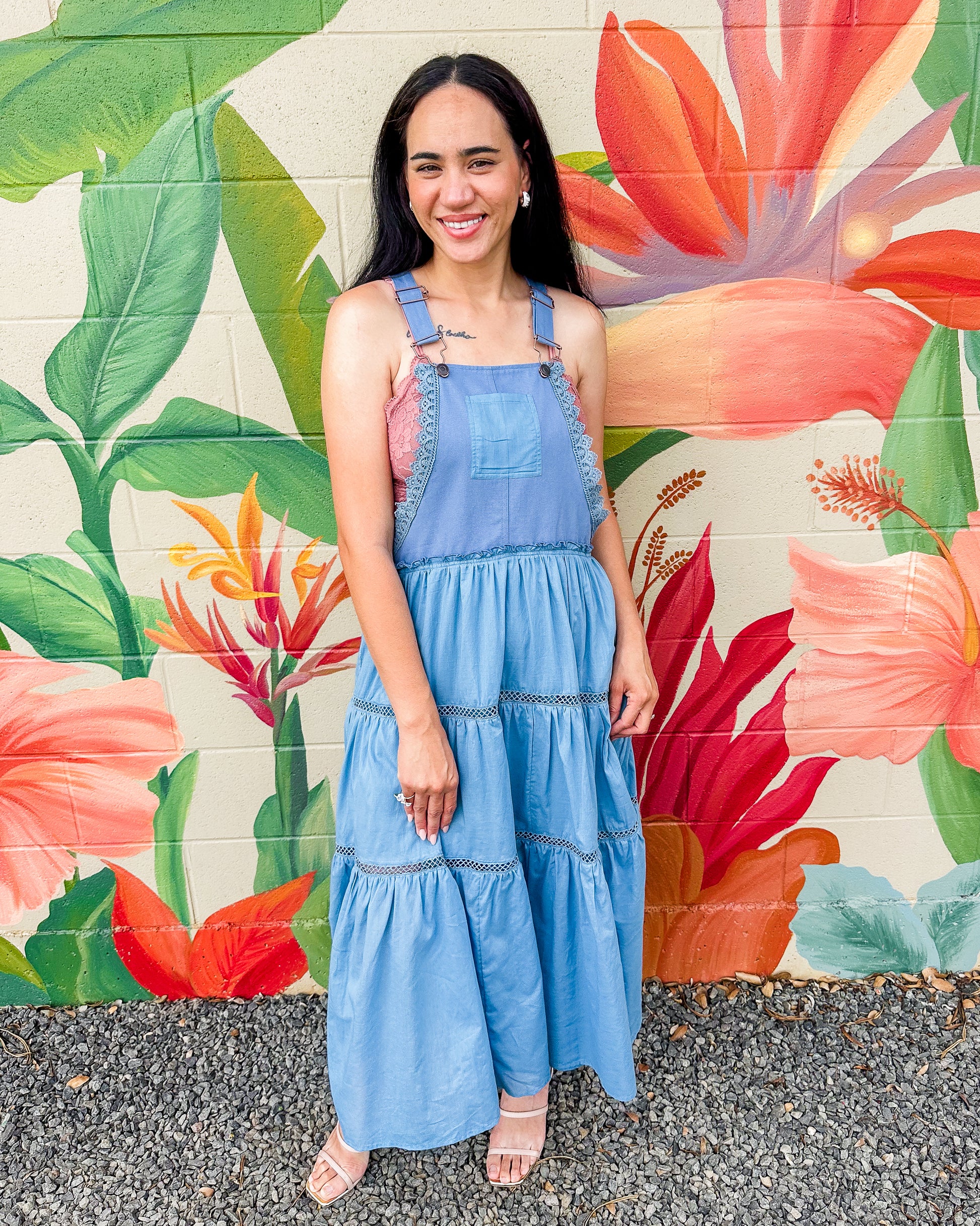 The Gerald Dress offers effortless style for any occasion. This mixed media overall dress combines comfort with island-inspired design through its relaxed bodice and flowing tiered maxi skirt. Featuring practical thick shoulder straps with hook closures and a convenient front chest pocket, it's the perfect versatile piece for your wardrobe. Embrace casual elegance all season long.