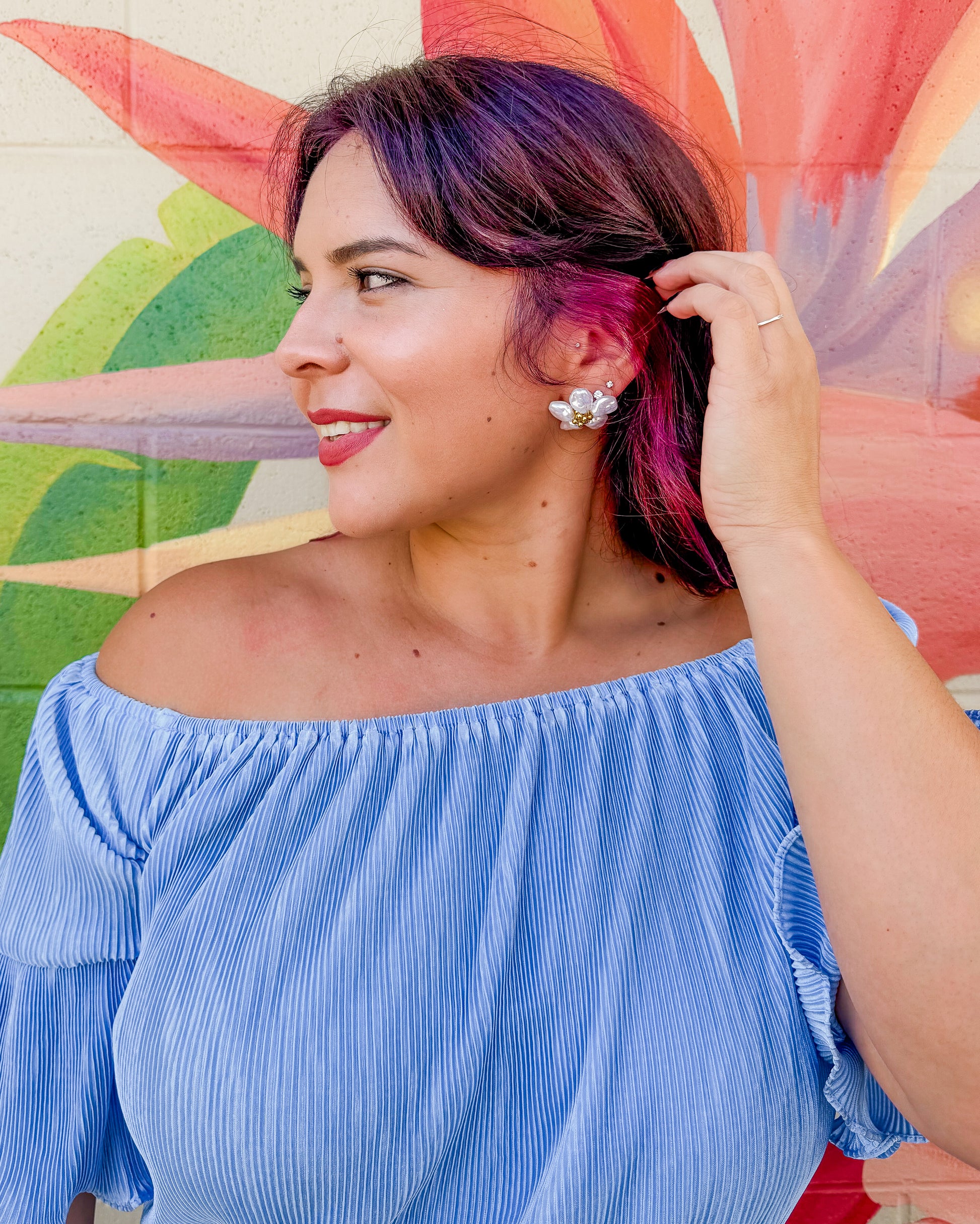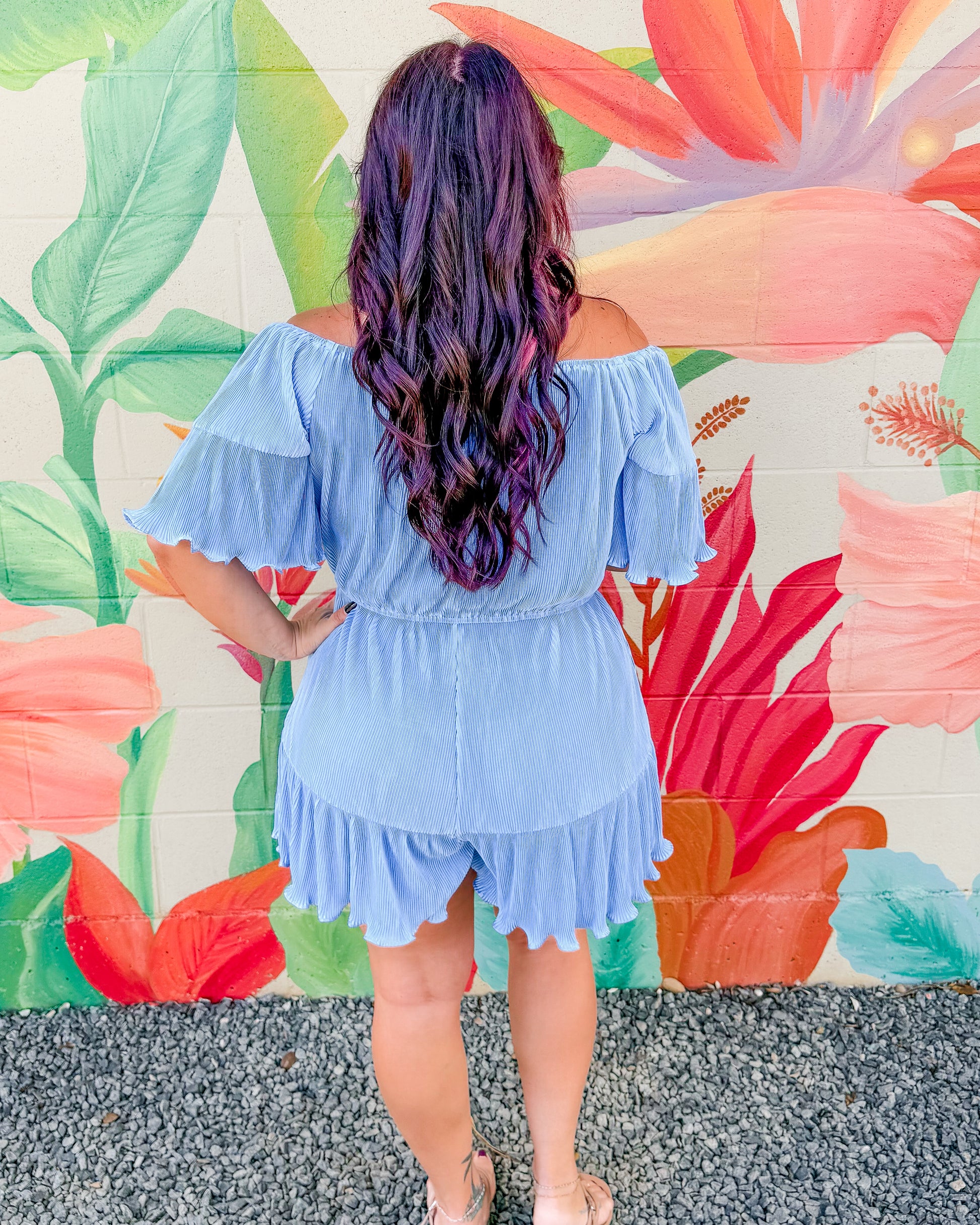 Look festive and fashionable in this beautiful off the shoulder Gloria Romper. Made with pleated fabric and a delicate ruffle hem, this romper is perfect for any special holiday occasion.