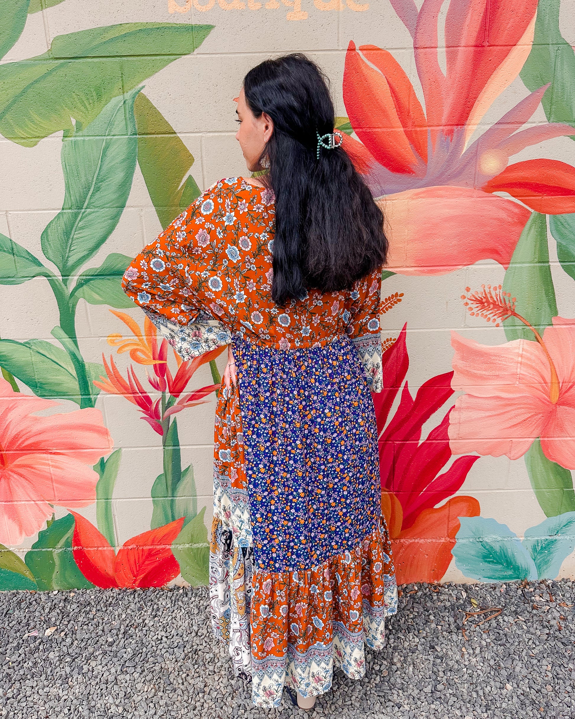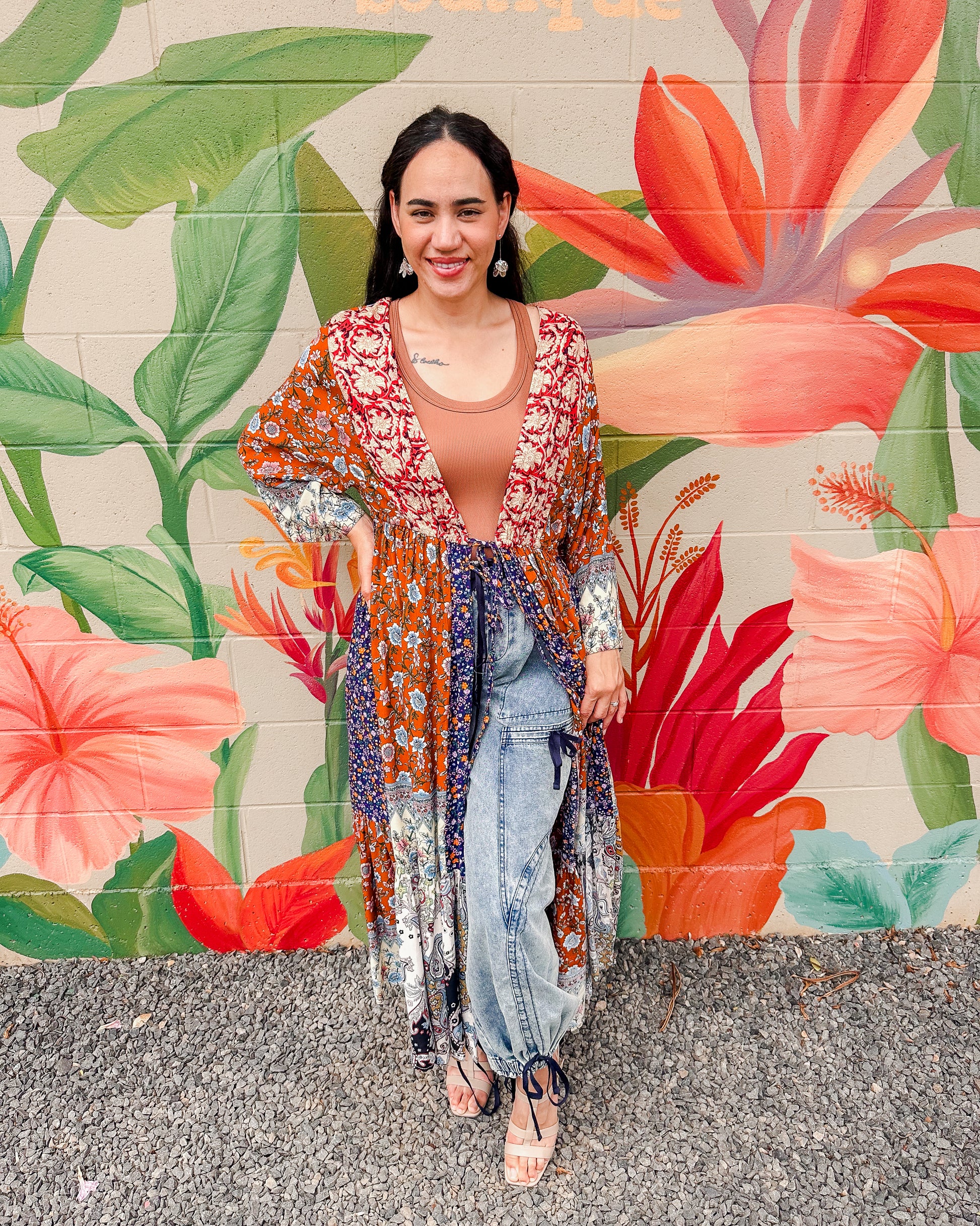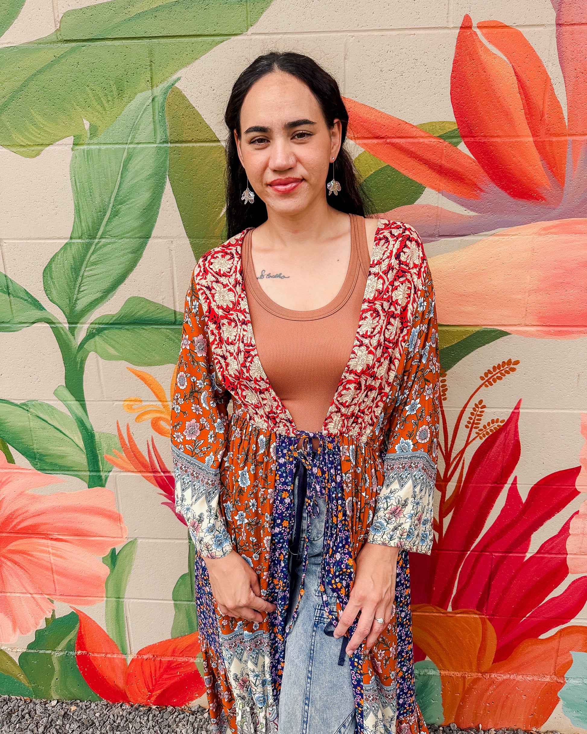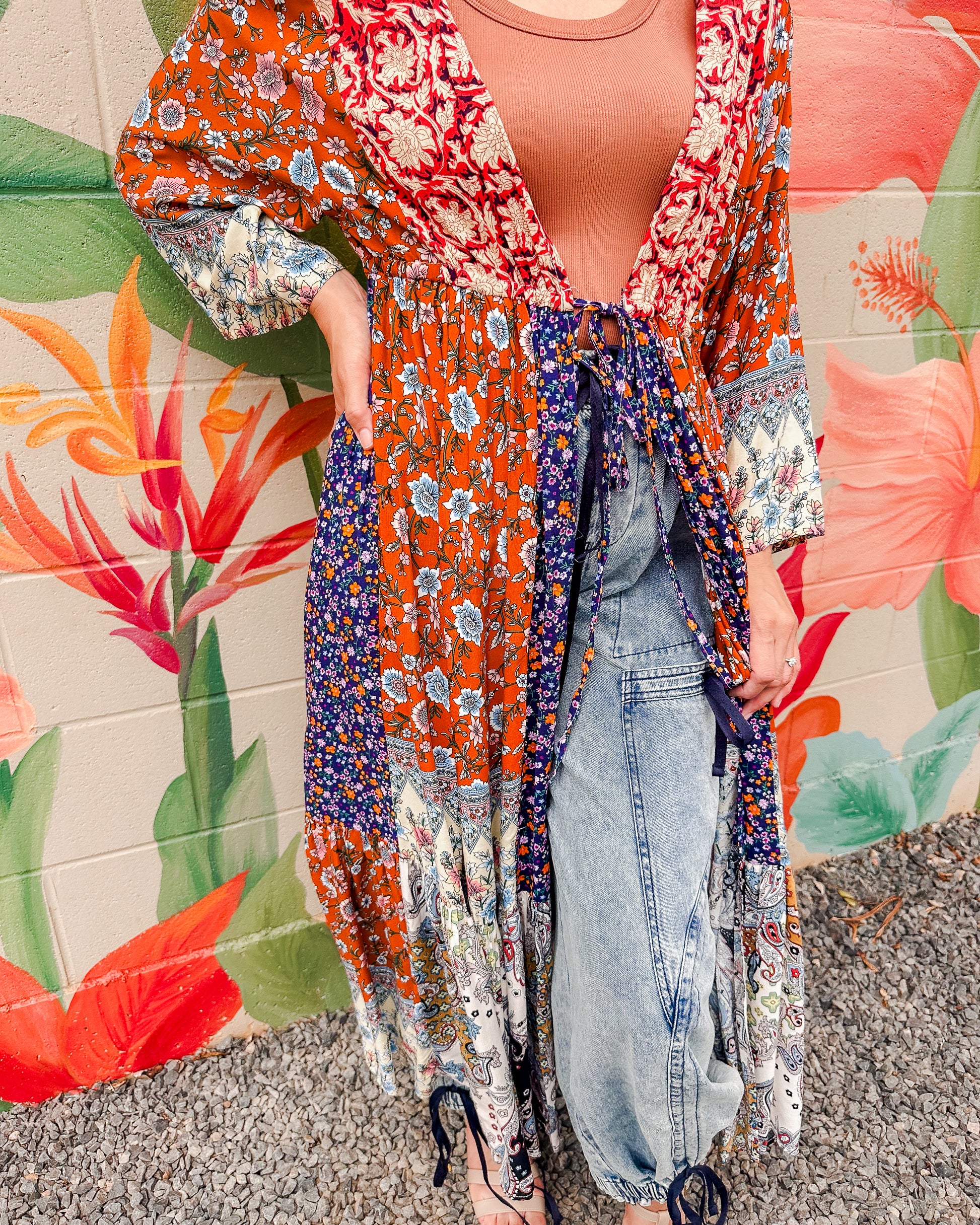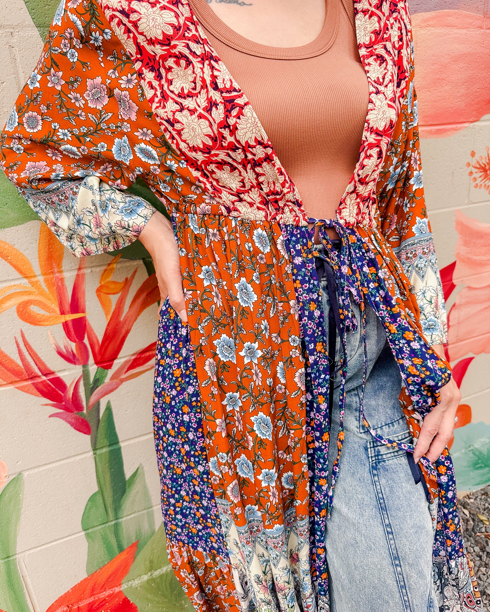 Effortlessly elevate your outfit with the Henrietta Kimono. This versatile duster features a deep v-neck and a mixed print design, with a front tie for a personalized fit. Perfect for adding a touch of style and sophistication to any look.