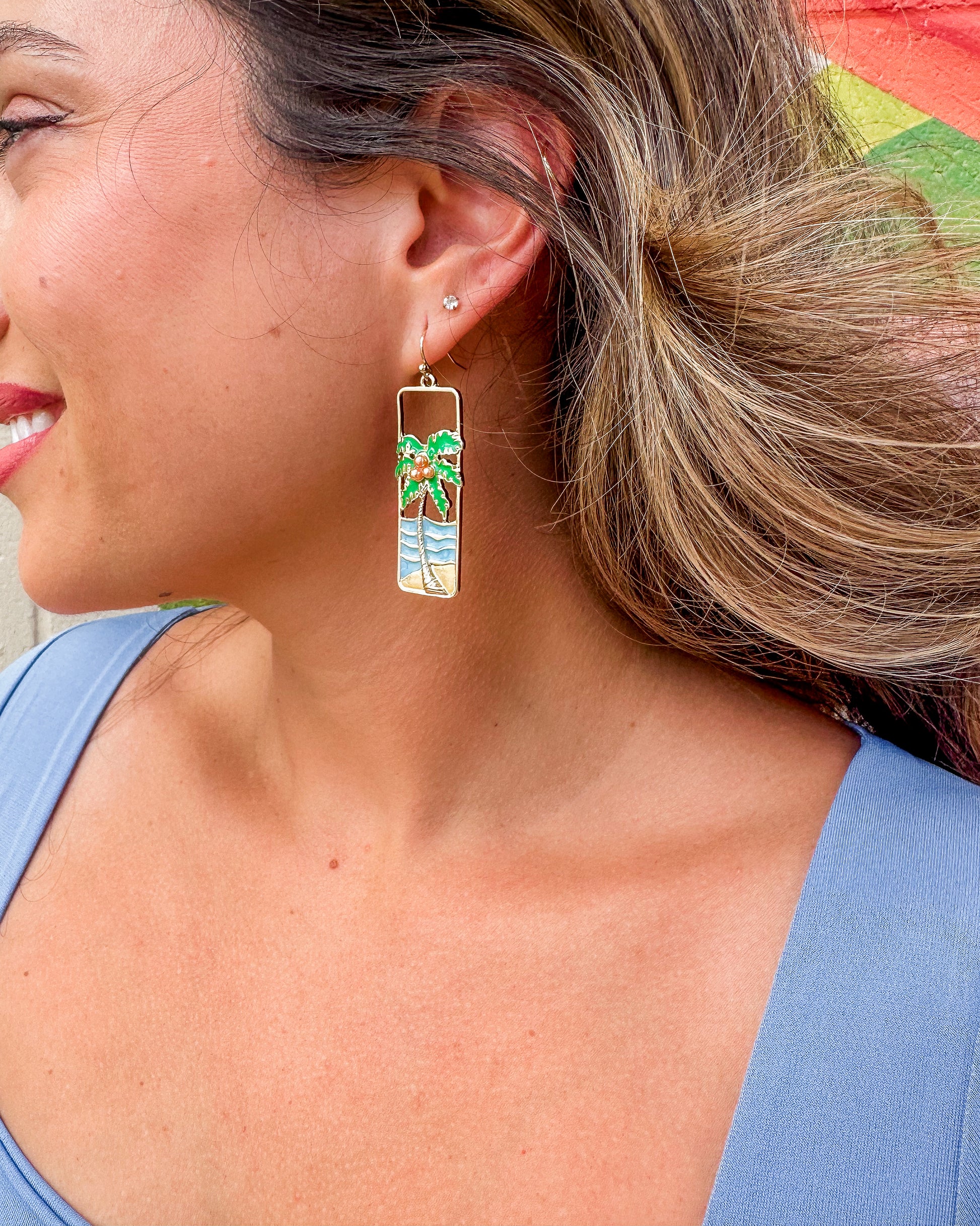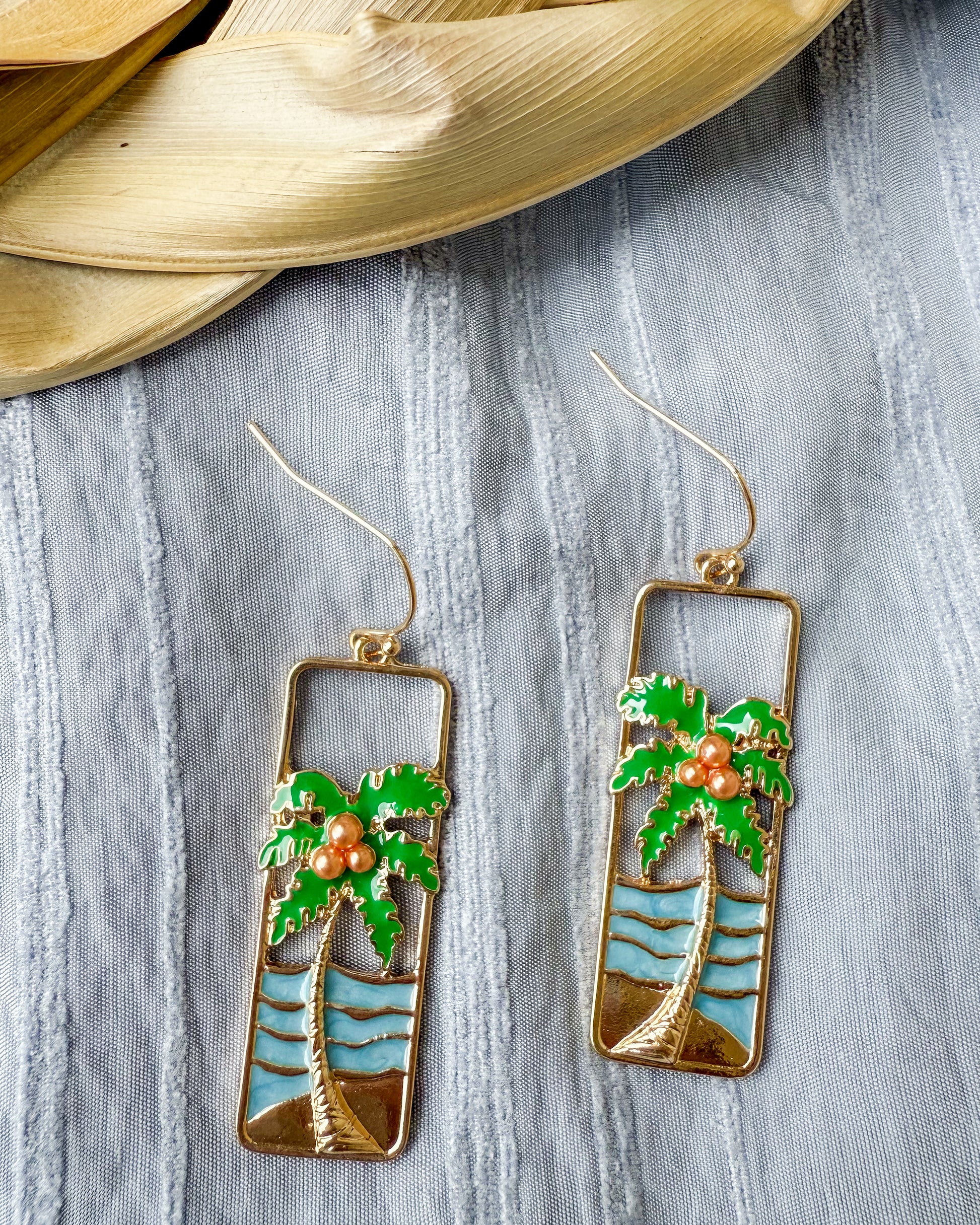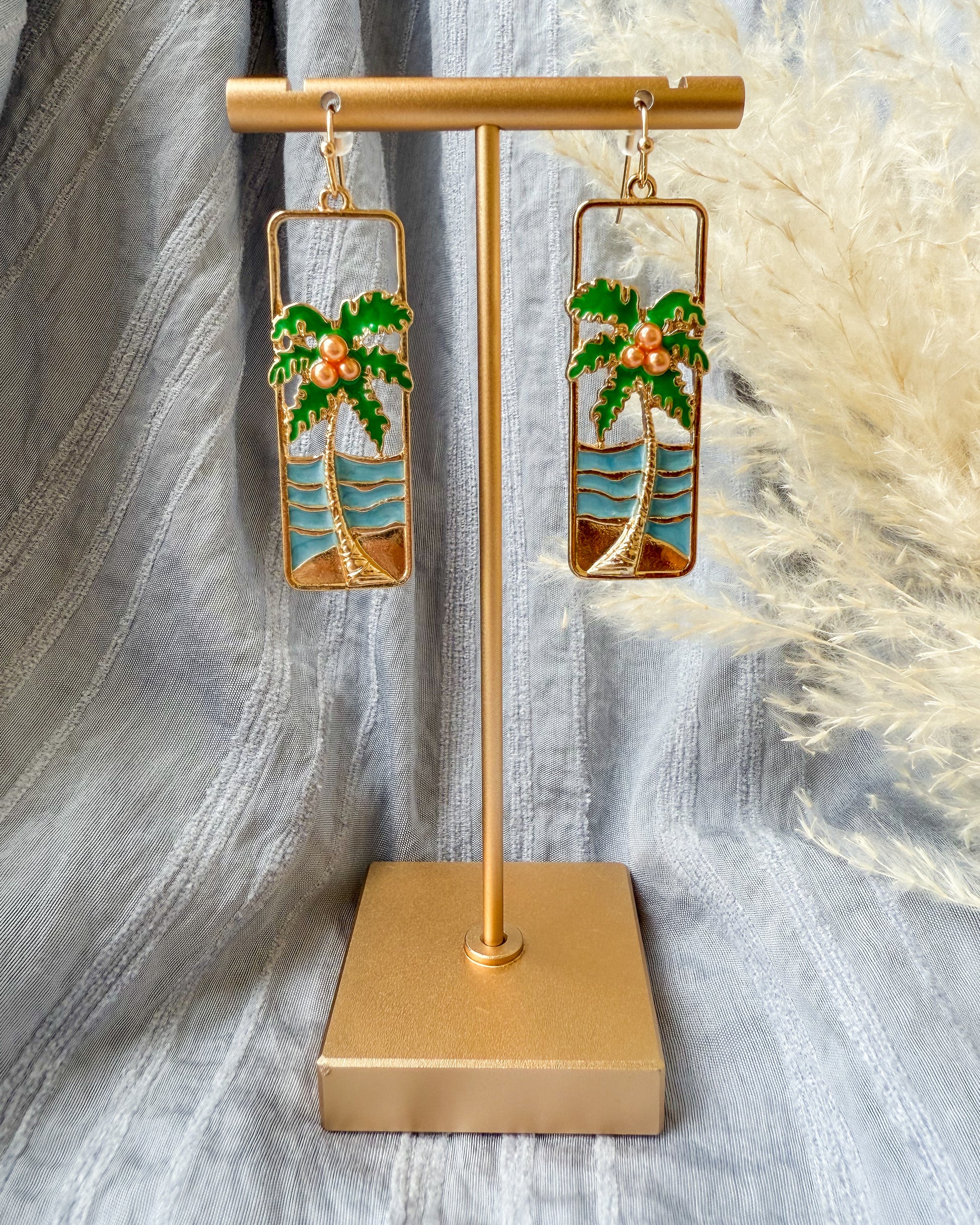 How fun are these cute, tropical scenic earrings? Gold plated, adorned with the dantiest rose gold pearls (as coconuts). Hook earrings.