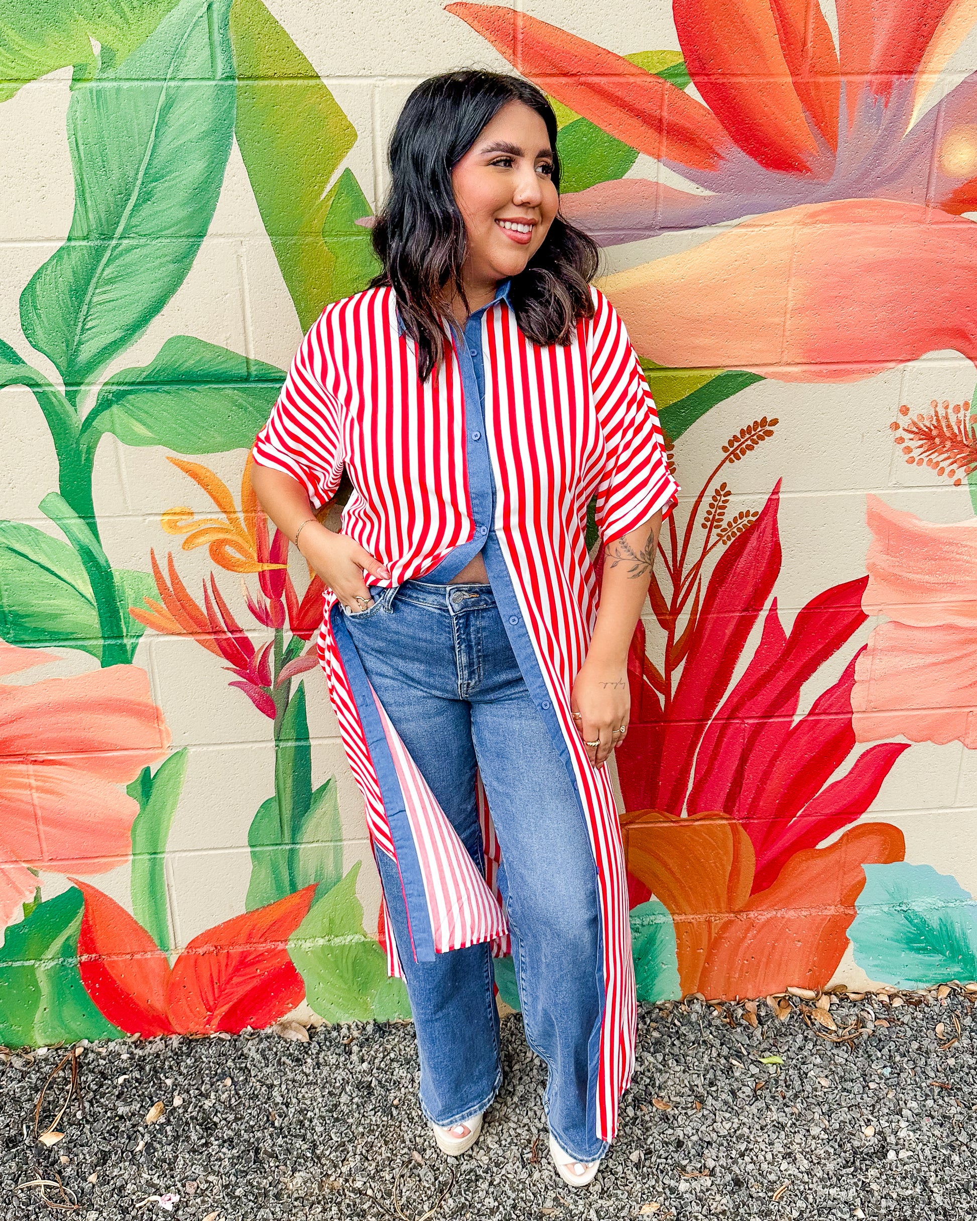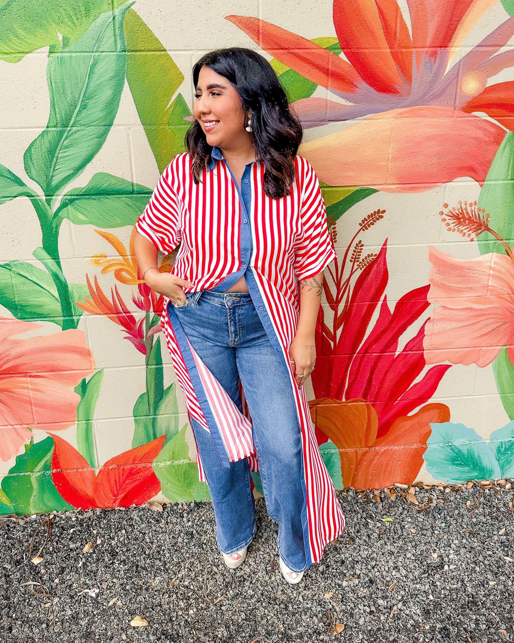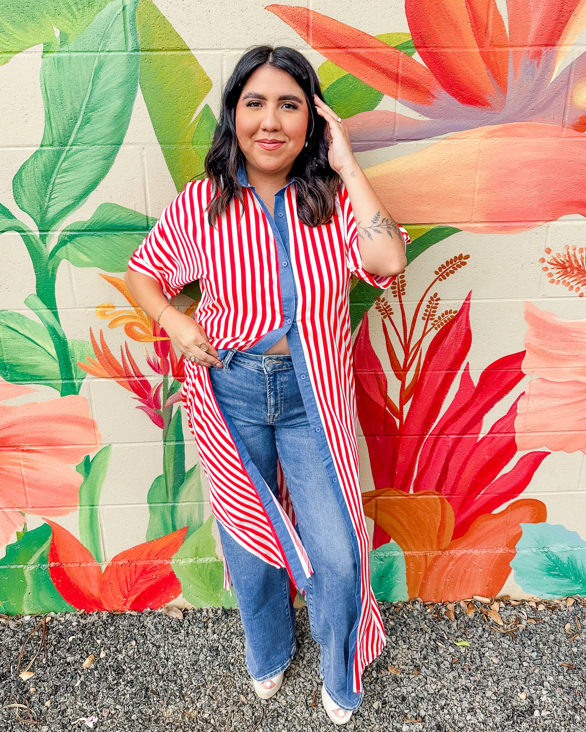 The Janine Shirt Dress features classic stripes and a button-down front, offering a relaxed yet polished look. Its lightweight fabric ensures comfort throughout the day, making it perfect for casual outings or effortless office wear. The timeless design allows for easy styling, providing a versatile addition to your wardrobe.