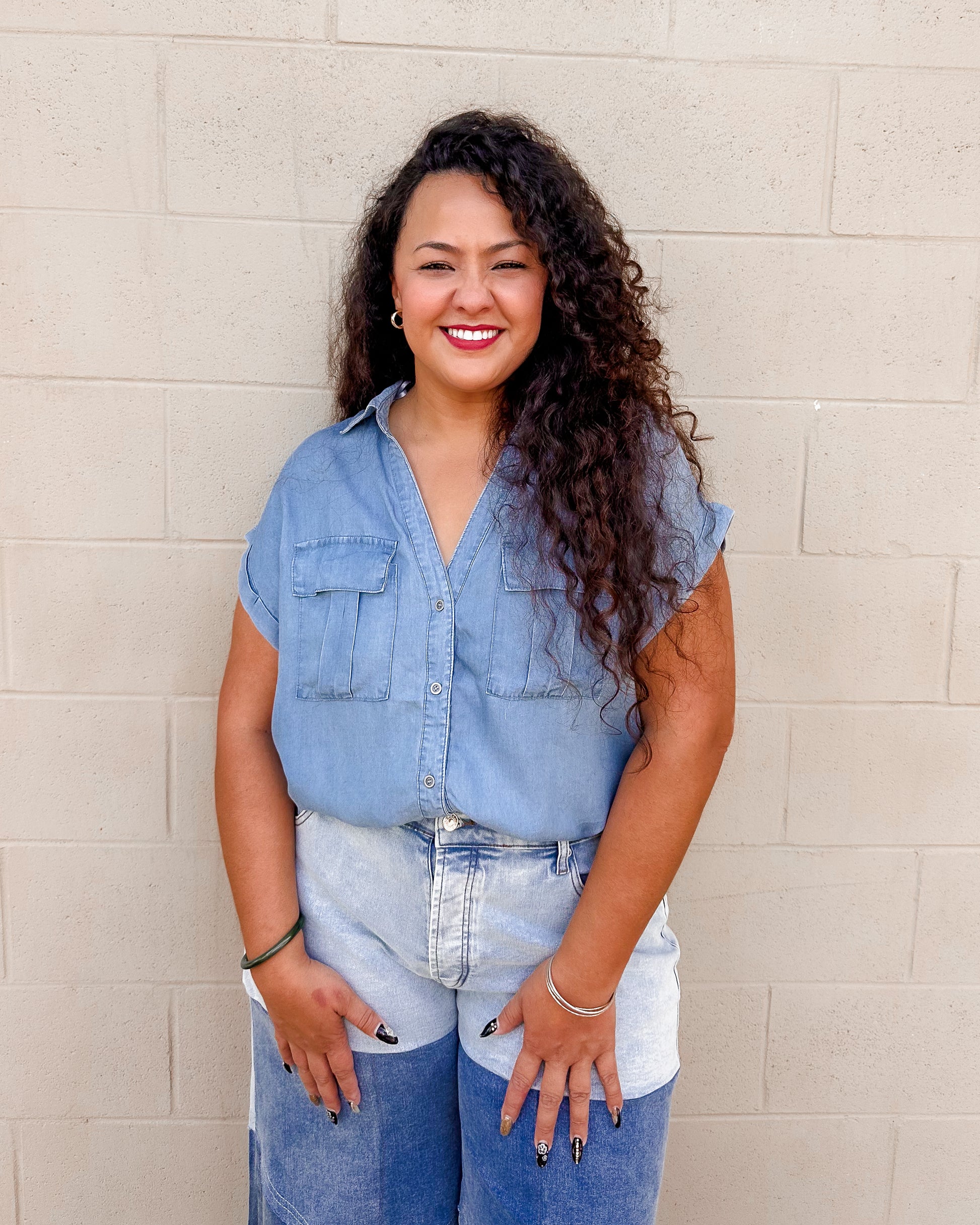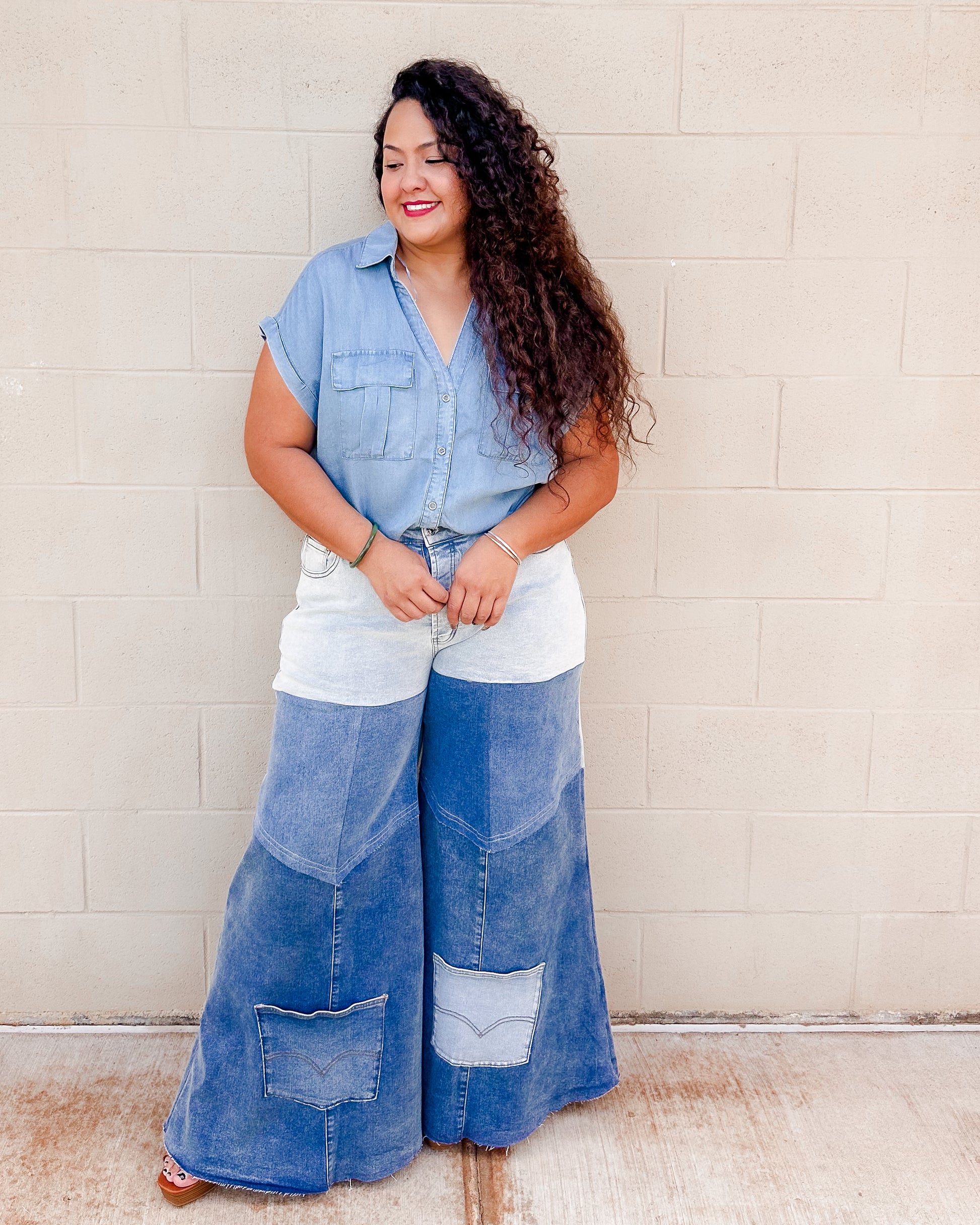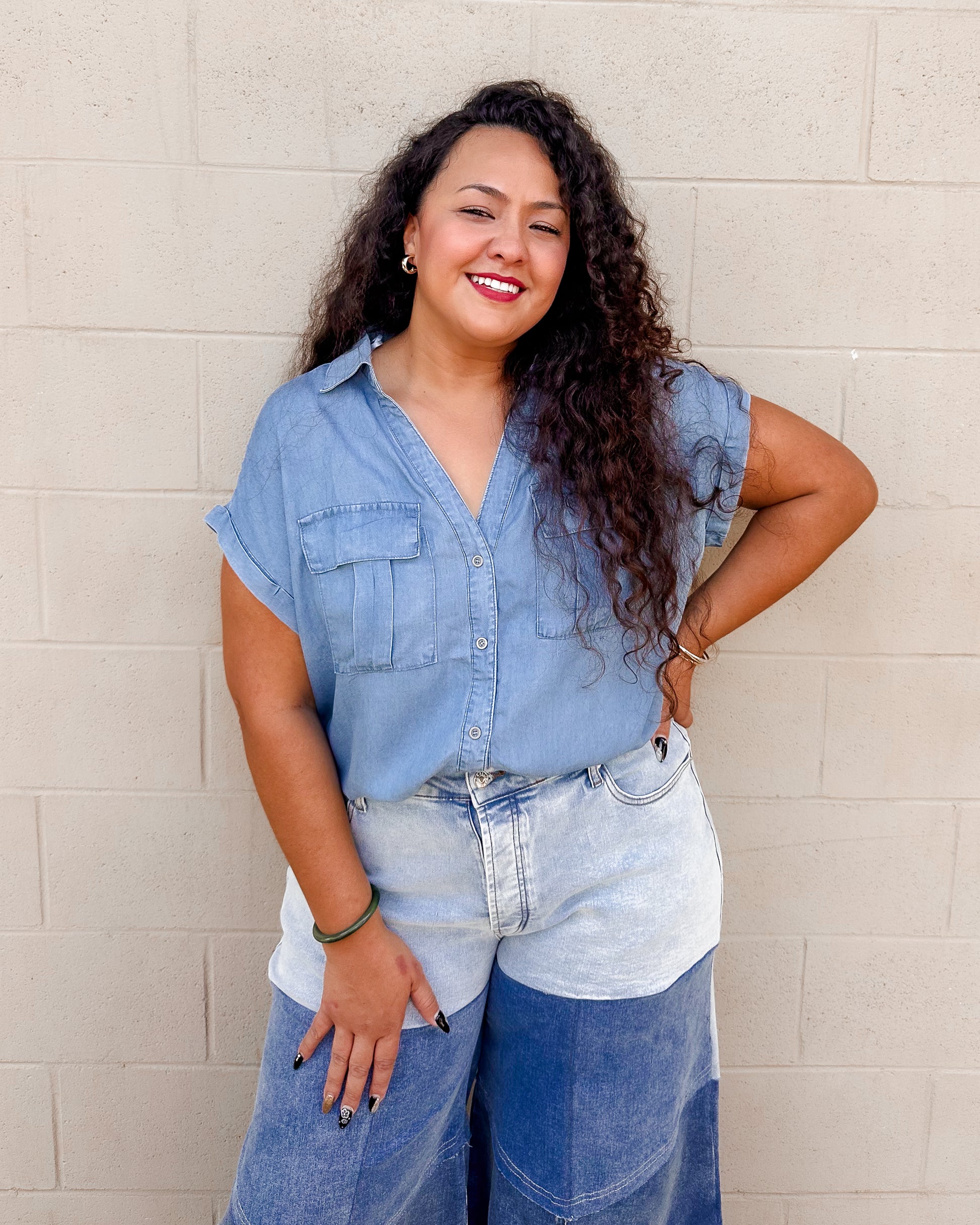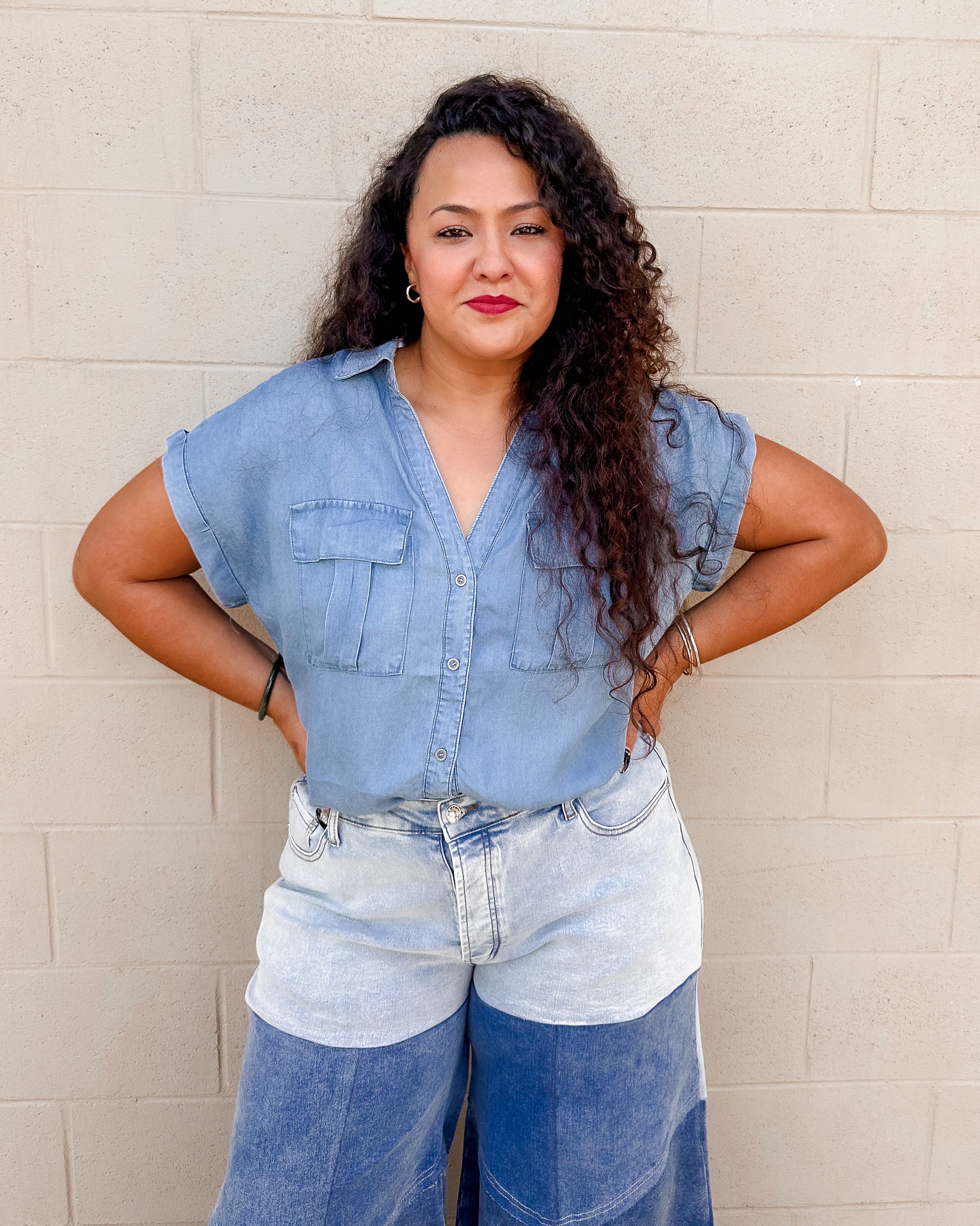 This short-sleeve denim top features a classic button-down design for a timeless look. Crafted from comfortable denim fabric, it offers a relaxed fit that suits everyday wear. Perfect for layering or wearing on its own, it adds a casual, effortless touch to your wardrobe.