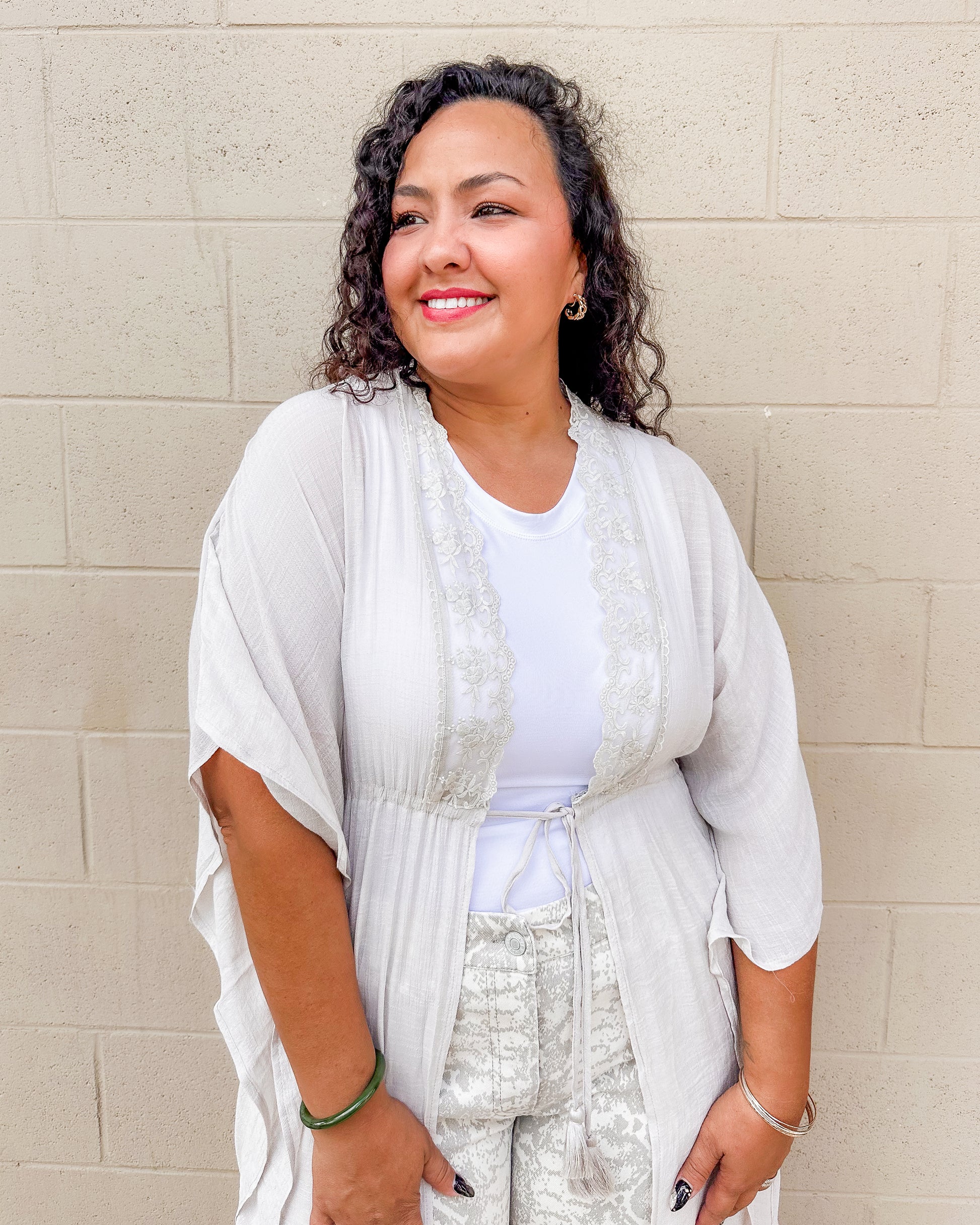 The Jed Maxi Robe offers effortless elegance with its delicate lace trim at the neckline and a graceful tie front. Its flowing silhouette ensures comfortable wear, making it perfect for relaxing moments or casual outings. This robe combines subtle details with relaxed style for a timeless, calming look.