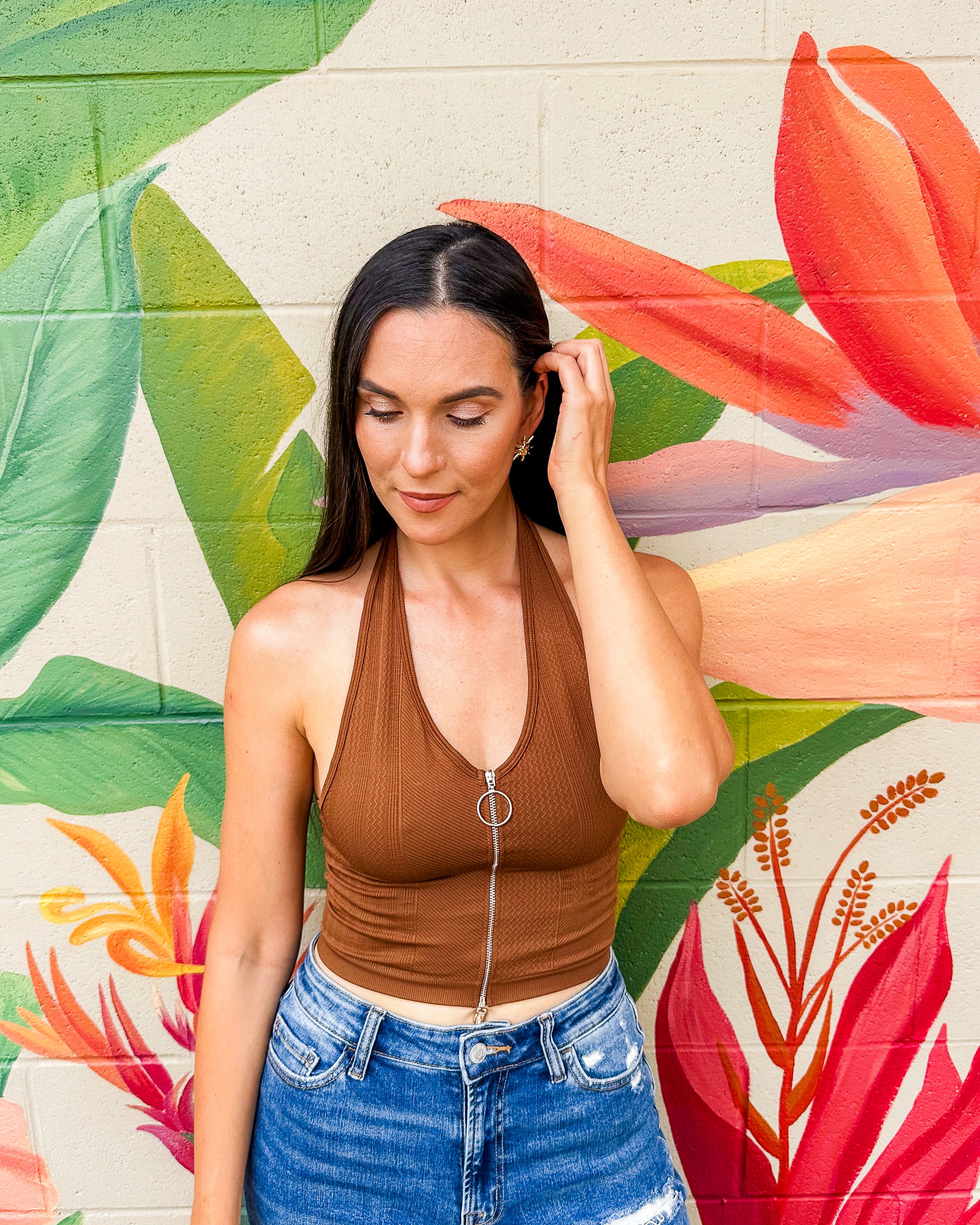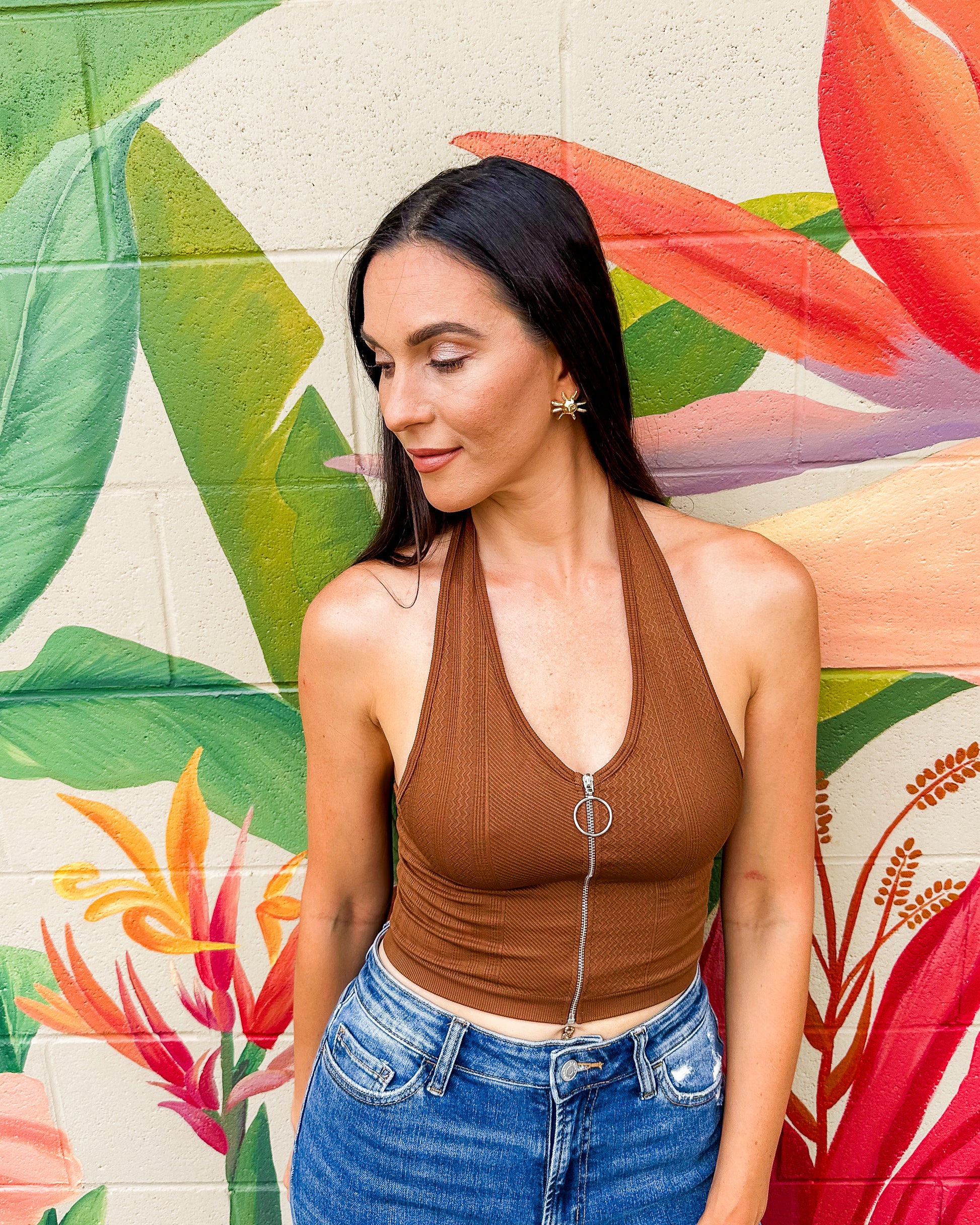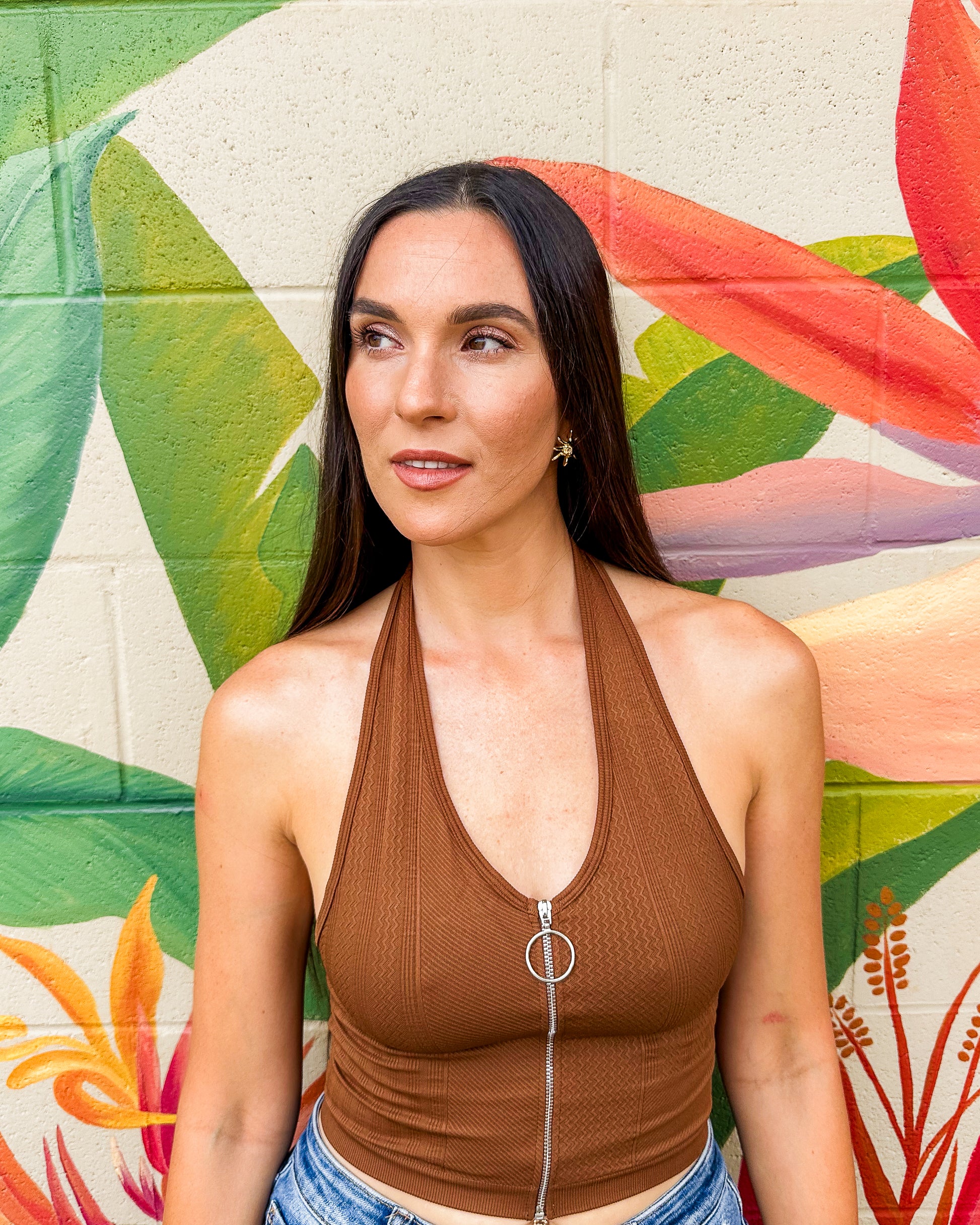 The Jermaine Tank offers a textured fabric design with a flattering halter neckline. This cropped silhouette features a distinctive o-ring zipper detail at the center, creating a versatile piece that transitions effortlessly from day to evening wear. The thoughtful design combines comfort with subtle sophistication.