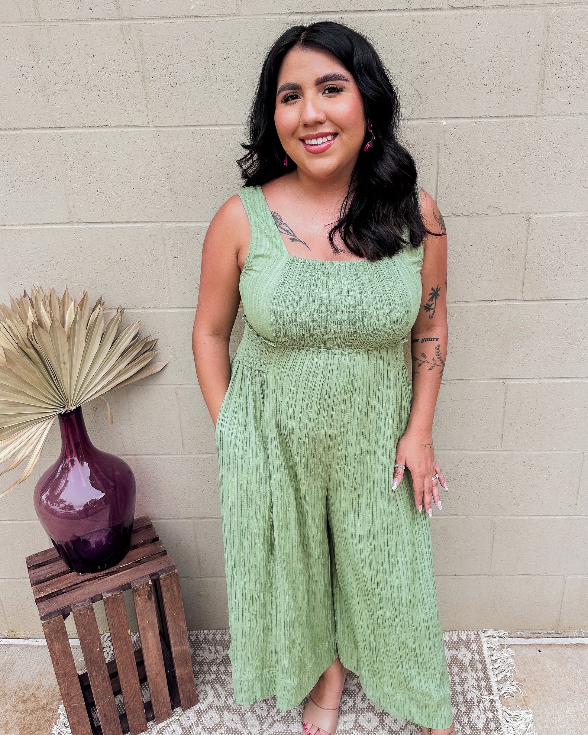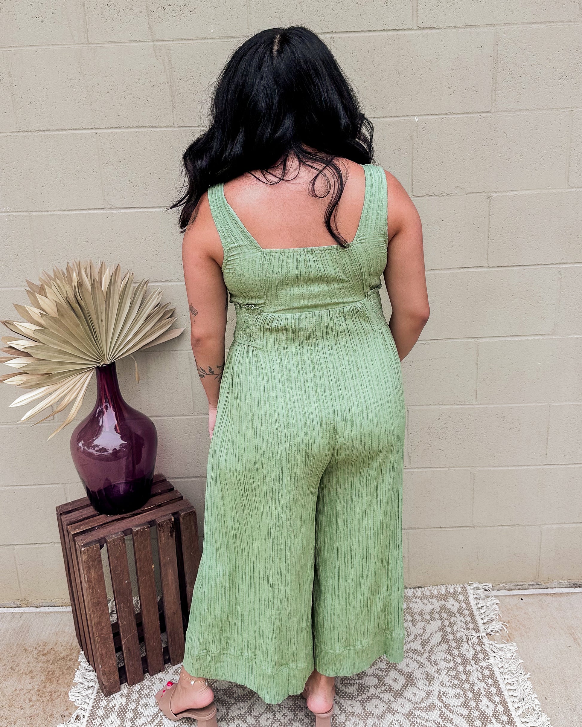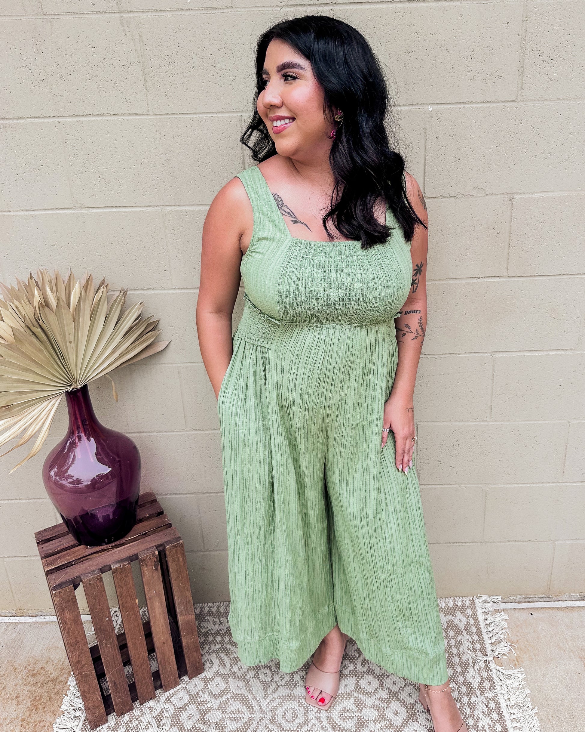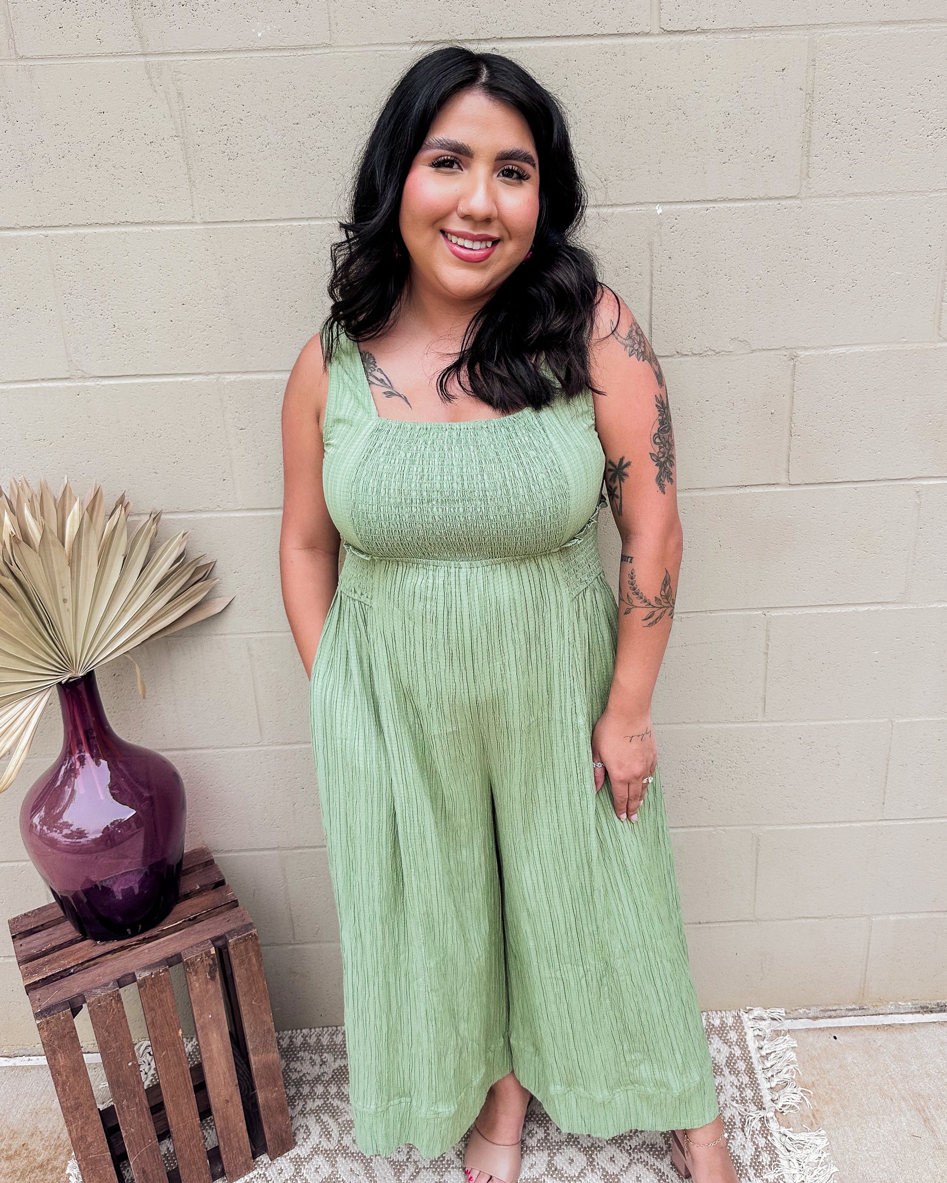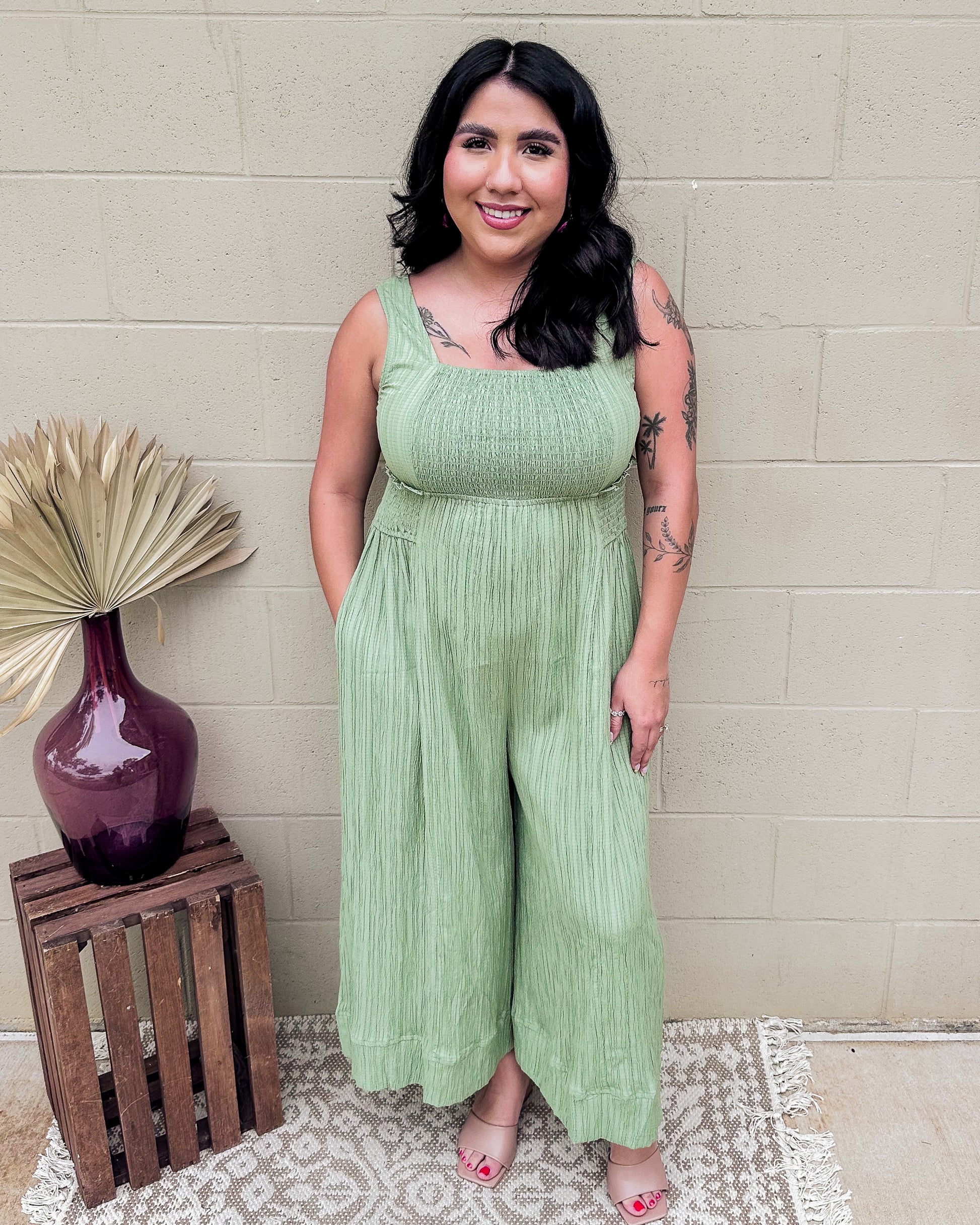 The Jessenia Jumpsuit features a textured crinkled fabric design with a flattering wide leg silhouette. The thoughtfully smocked front and waist create a comfortable, adjustable fit that moves with your body. Perfect for effortless style that transitions seamlessly from day to evening occasions.