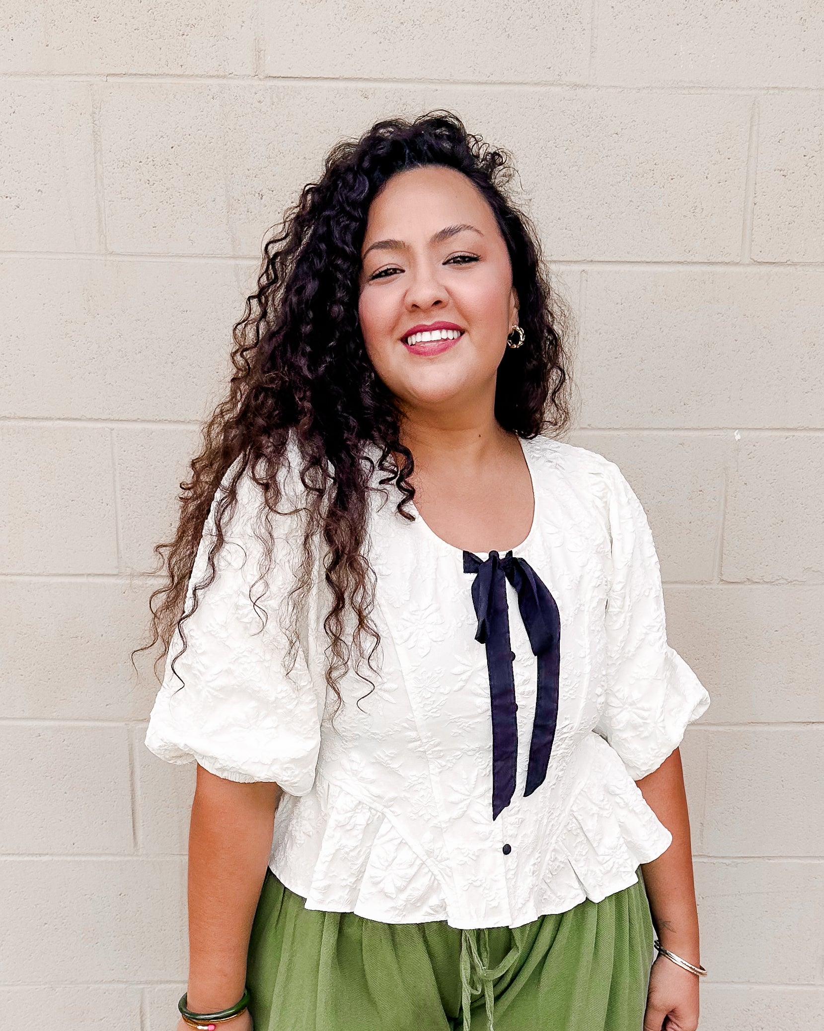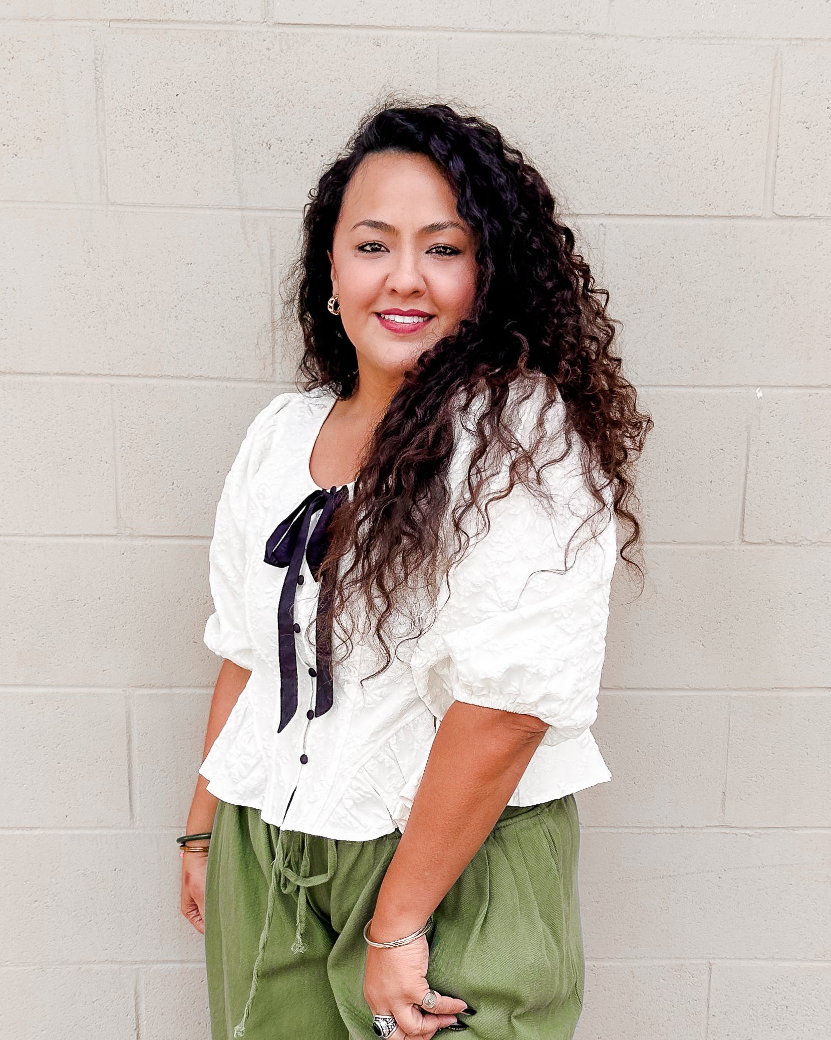 The Jonathan Blouse features a jacquard fabric with a flattering contour shape, highlighted by a delicate contrast ribbon and elegant self-covered buttons. This blouse combines subtle texture with refined details for a graceful, comfortable wear.