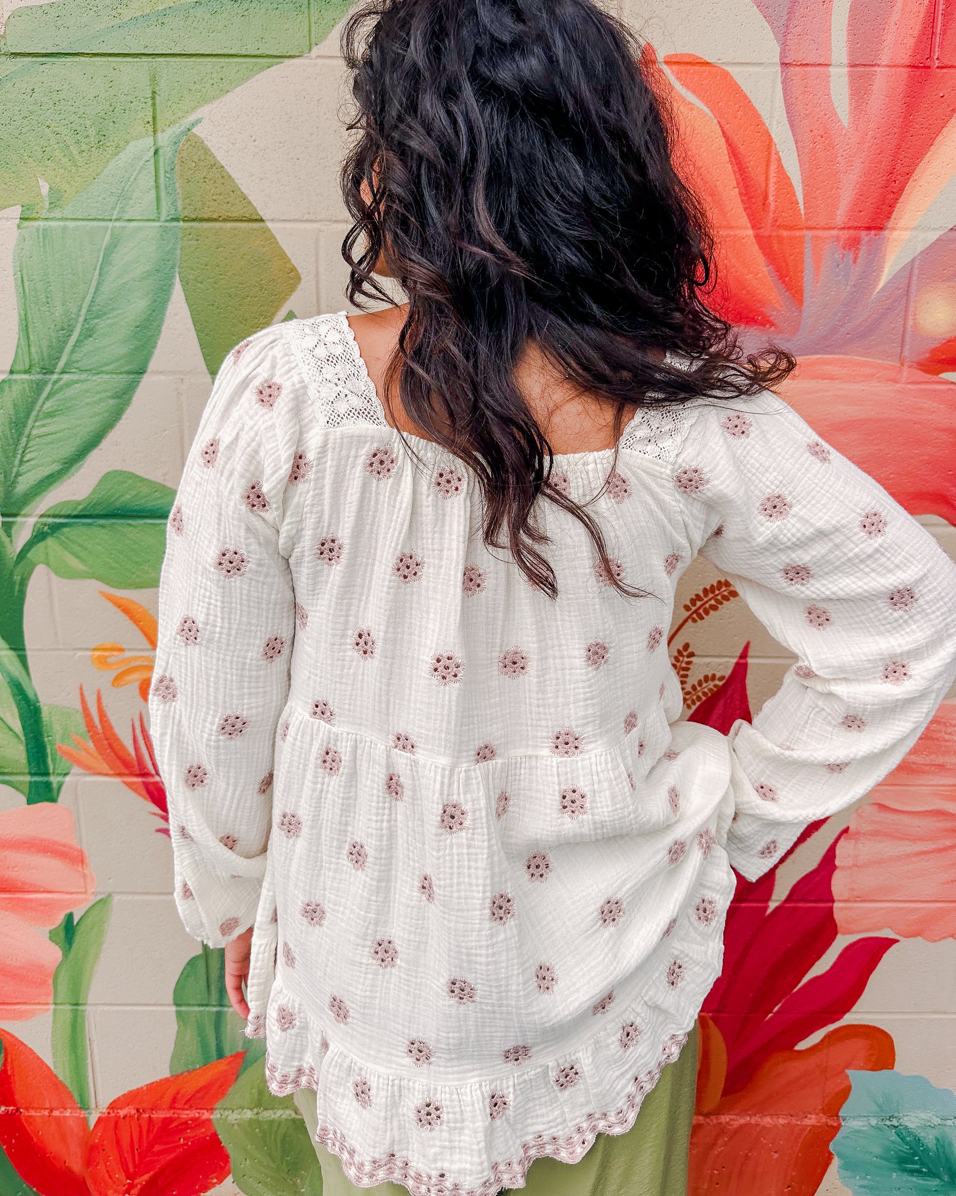 The Julian Blouse features delicate eyelet embroidery with a charming floral design on soft cotton gauze. Its relaxed fit and square neckline create an effortlessly chic silhouette, while scalloped crochet trim and a sheer bow tie detail add feminine touches. Perfect for layering or wearing solo during warmer months.