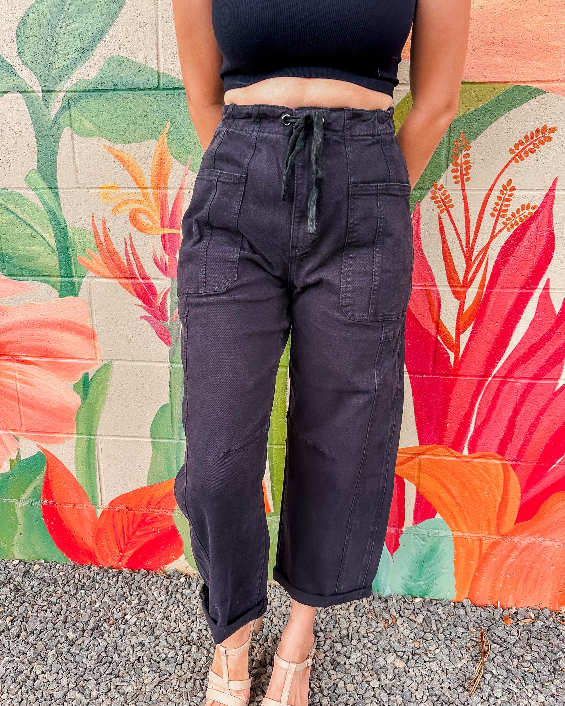 The Karlotta Jeans offer a relaxed yet structured fit with their high-rise waist and wide barrel-cargo style. Featuring a convenient string tie and cuffed hems, these jeans combine comfort with casual style. Perfect for everyday wear, they add effortless shape and versatility to your wardrobe.