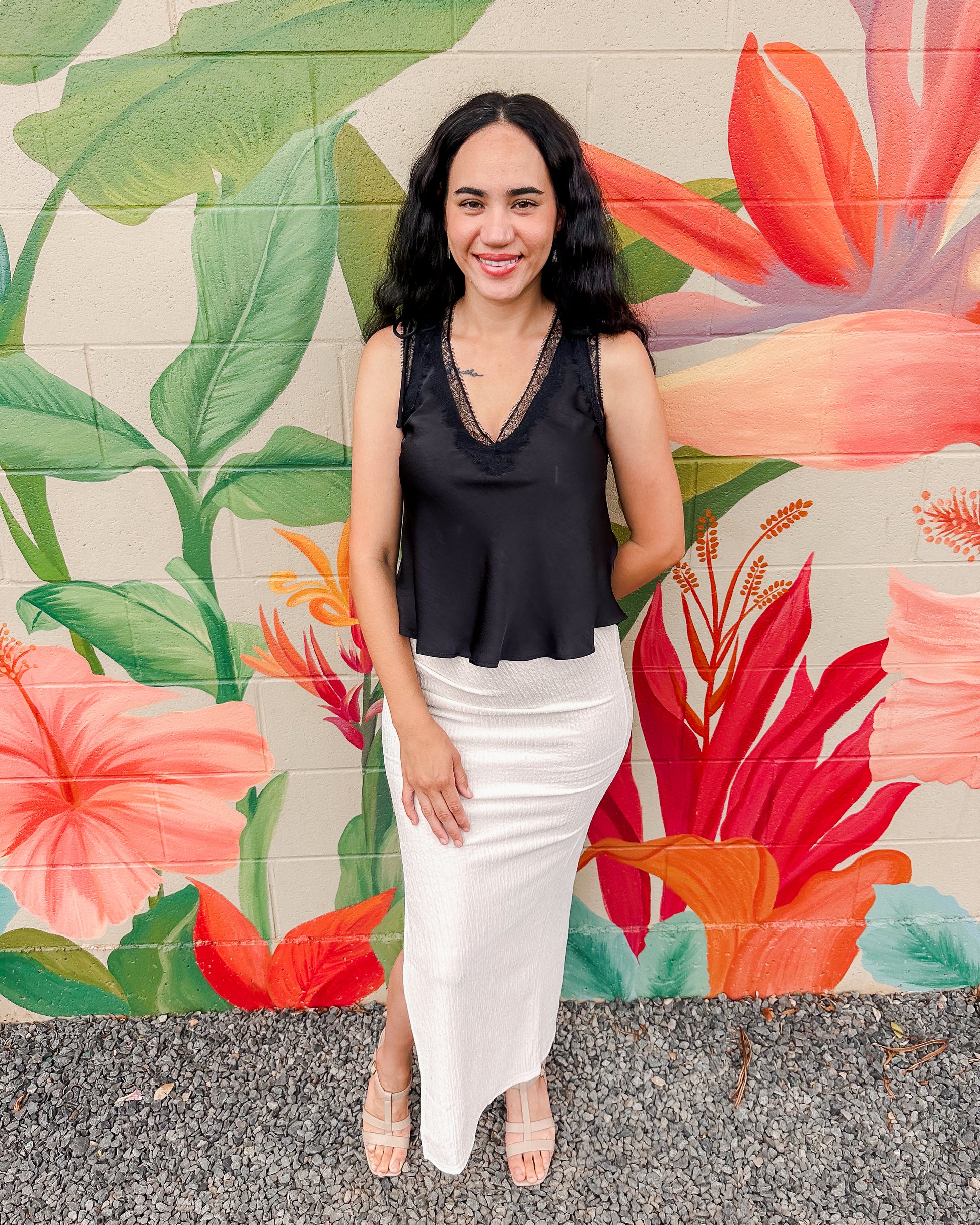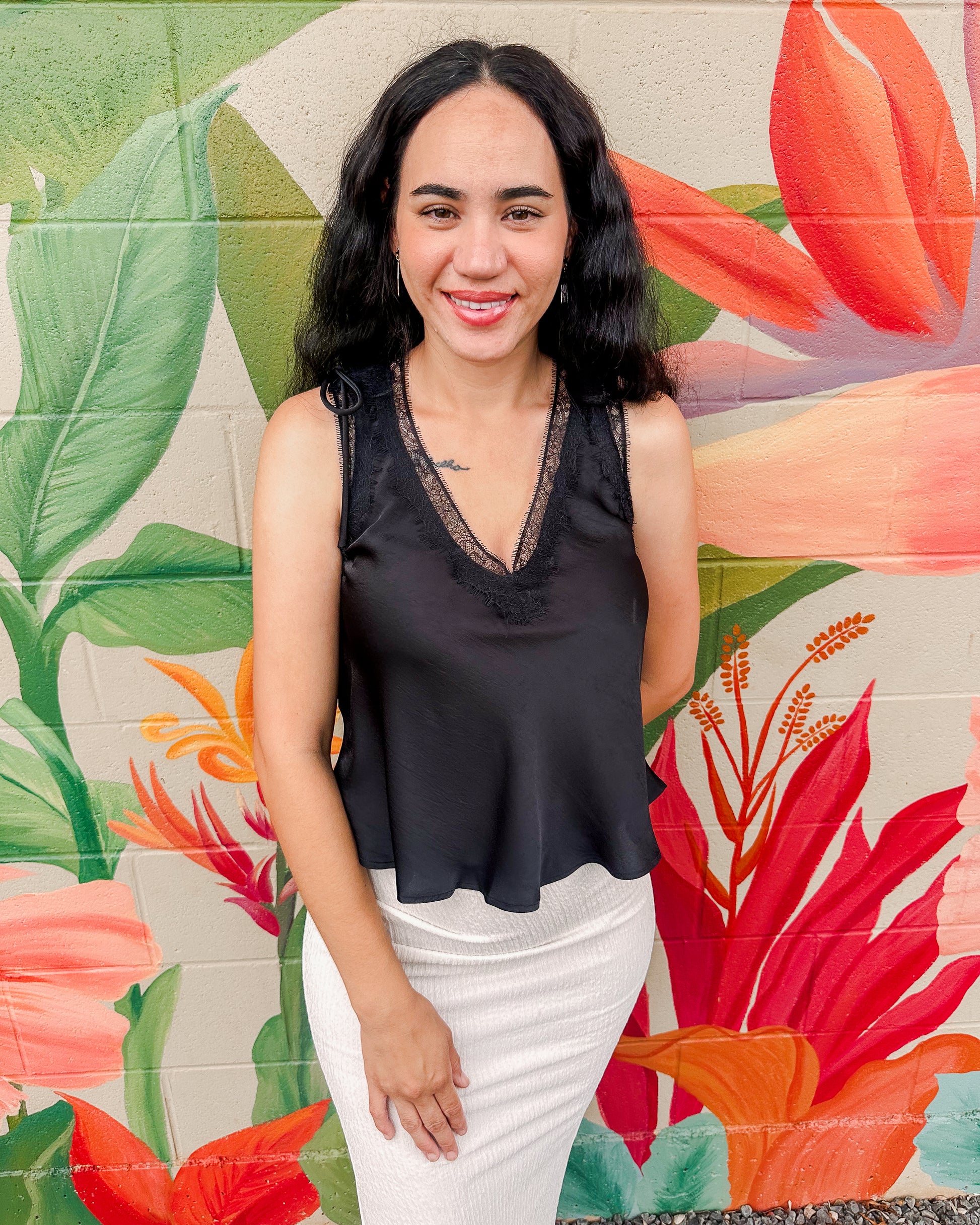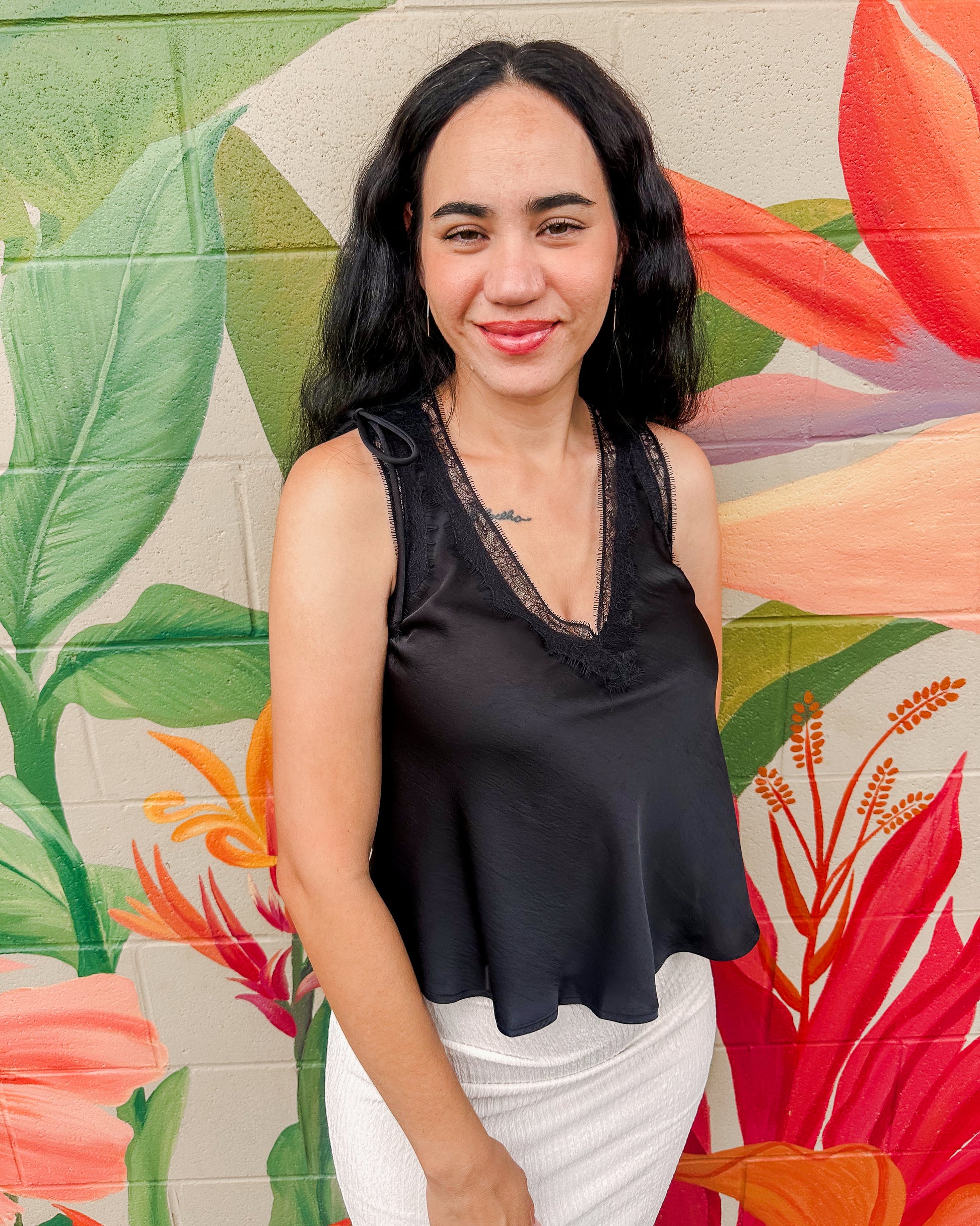 The Kiki Top features a smooth satin camisole design enhanced with delicate lace details and adjustable string ties at the shoulders. Its lightweight fabric offers gentle comfort, making it ideal for layering or wearing on its own for a relaxed yet elegant look.