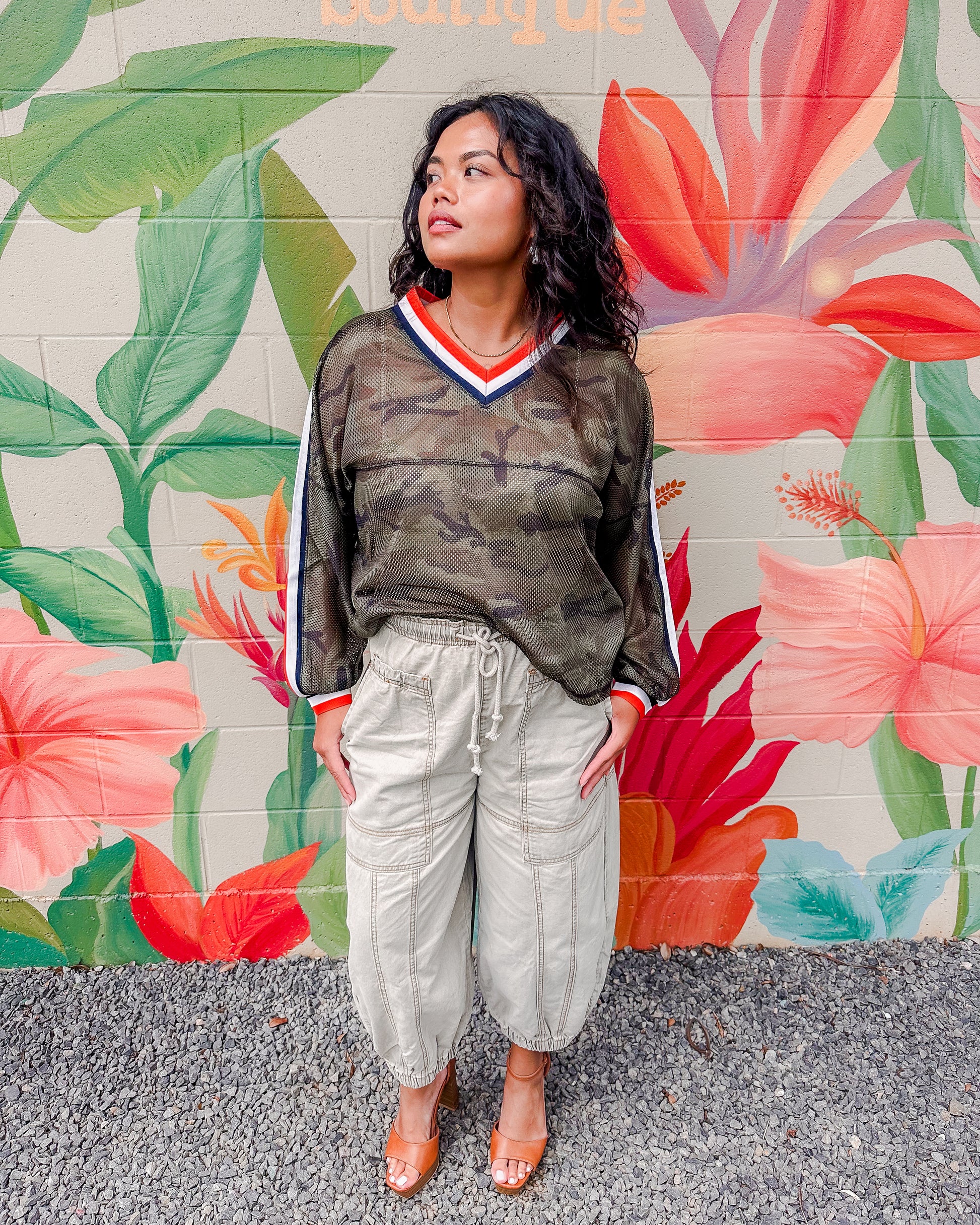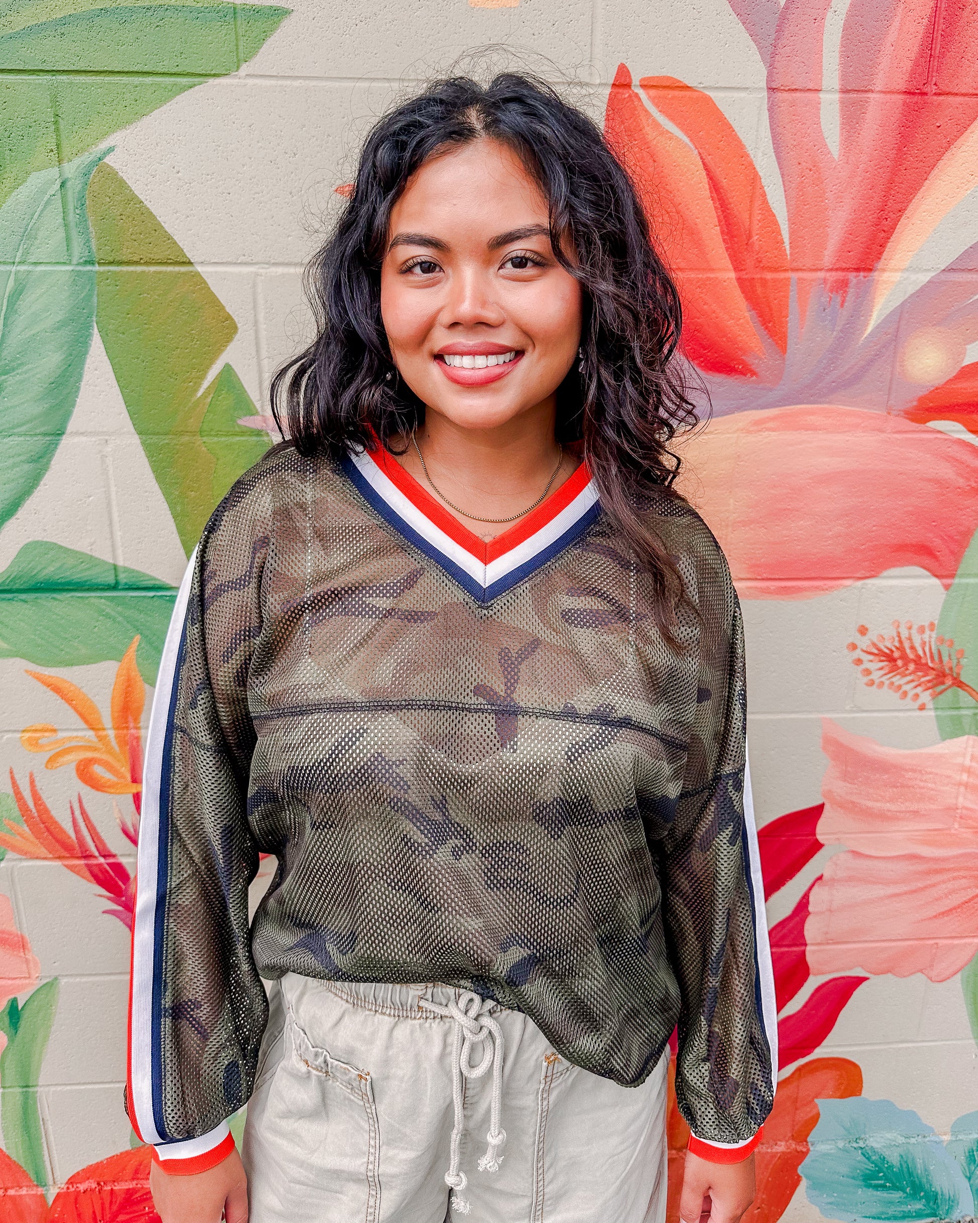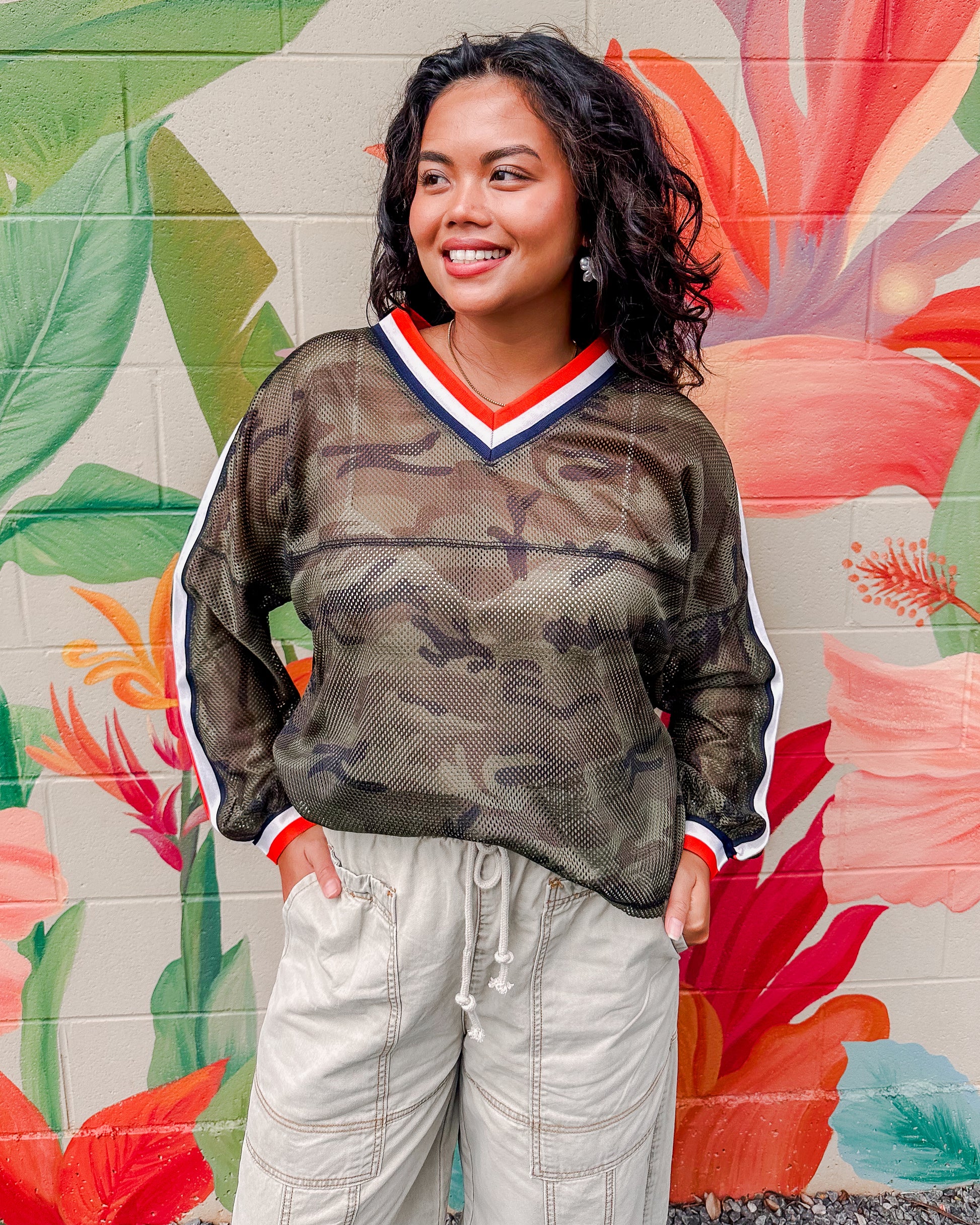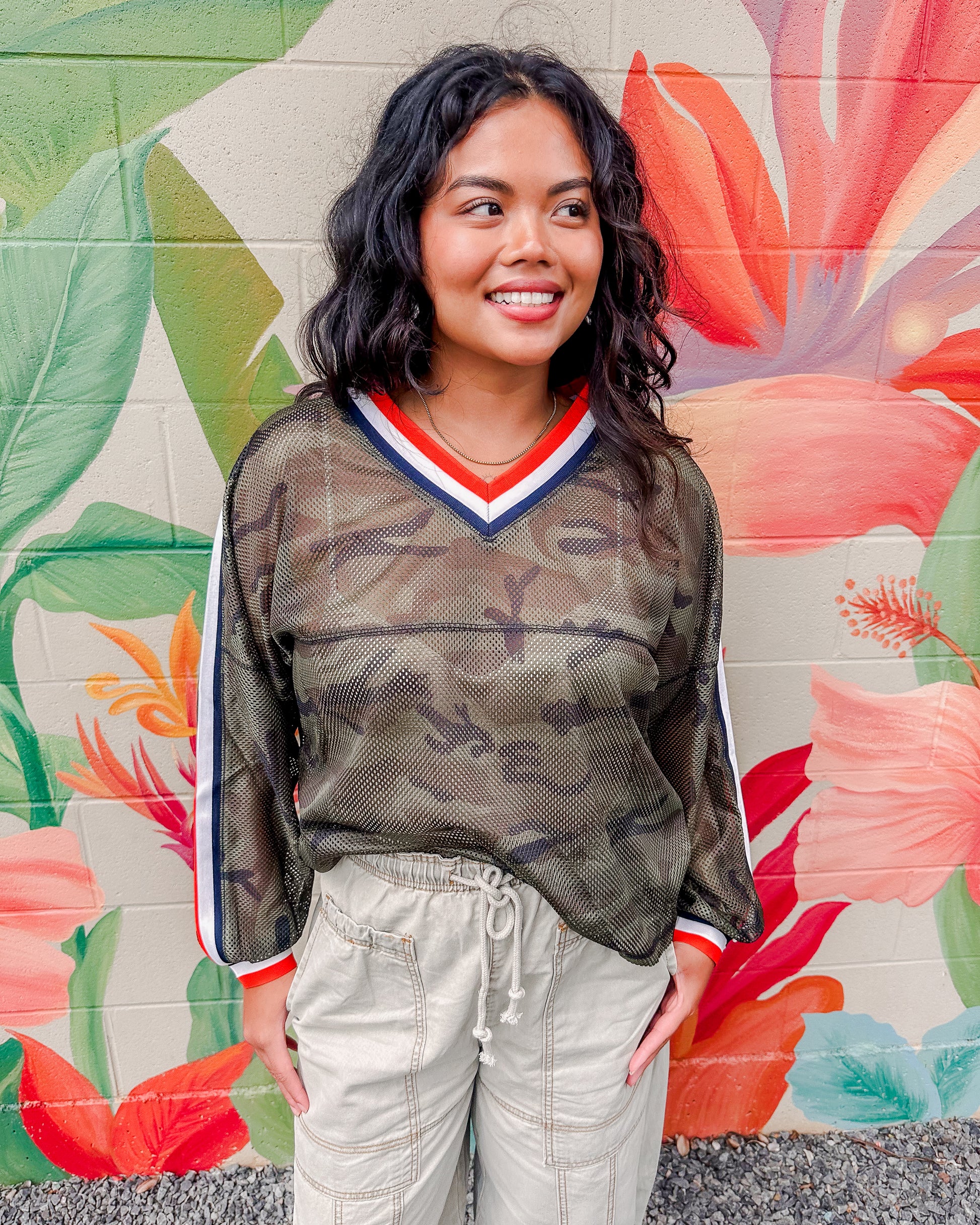 The Laurant Top blends style and comfort with its camouflage mesh design and flattering V-neck cut. Athletic stripe trim along the shoulders and sleeves adds a sporty edge perfect for casual wear or layering. Breathable mesh keeps you cool while the structured details create a polished look.
