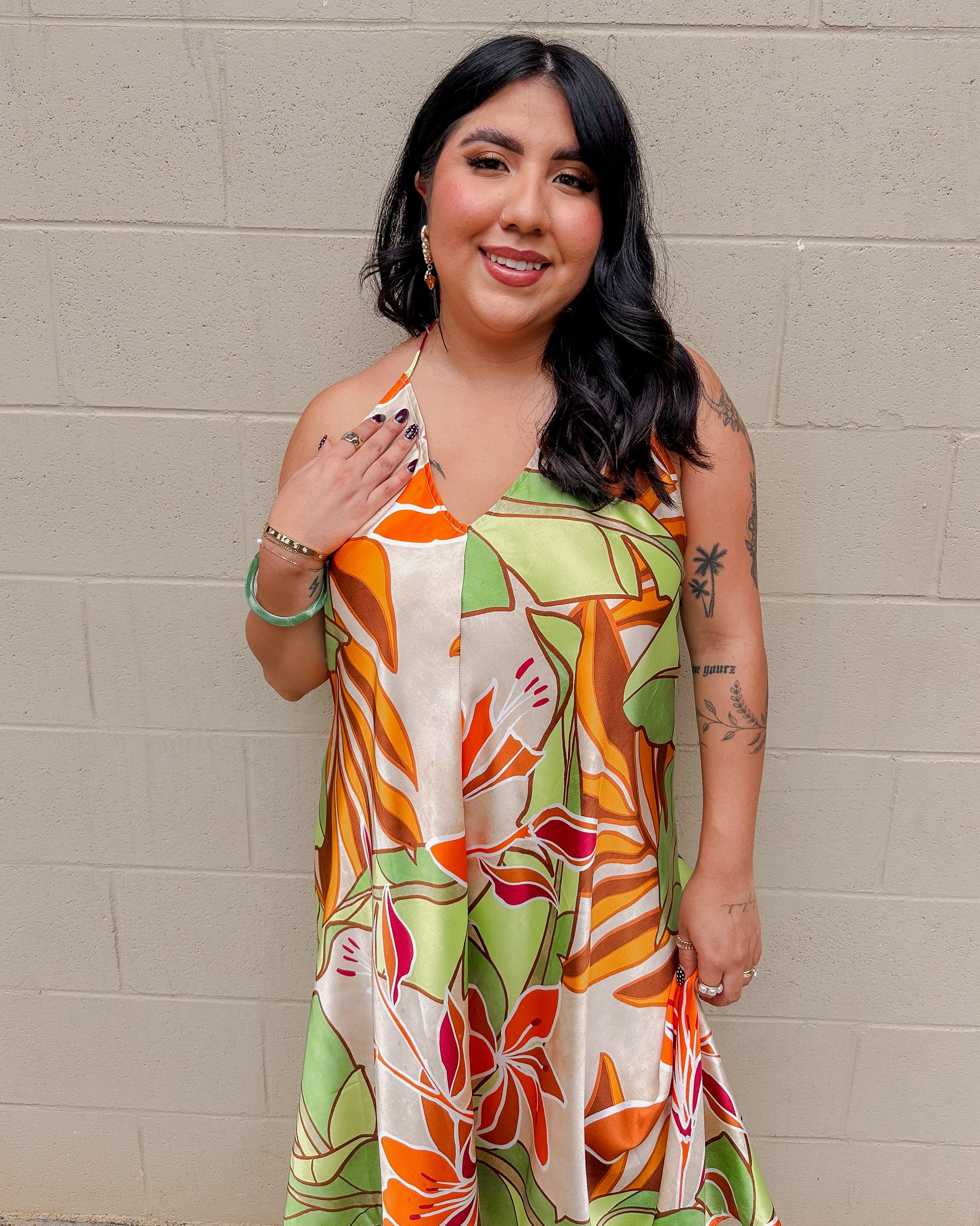 The Lee Dress features a sleeveless, backless halter design with long string ties that allow you to customize your look. Its versatile styling lets you tie it in various ways for a comfortable and elegant fit, perfect for warm days and casual outings.
