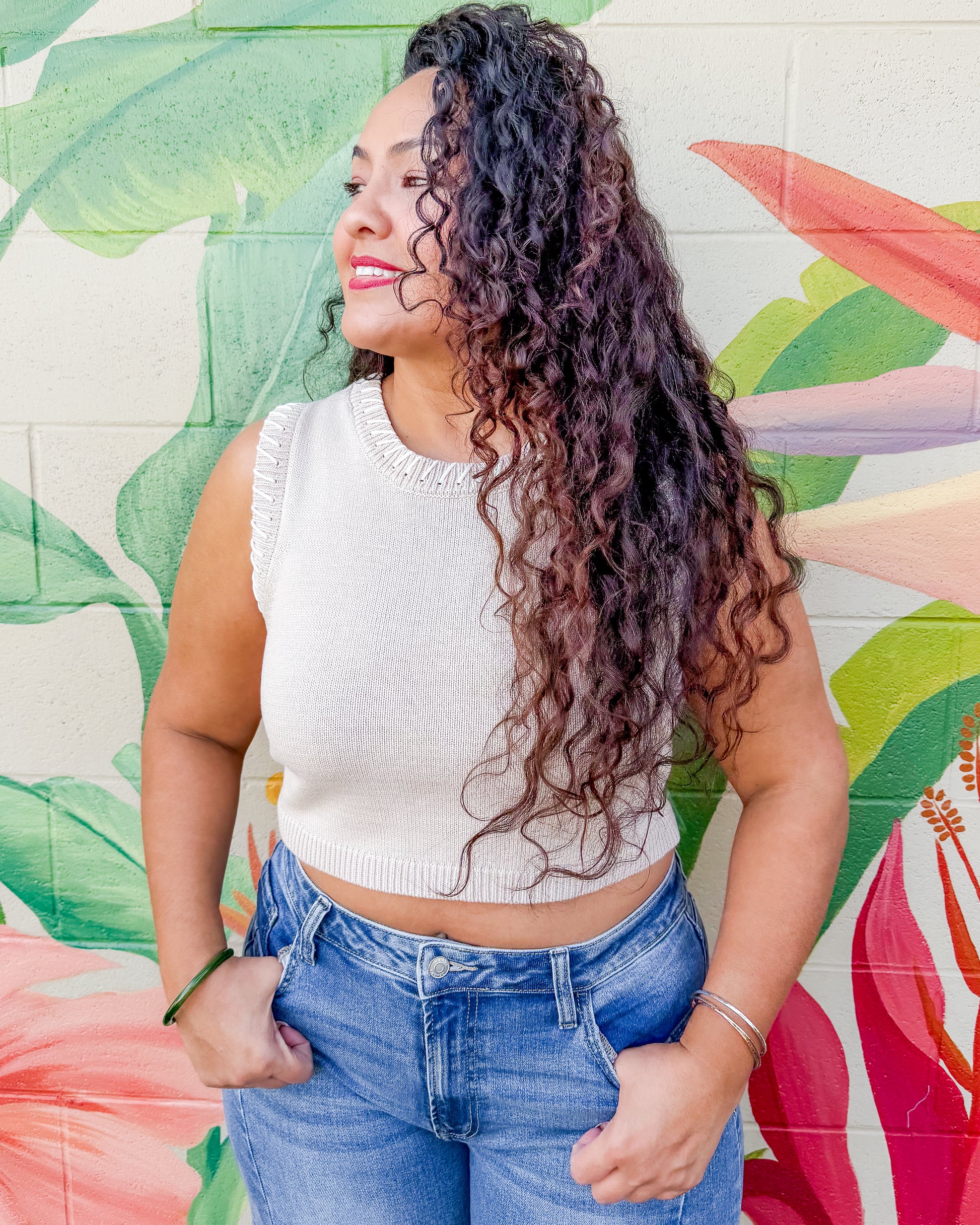 Cropped sweater vest with detailed stitch work and a relaxed fit. Perfect for layering over tees or wearing solo. Crafted in a warm sand tone that pairs effortlessly with any wardrobe. Comfortable, versatile, and timeless.